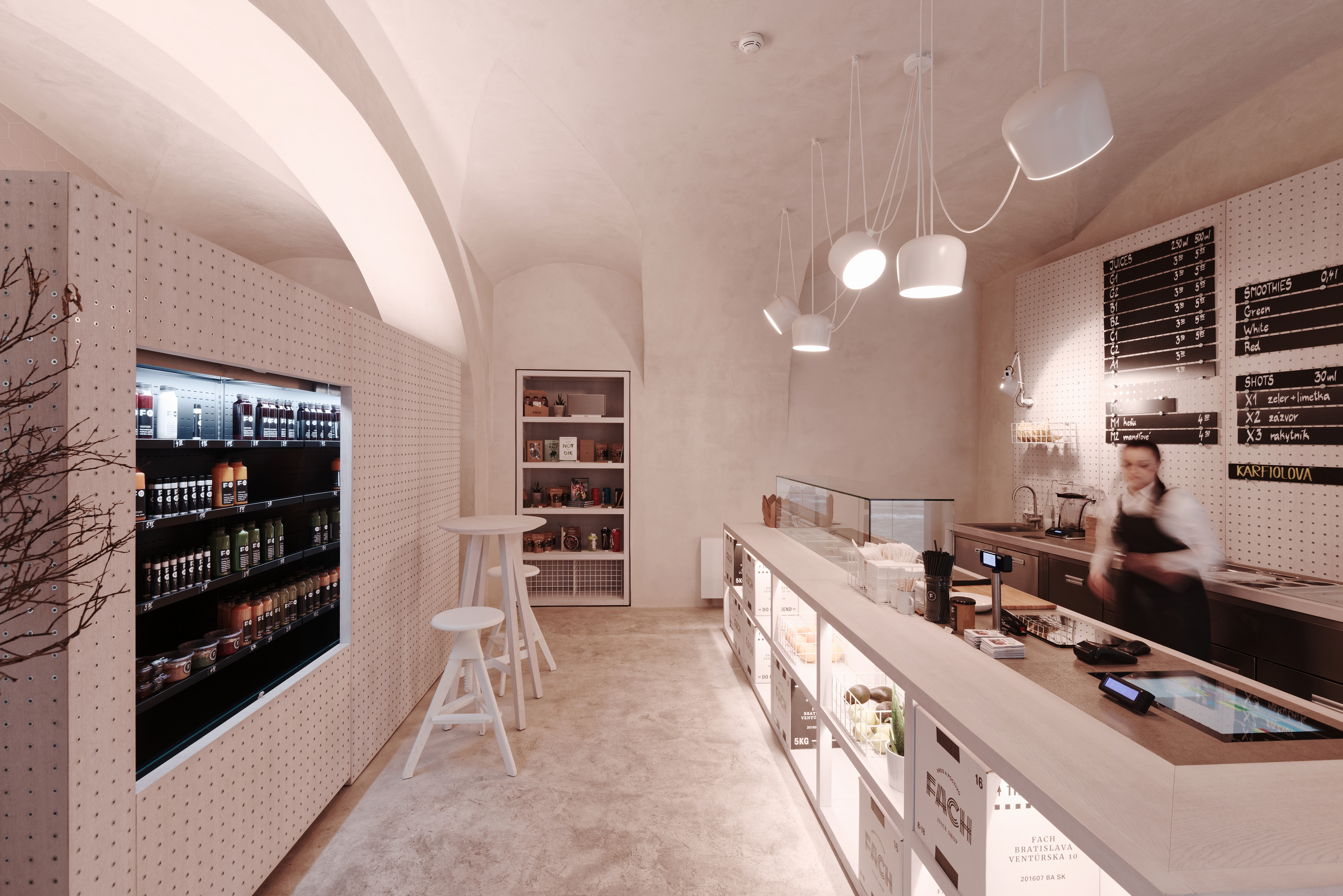 Ako funkčne uplatniteľnú metaforu na Fach, s minimálnym dekoračným efektom sme si zvolili archetyp regálu a dierovanej sololitovej steny na ukladanie a vešanie „vercajchu“. Tieto sú použité predovšetkým v Juice bare a Bread and coffee, v reštaurácii a bare už ostalo len pri regáloch. Charakteristické pre Fach je vysoko postavená latka kvality vo všetkých aspektoch bez žiadnych kompromisov. Preto sa pri vzniku celého Fachu dôraz na detail odrazil nielen pri tvorbe interiéru ale aj v ostatných dielčích riešeniach. Komplexný grafický manuál od loga cez informačný systém až po nálepky únikových svietidiel malo na starosti grafické štúdio Milk, kostýmy pre Fach navrhovalo dizajnové štúdio Buffet a na mieru podľa požiadaviek šéfkuchára sa vyrábal aj riad pre reštauráciu. Vďaka vzácnej zhode názorov architektov, dizajnérov, klienta a šéfa Fachu sa podarilo udržať veľmi čistý a minimalistický koncept až do konca.