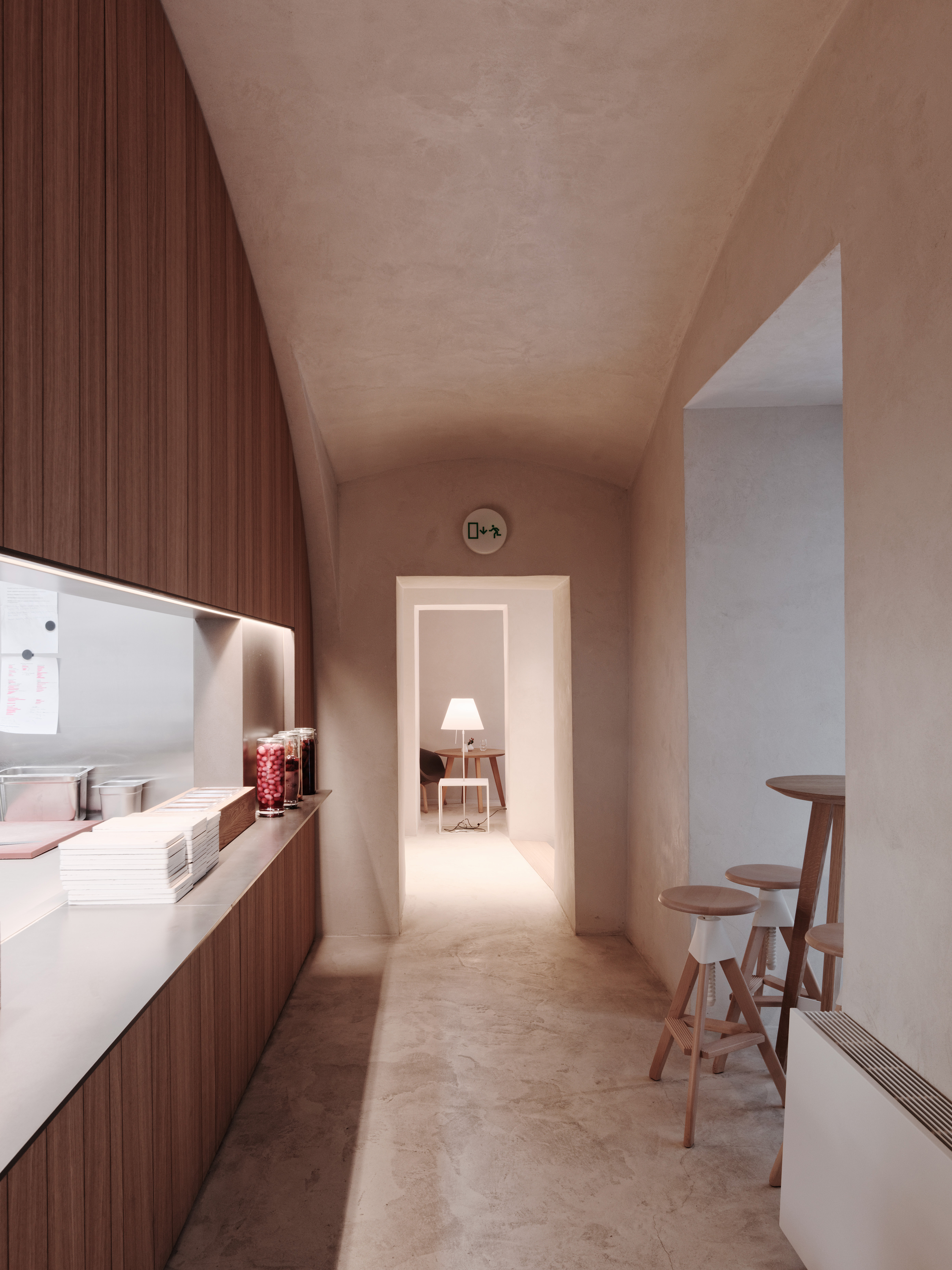 Prízemie objektu postráda akýkoľvek palácový charakter, pozostáva z pôvodných hospodárskych priestorov a stajní, navyše so zachovanými torzami pôvodných gotických a renesančných objektov. Ako spomínaný spoločný menovateľ bolo zvolené jednotné farebné a materiálové riešenie celej stavebnej substancie stavby. Znamenalo to pojednať všetko – podlahy, steny, klenby a strop v jednom povrchu spĺňajúcom požadované estetické aj technické kritériá. Zvolená bola stierka s charakterom typickej šúchanej stredovekej omietky. Taká, aká tu možno kedysi naozaj bola.