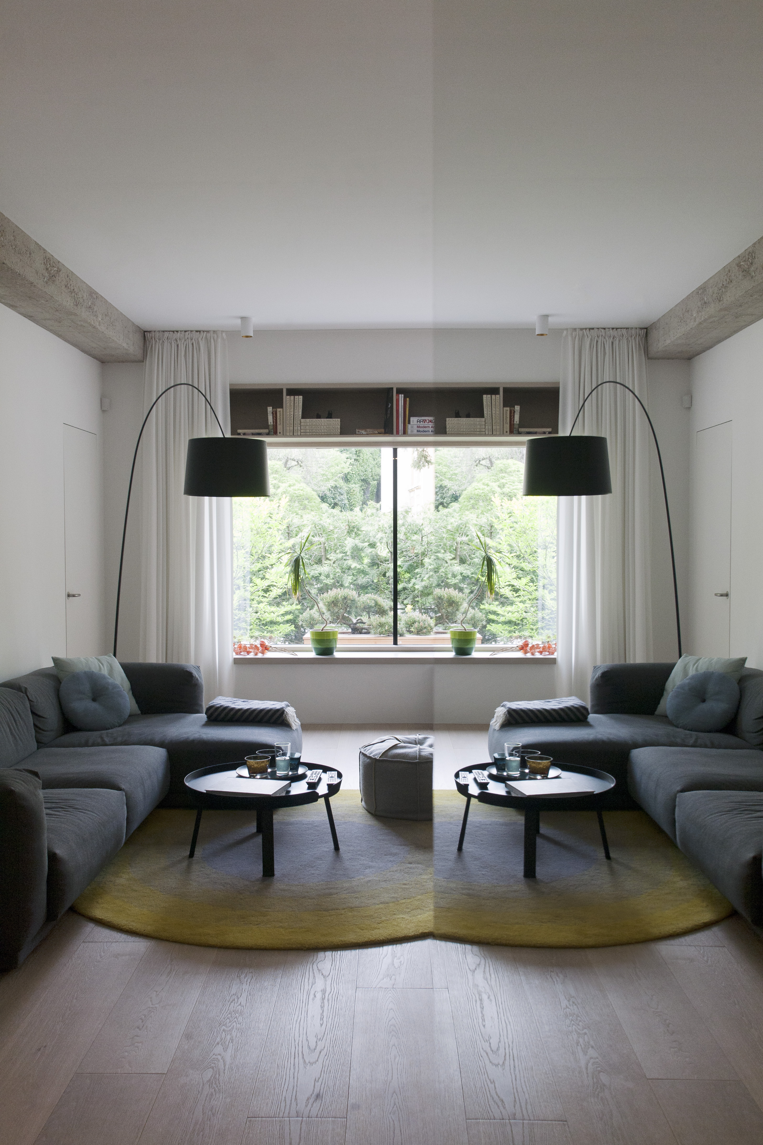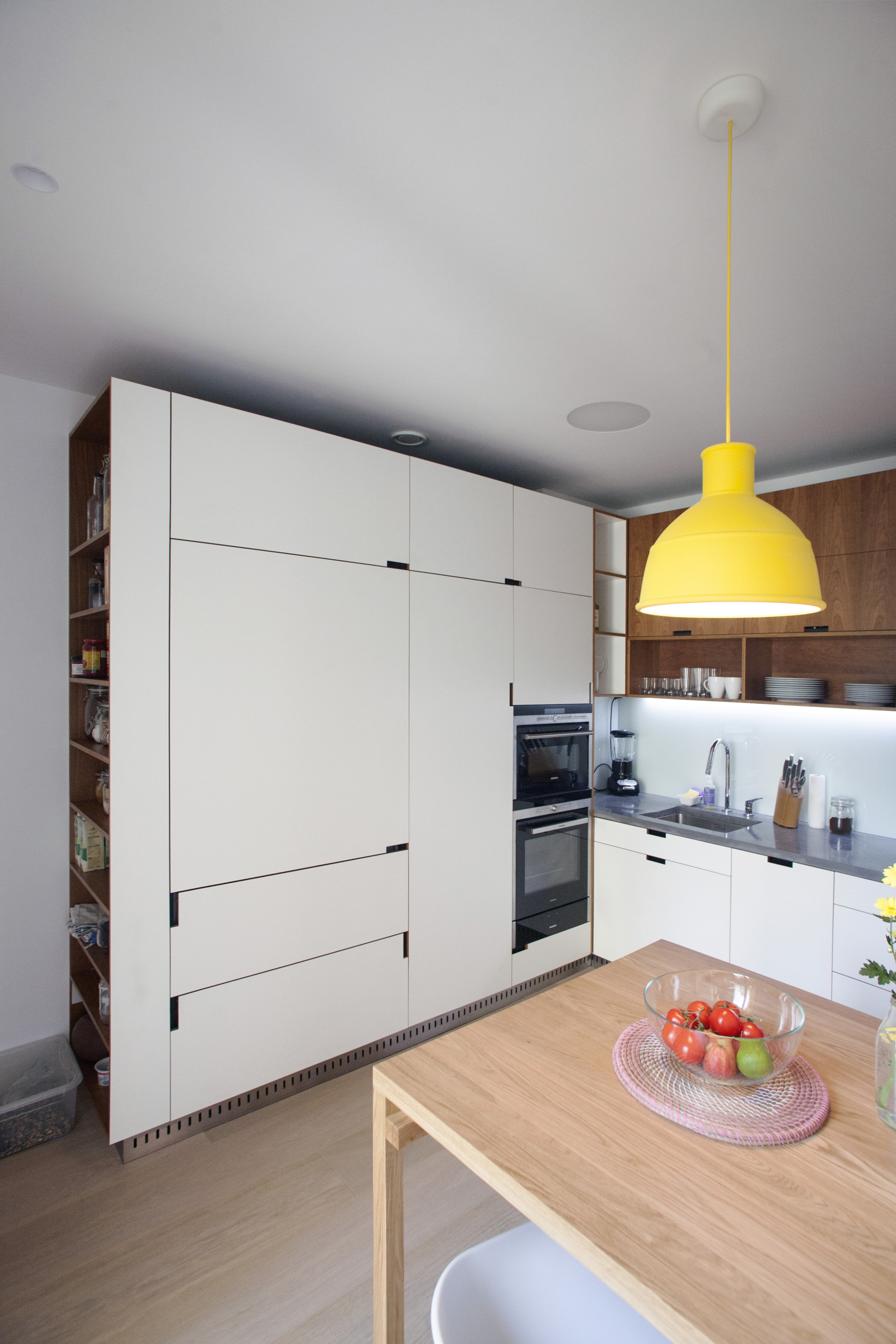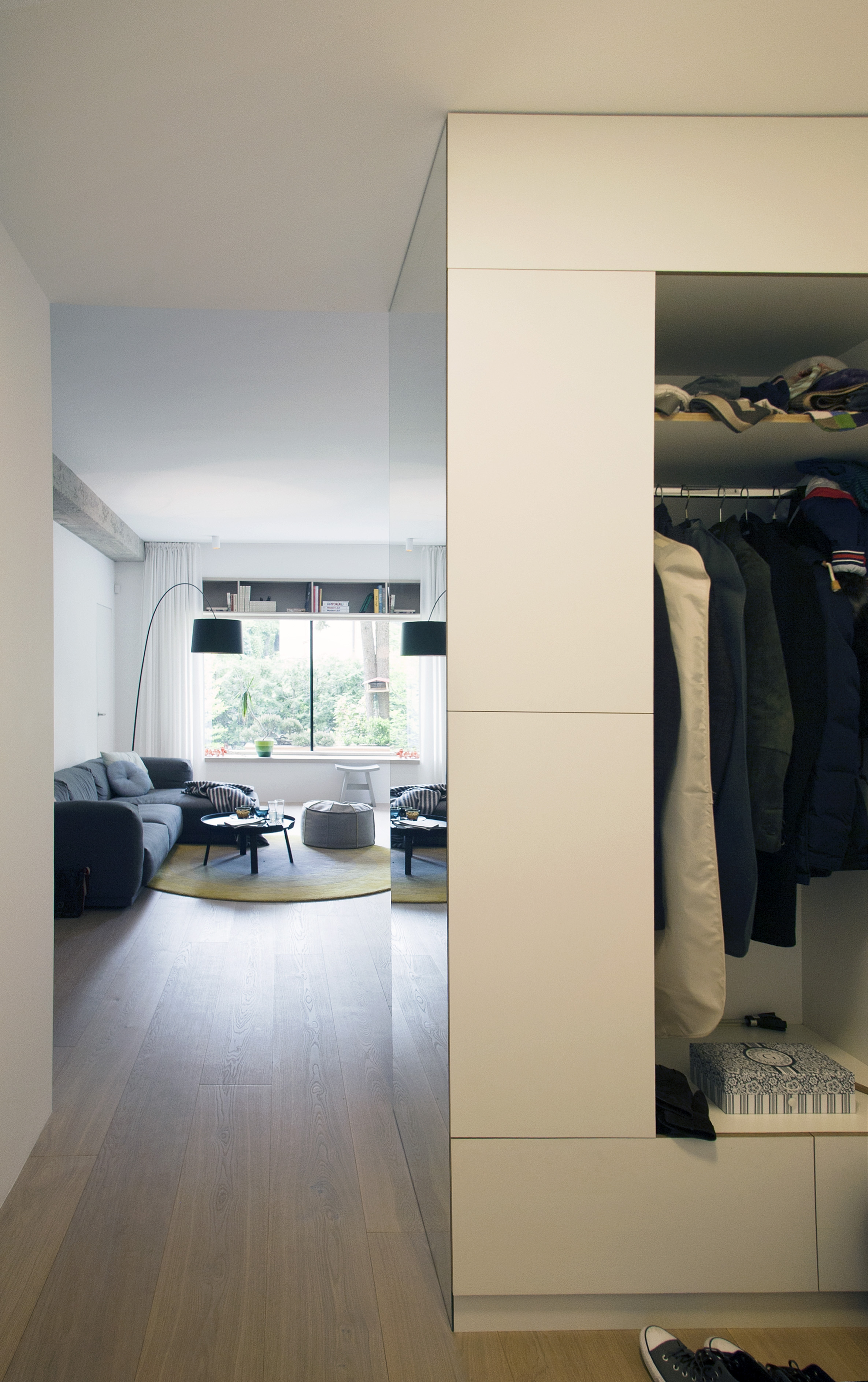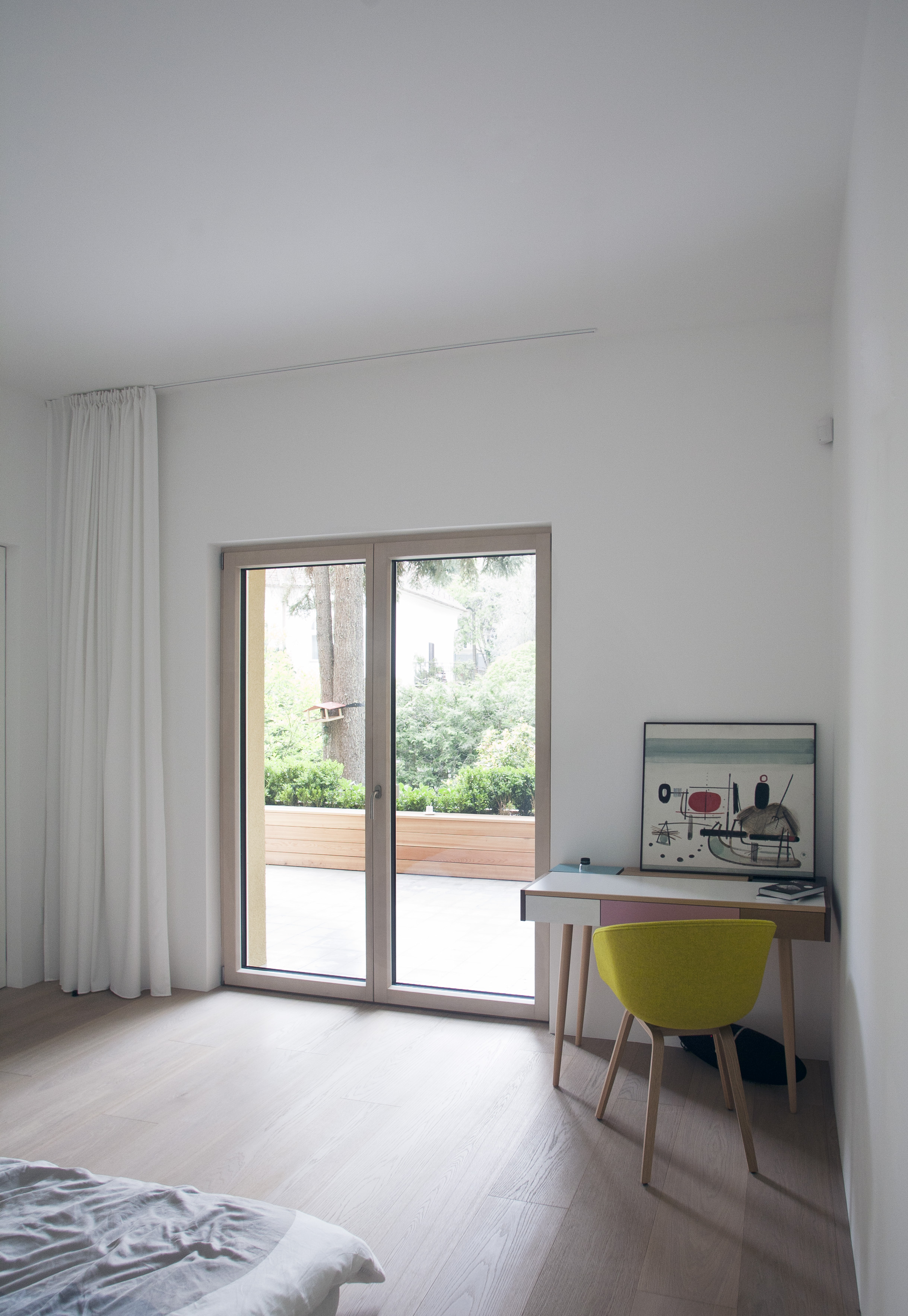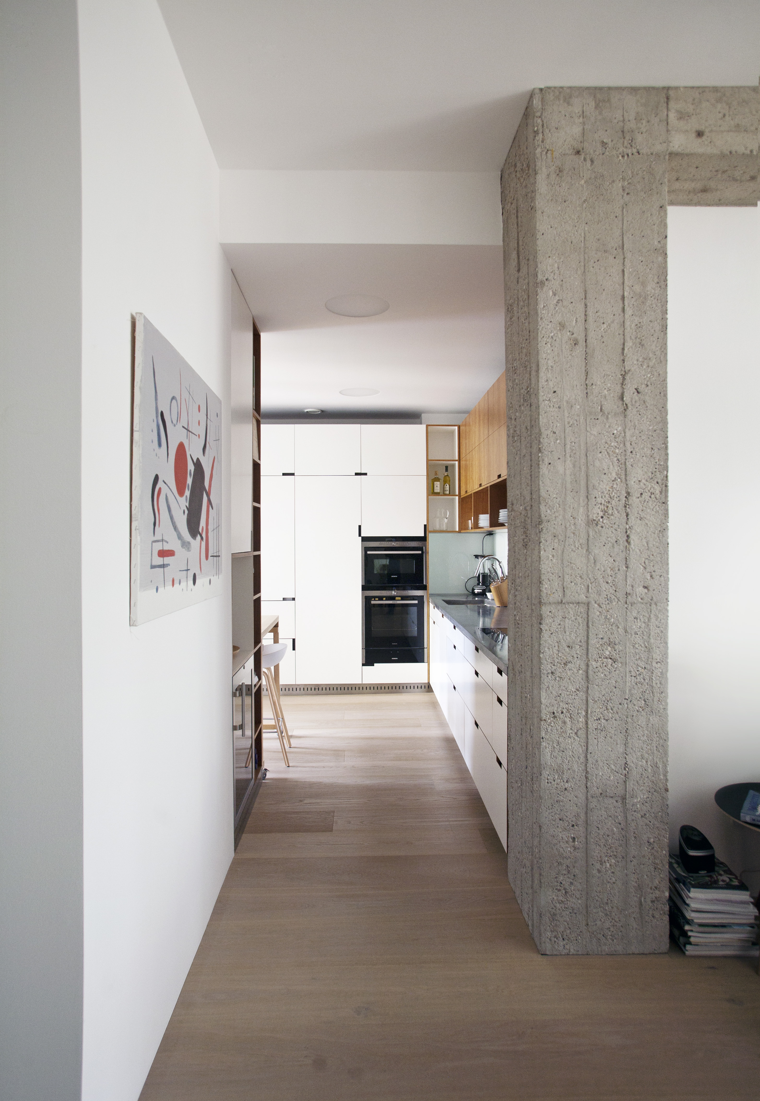 Priznané betónové steny, podlahy z prírodného bieleného dubu a biele steny vytvárajú neutrálnu farebnú kulisu a umožňujú vyniknúť vstavanému čerešňovému nábytku. Biele omietnuté steny sú tiež podkladom pre narastajúcu zbierku obrazov. Precízne riešenie interiéru podčiarkujú detaily - čisté styky podlahy a stien, integrované úložné priestory, nábytok bez vystupujúcich madiel...