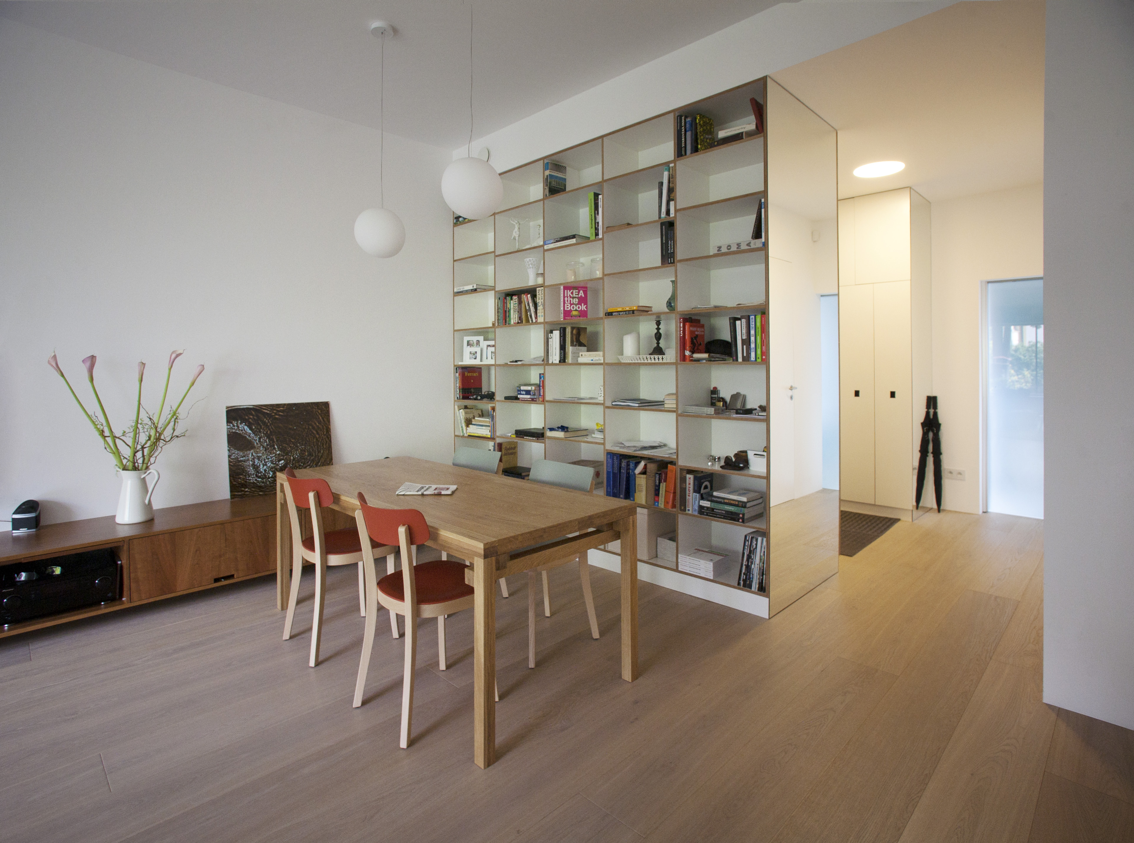 Vstupy do dispozície boli len minimálne, funkčné členenie bytu ostalo zachované. Obývačka je centrom diana a križovatkou, z ktorej sa vstupuje do všetkých ostatných miestností. K sprehľadneniu prevádzky prispela zmena umiestnenia vstupných otvorov. Hlavný obytný priestor je orientovaný pozdĺžne od vstupu k záhrade. Najdôležitejším prvkom je panoramatické okno s hlbokým parapetom, ktoré slúži ako pobytové a oddychové miesto. Spálne sú situované po oboch stranách obývačky. Prechod z obývacej izby do kuchyne je otvorený. Na kuchyňu nadväzuje studená špajza, technická miestnosť a hospodársky balkón.