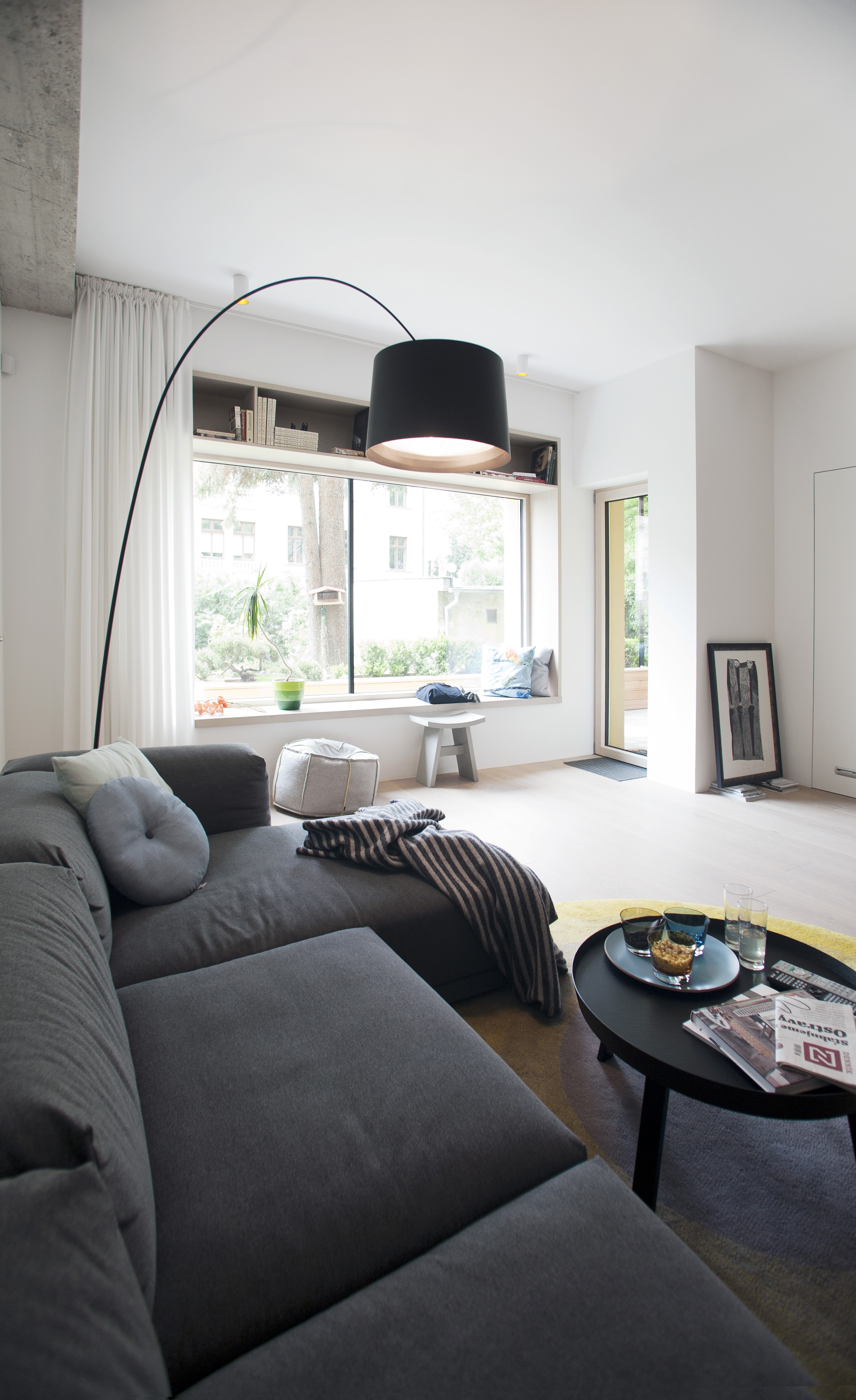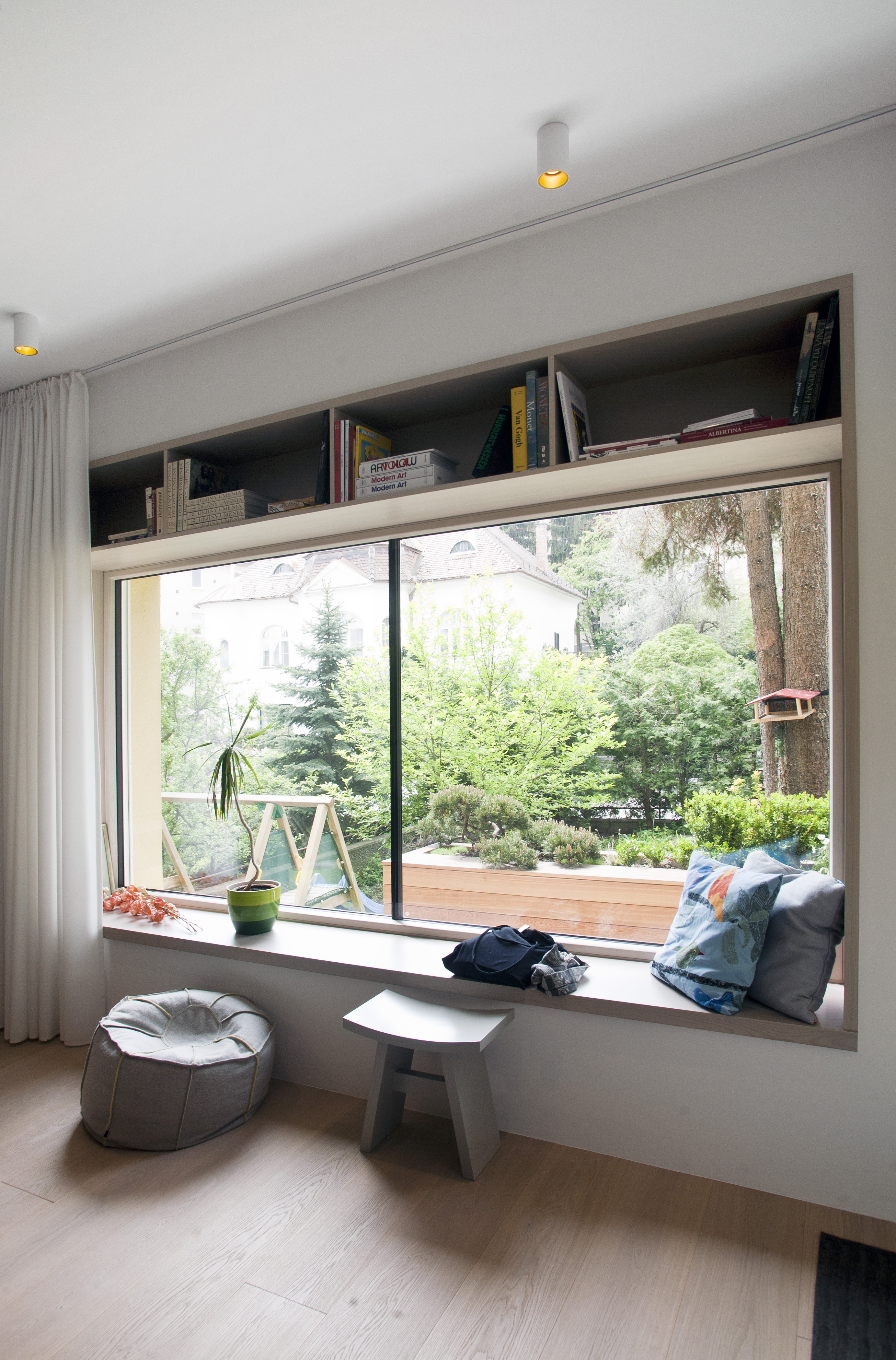 Dominantným prvkom v obývacej izbe aj v celom interiéri je panoramatické okno s výhľadom do zelene. Sedenie na širokom parapete je doplnené o malú knižnicu.