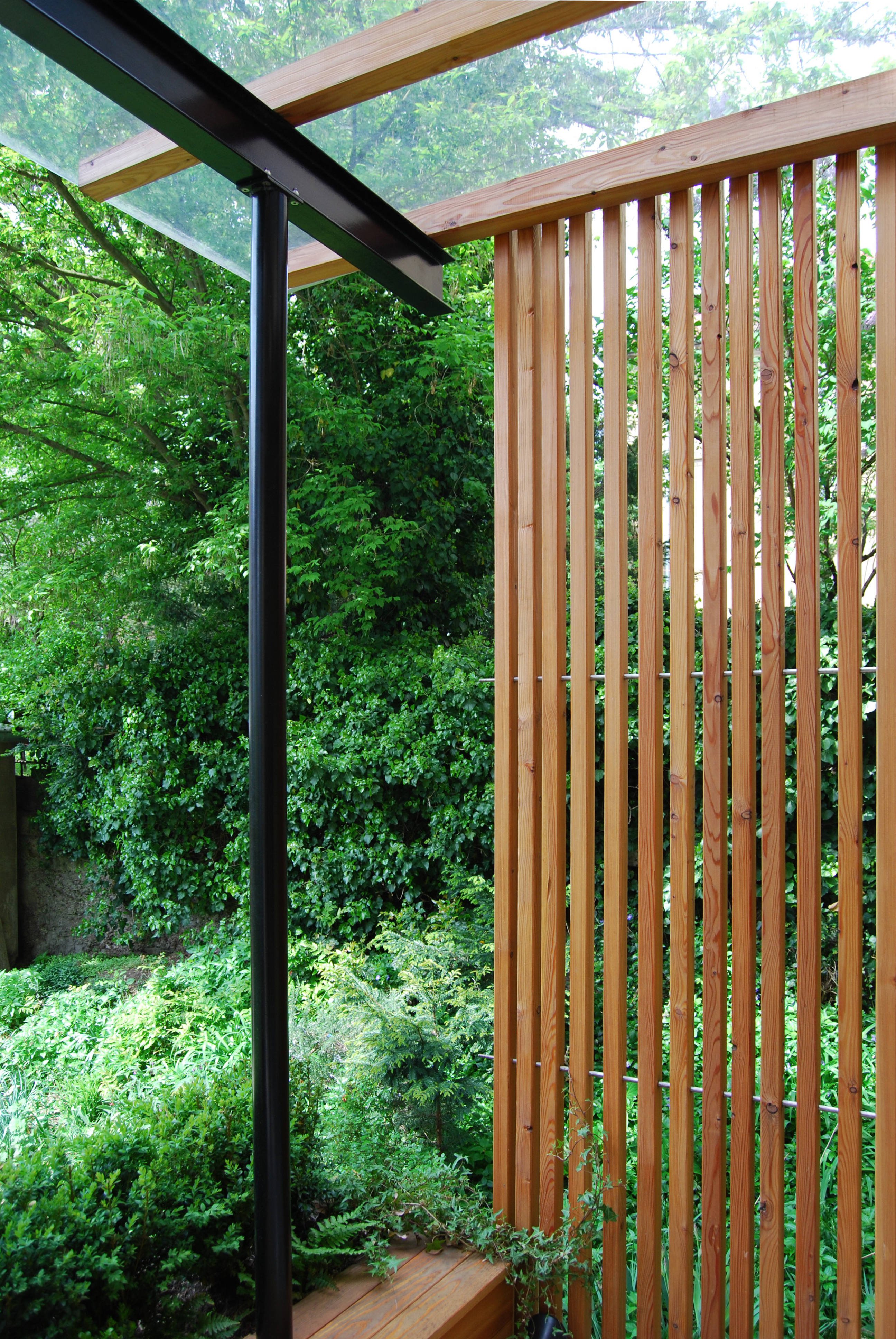 Poloha bytu na prízemí umožňuje prechod do uzavretej záhrady. Vyvýšená terasa je čiastočne krytá lamelovým paravánom.