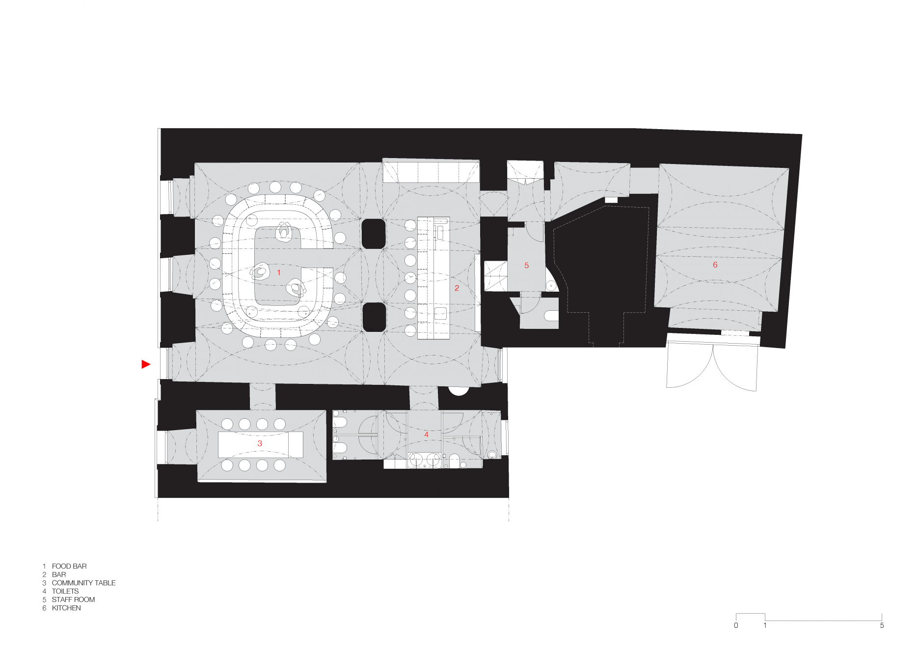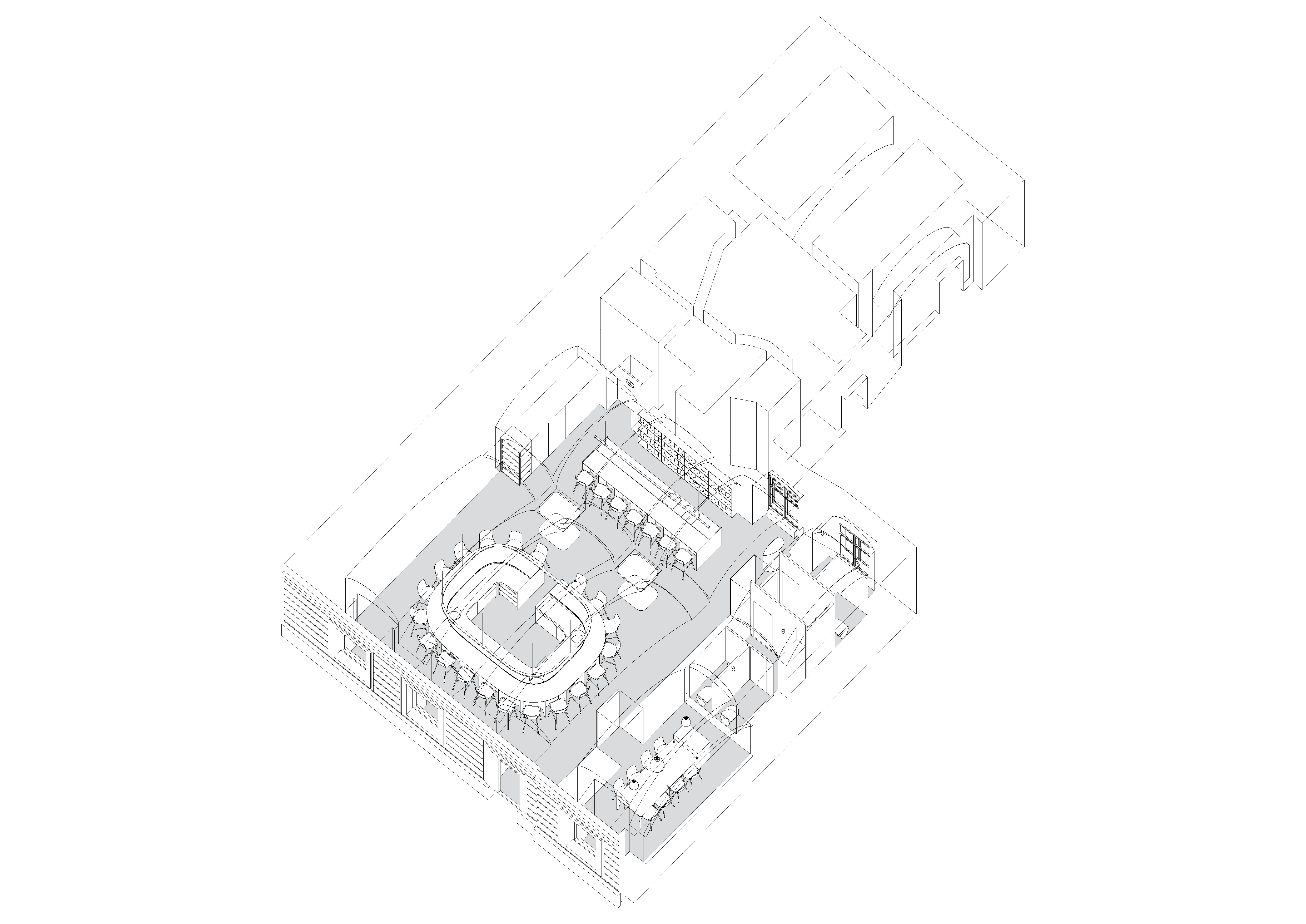 Interiér sa stal súčasťou pešej zóny na Hviezdoslavovom námestí v Bratislave. Food bar zaberá plochu 140 m2 a je rozdelený na rôzne prevádzkové zóny. Vstupuje sa do hlavného odbytového priestoru, dominantou ktorého je oválny bar, v jeho zadnej časti je nápojový bar, po pravej strane od vstupu je oddelený priestor “komunitného stola”. Hlbšie v dispozícii sa nachádzajú toalety.