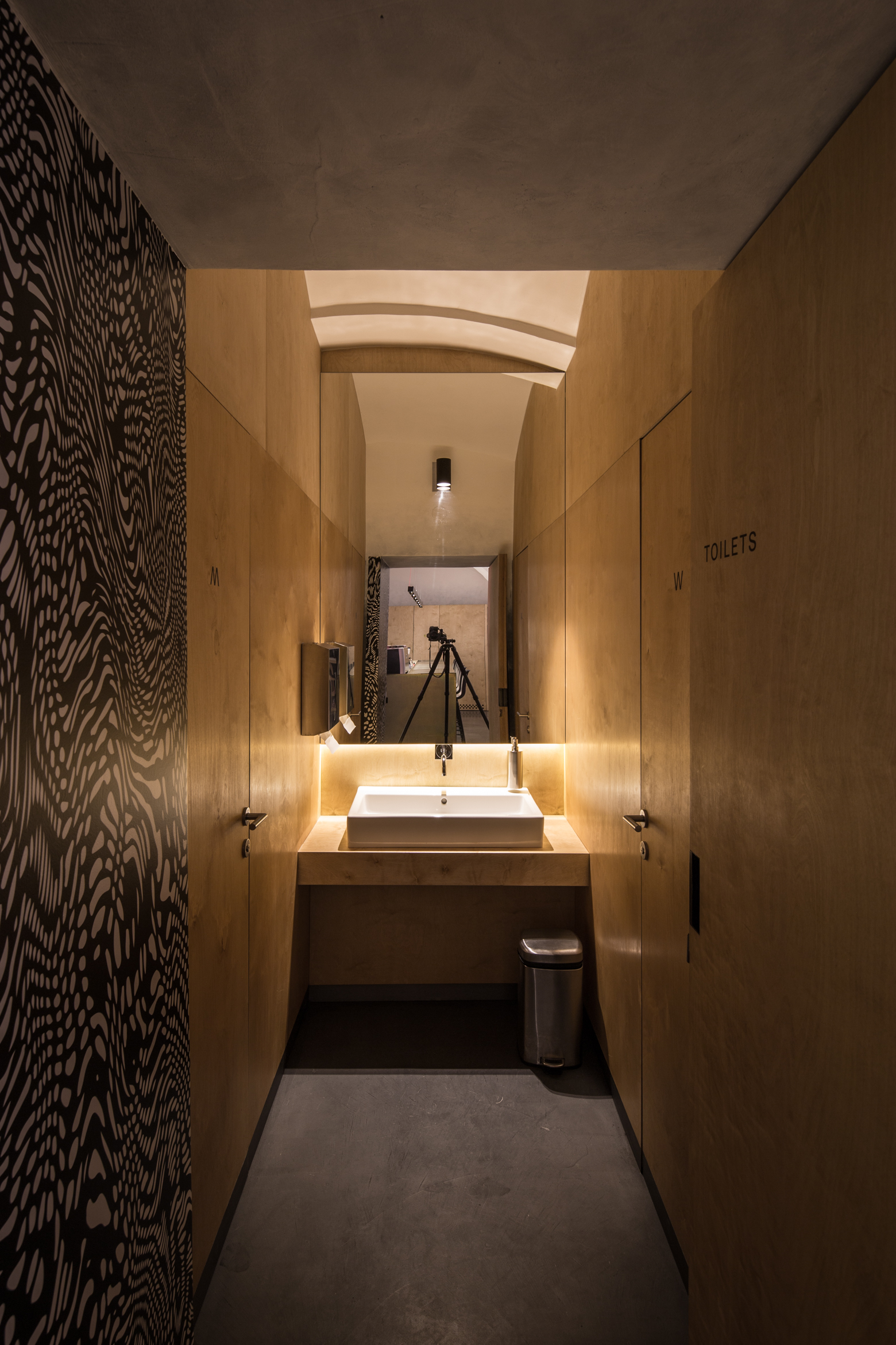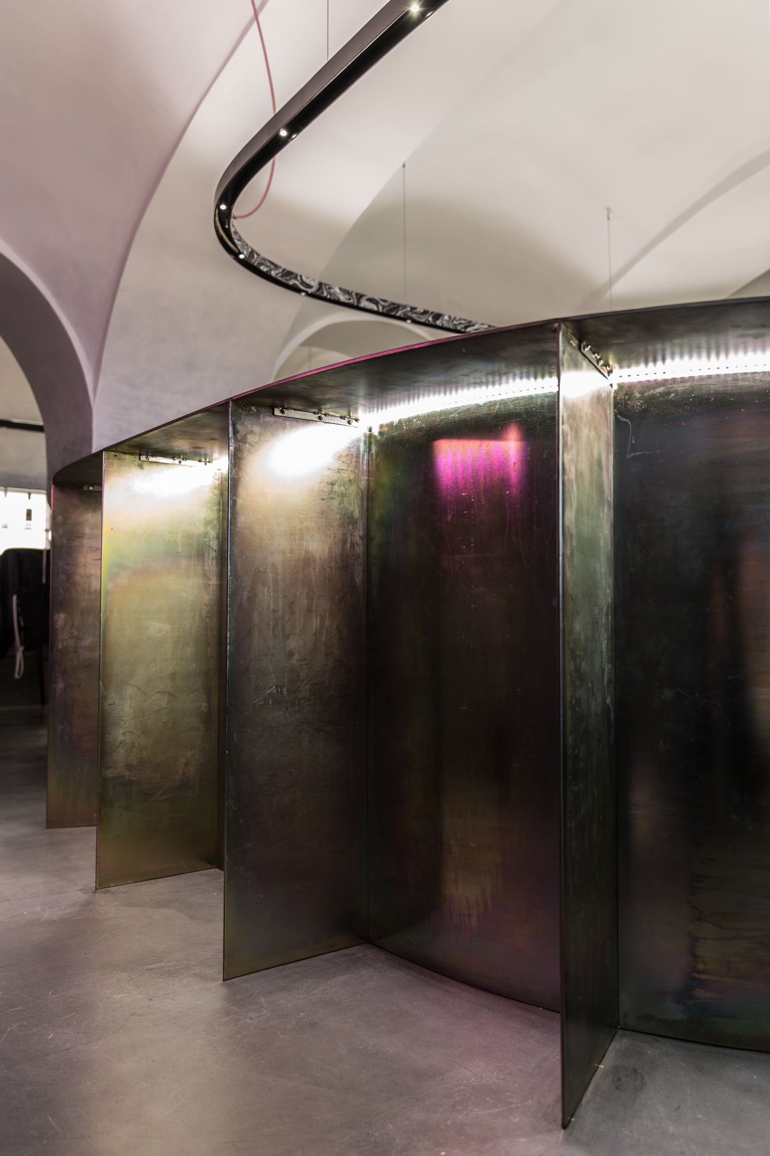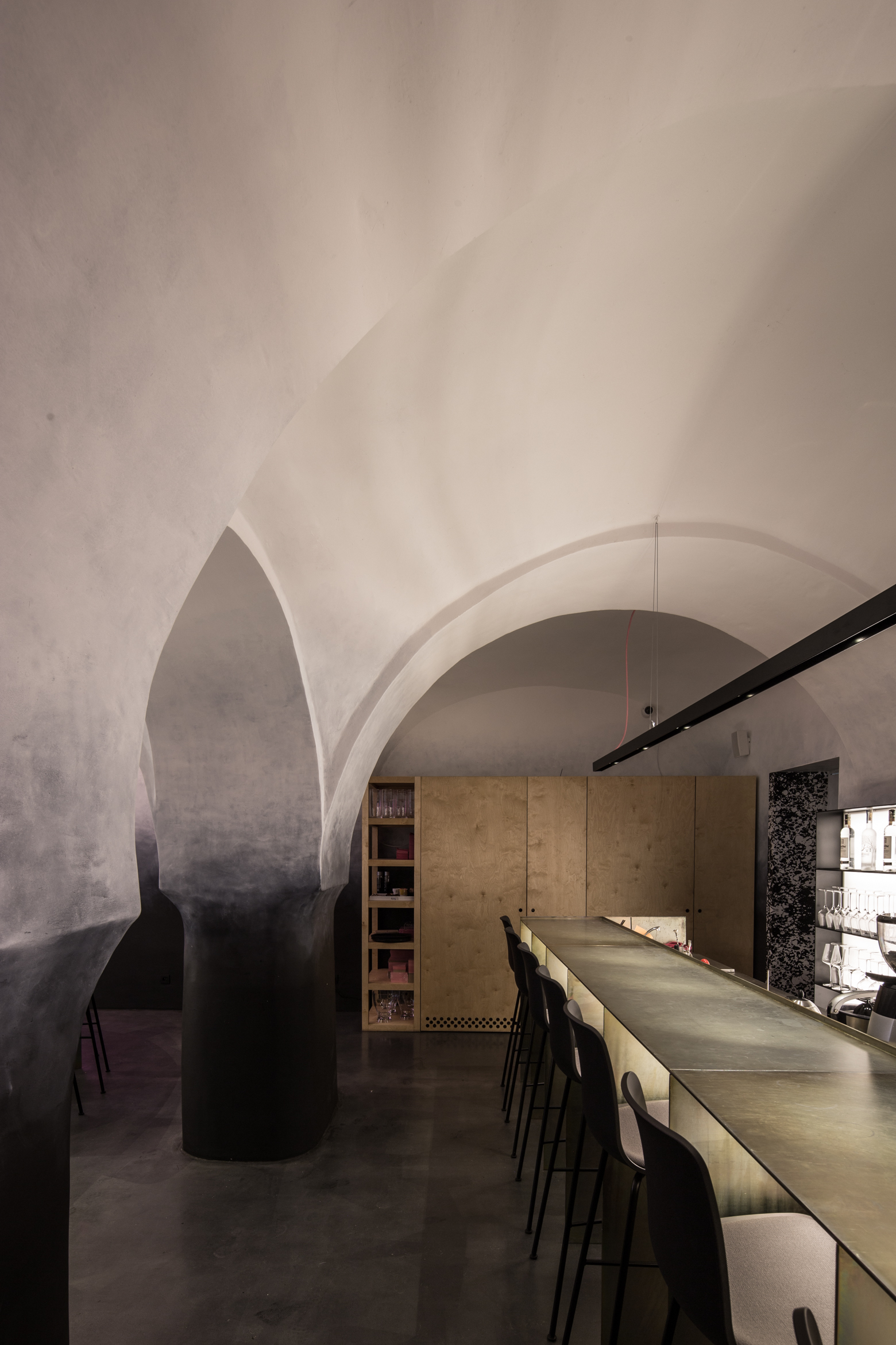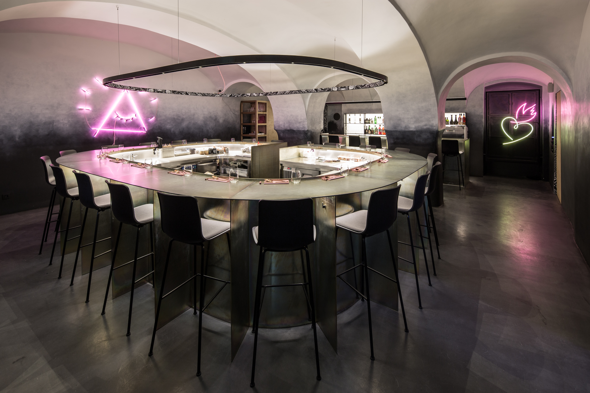 V historickom palácovom priestore prevláda neutrálna farebnosť. Podlaha, steny a klenby sú “zliate” do jedného celku prechodom od čierno-antracitovej až po bielu. Výraznejšiu farebnosť prinášajú dva oceľové barové pulty, povrchovo upravené žltým zinkovaním s dúhovým efektom a svietiace neónové znaky, autorské diela grafického štúdia Milk.