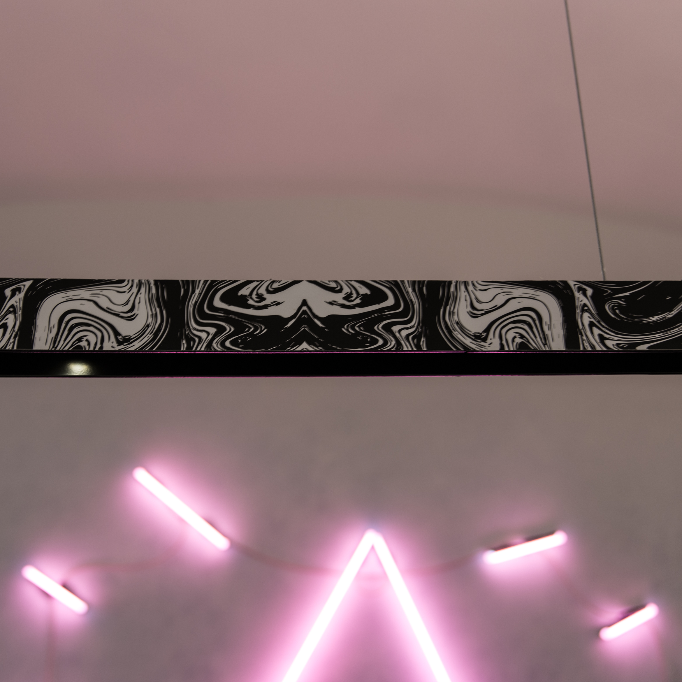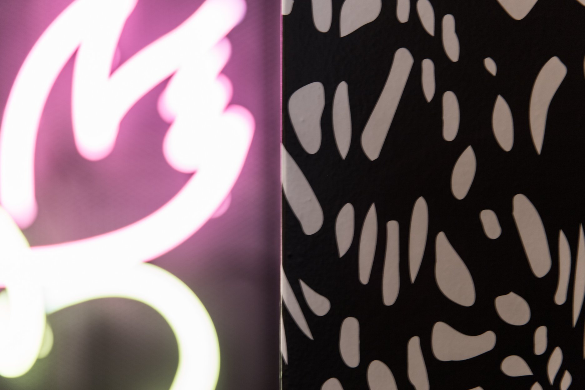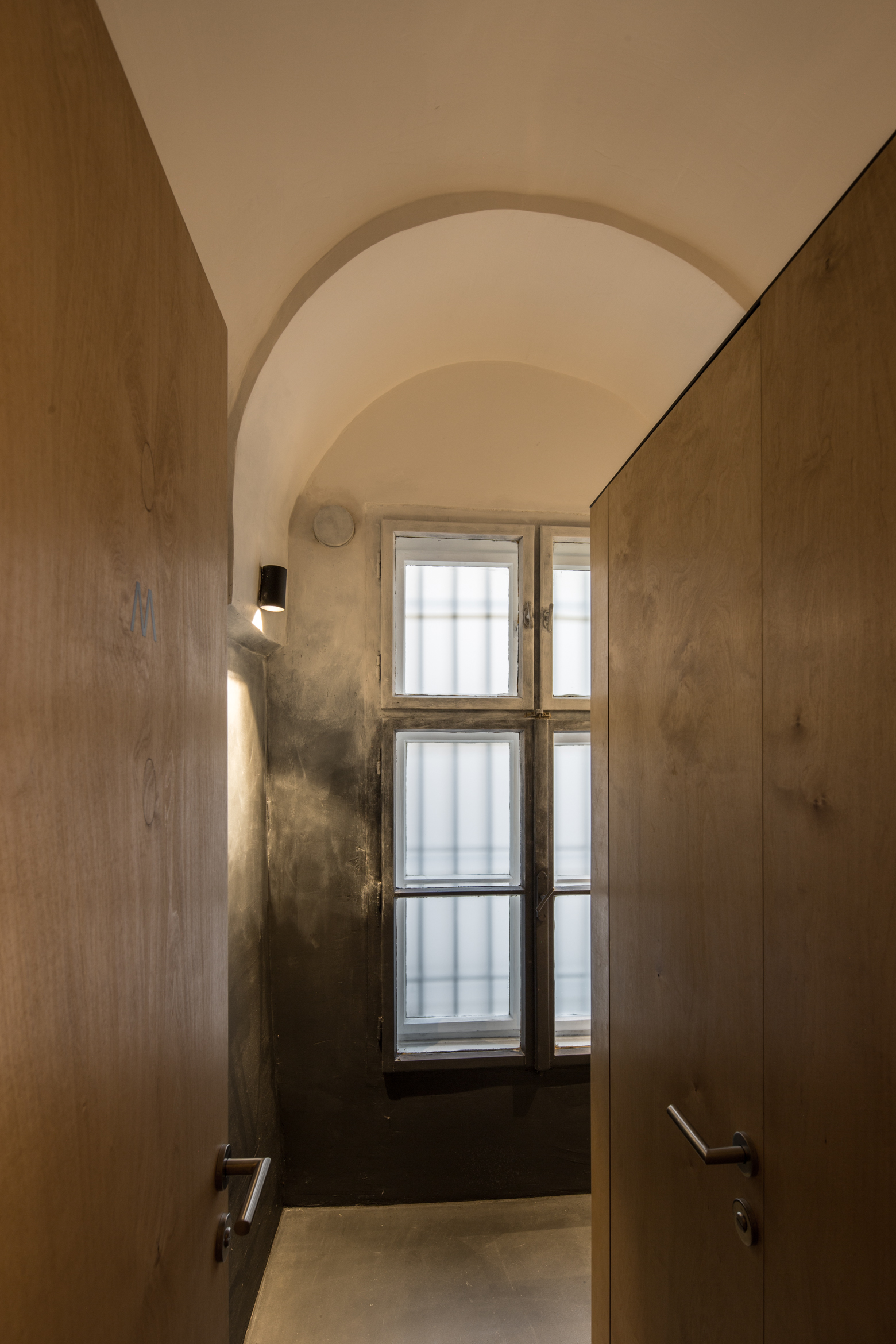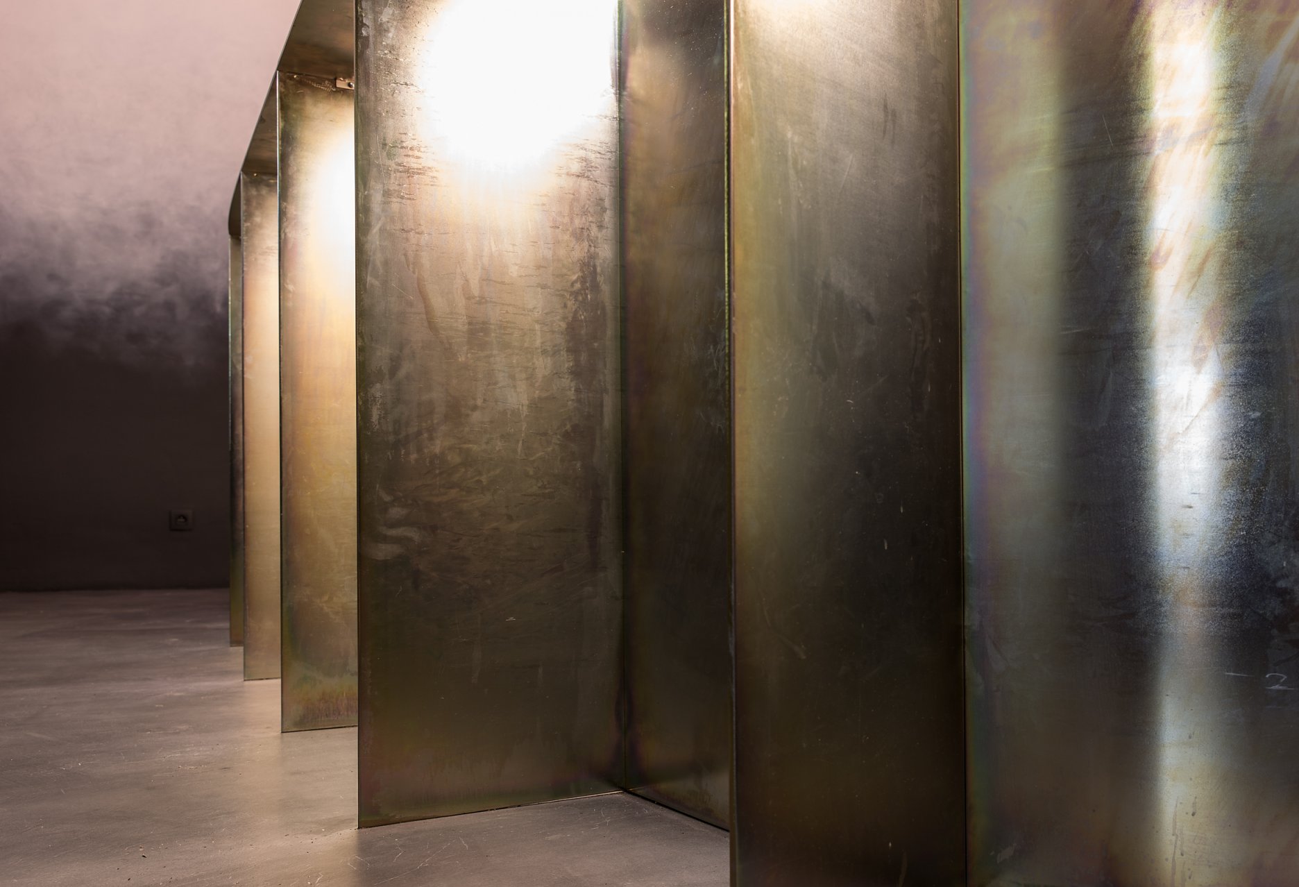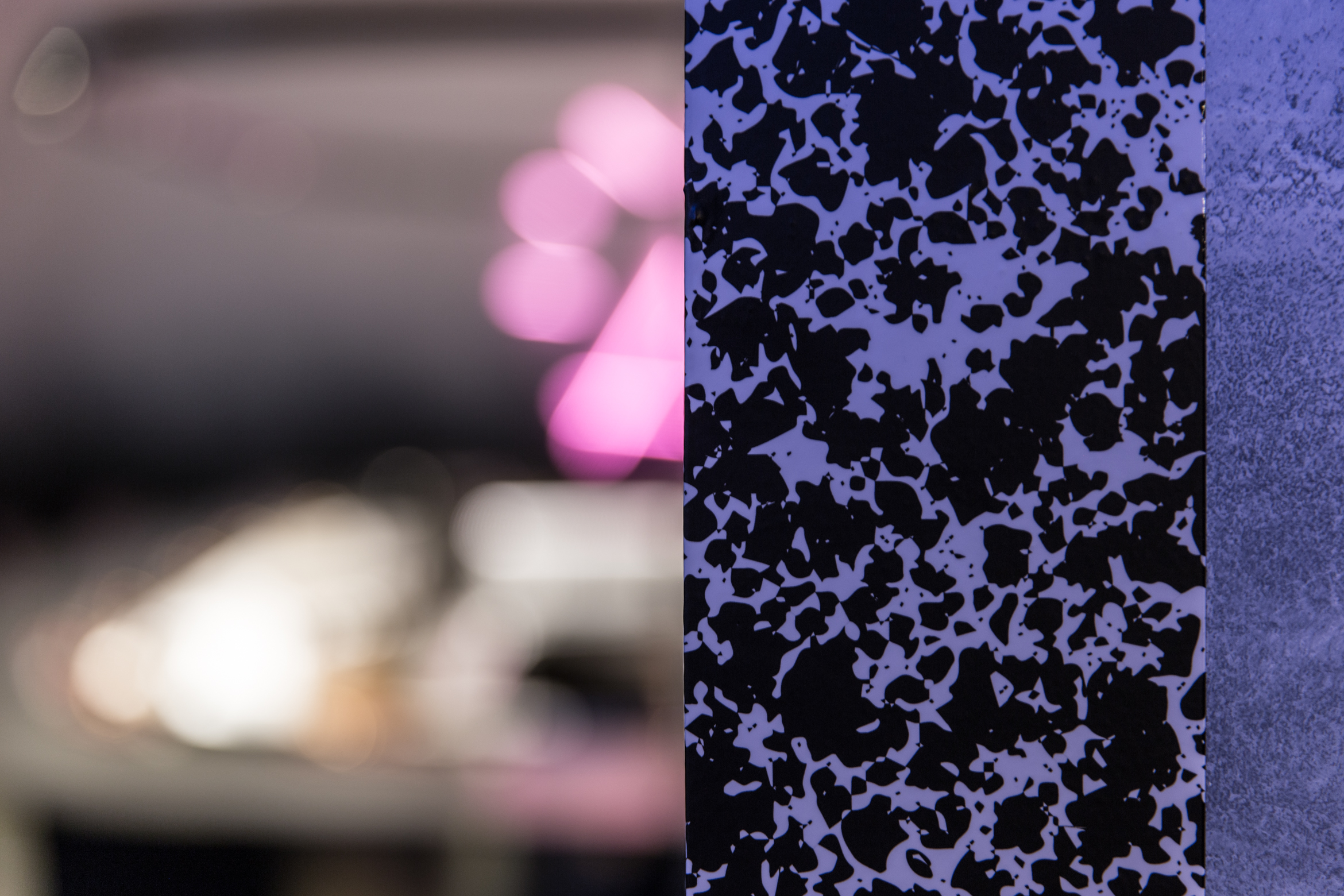 V historickom palácovom priestore prevláda neutrálna farebnosť. Podlaha, steny a klenby sú “zliate” do jedného celku prechodom od čierno-antracitovej až po bielu. Výraznejšiu farebnosť prinášajú dva oceľové barové pulty, povrchovo upravené žltým zinkovaním s dúhovým efektom a svietiace neónové znaky, autorské diela grafického štúdia Milk.