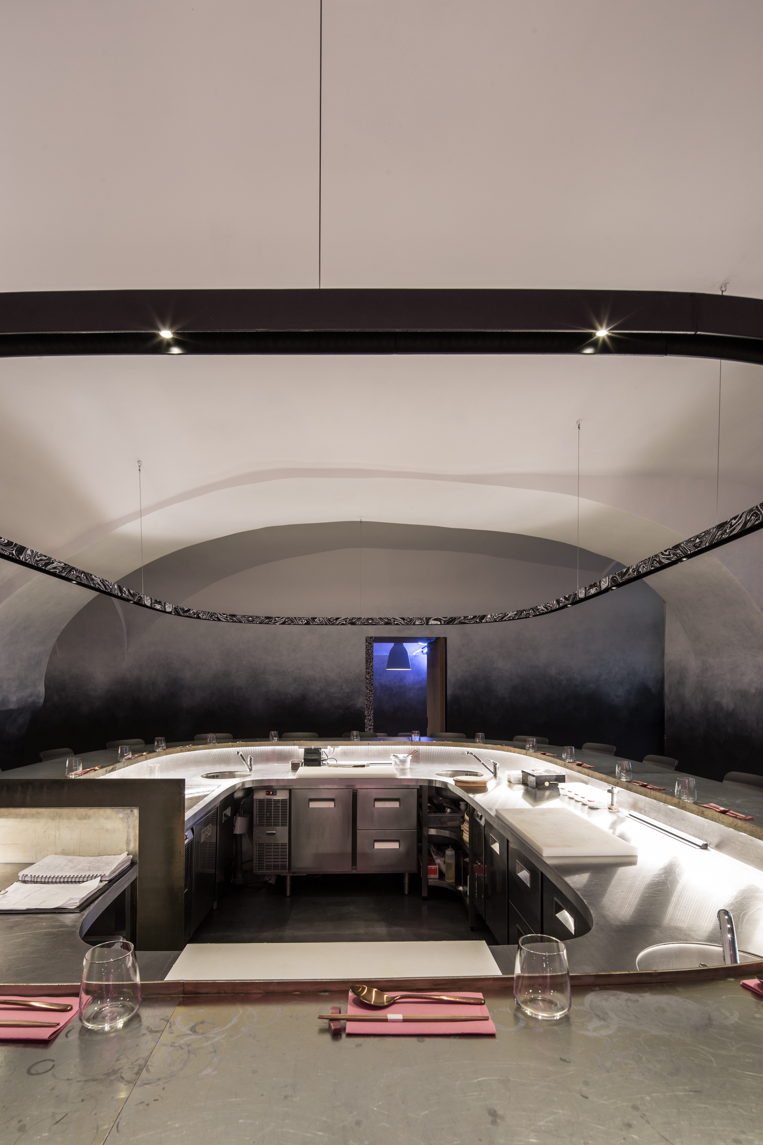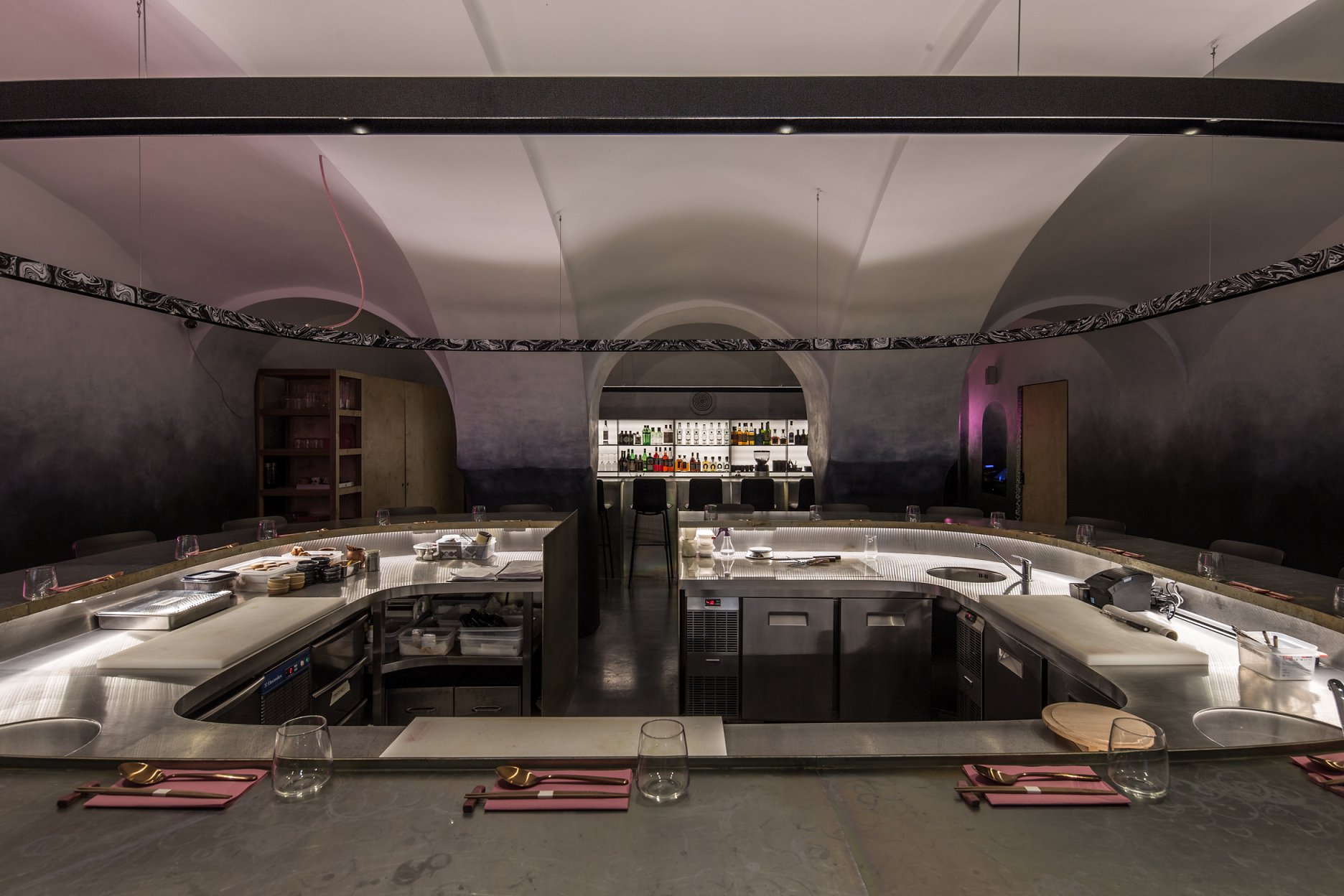 Dominantou v priestore je oválny barový pult. Obklopuje studenú kuchyňu, kde kuchár v priamom prenose pripravuje ázijské špeciality. Celá “show” je dokreslená scénickým osvetlením, zákazník sa stáva jej súčasťou.