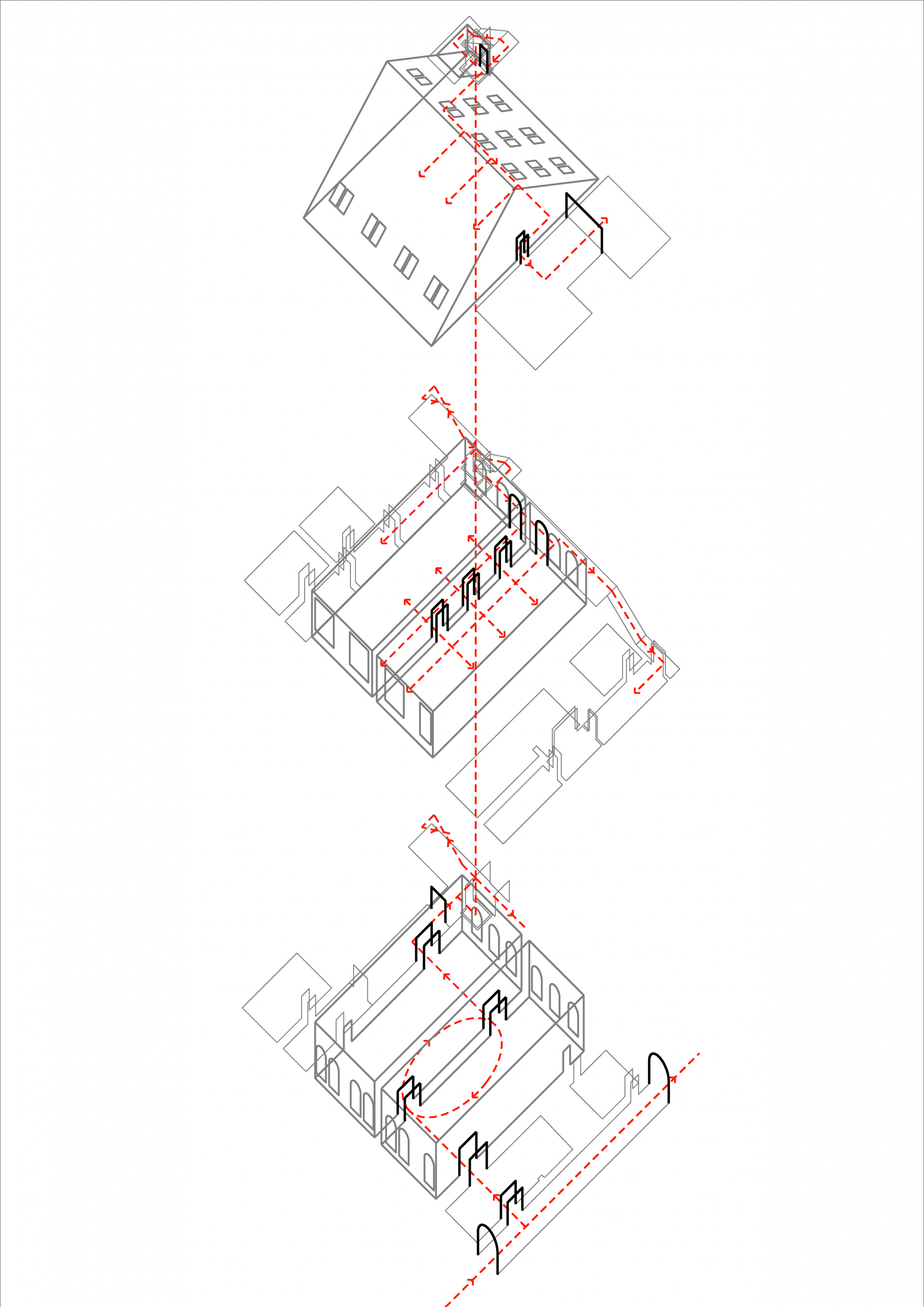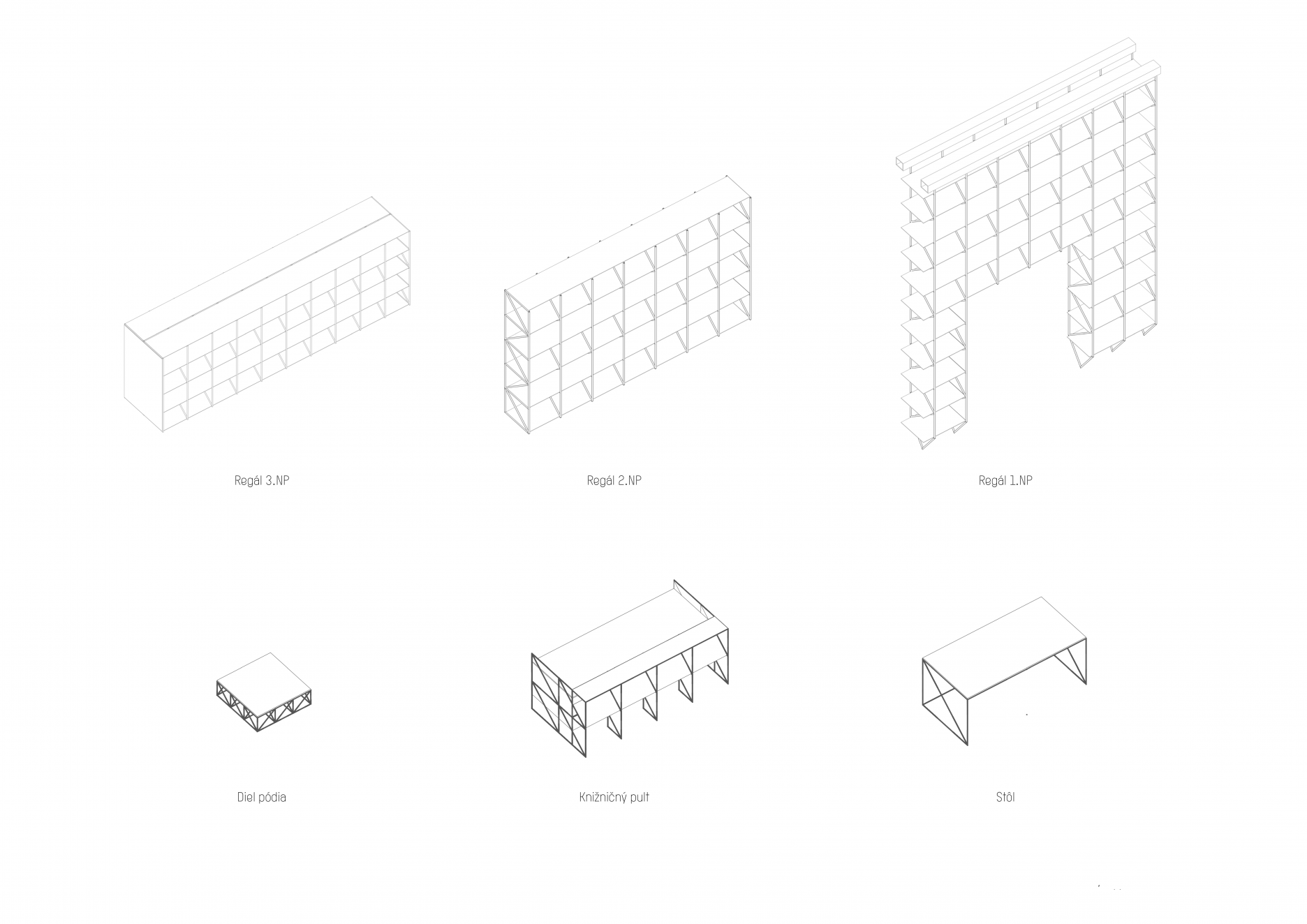 Definovanie trás pohybu nám pomohlo rozmiestniť regály a mobiliár a významovo dopovedať jednotlivé otvory. Taktiež autorský dizajn niektorých z mobiliárov reaguje i na postupné zahusťovanie pôdorysnej plochy smerom nahor.