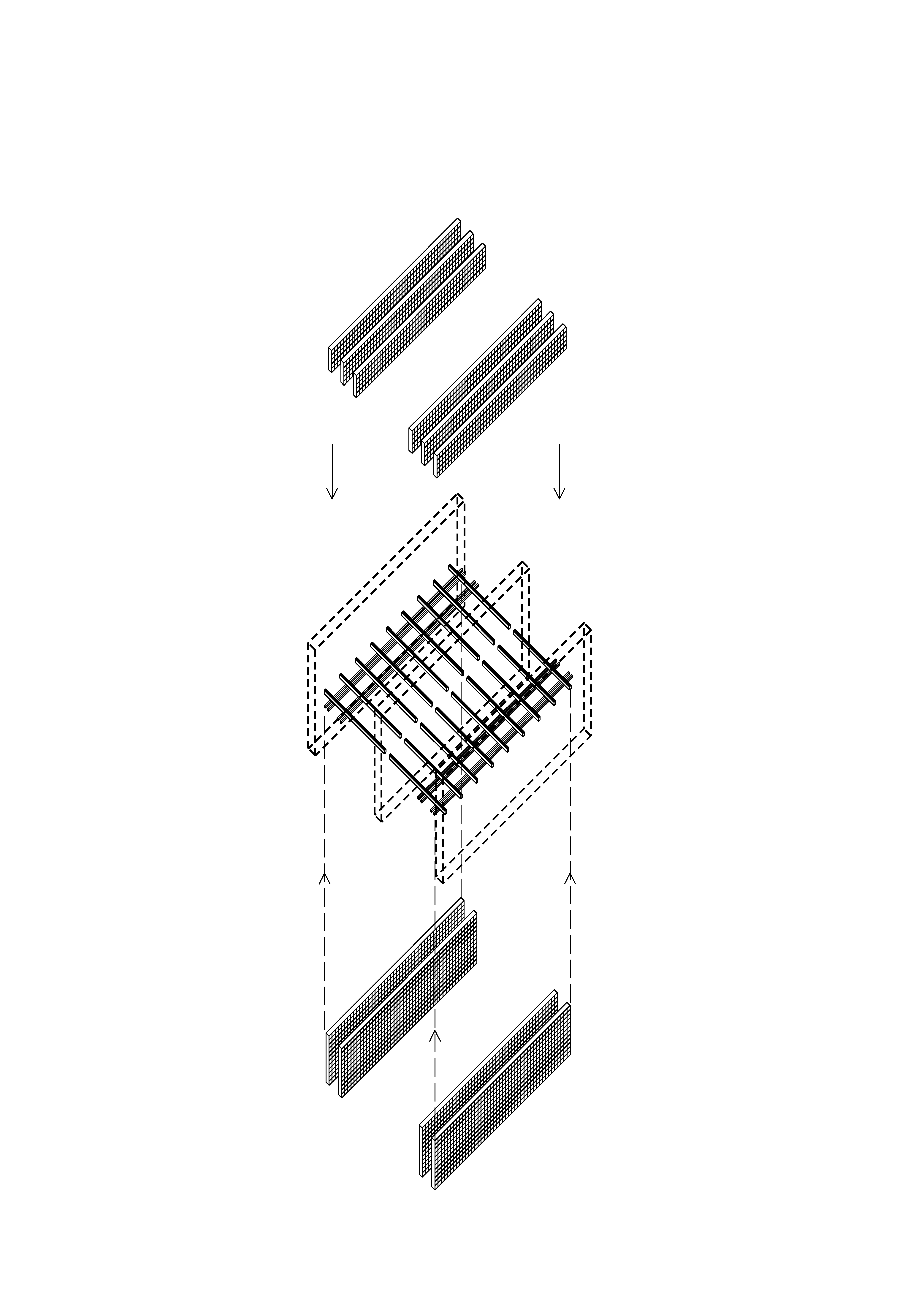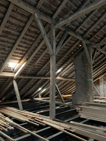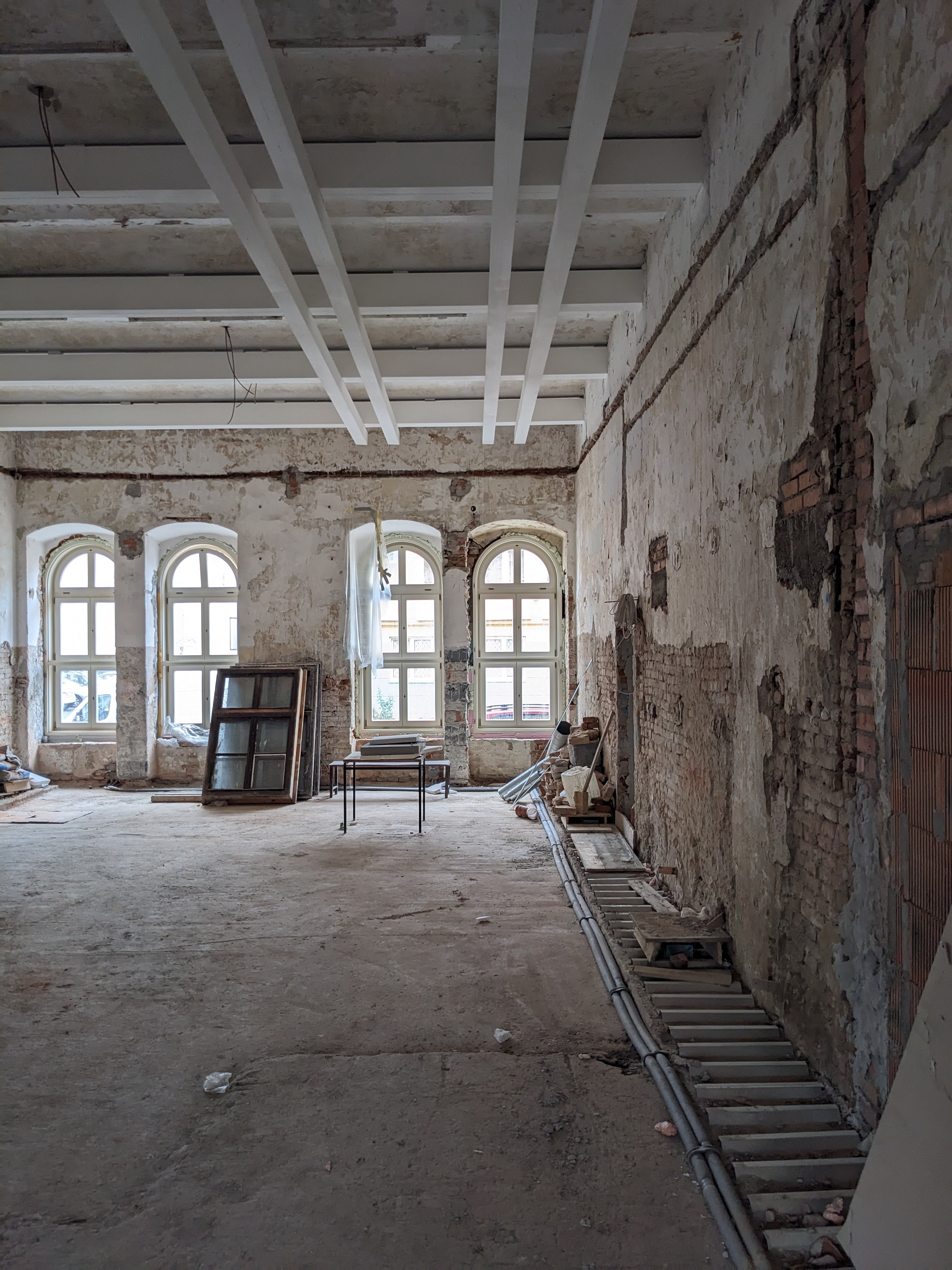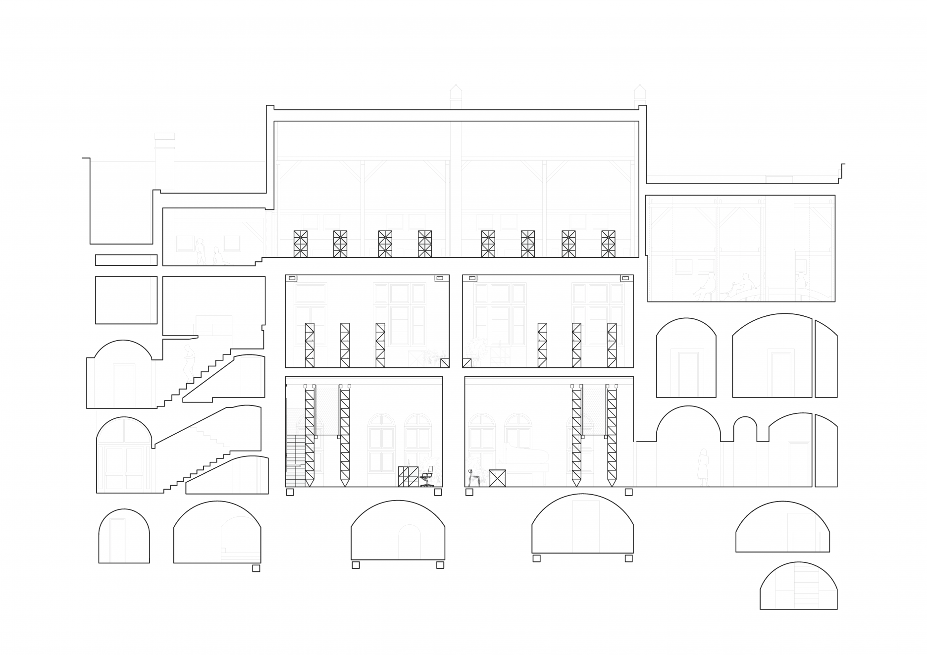 Vývoj stavebnej technológie v čase odzrkadľuje čitateľá prezentácia historických vrstiev objektu, ktoré završuje súčasné riešenie reflektujúce možnosti narábania s oceľou. Ilustrujeme tým “stenšovanie” konštrukcií v priebehu histórie. Od masívnych murovaných múrov cez liatinovú pavlač v neskoršom období až po navrhované oceľové prvky.