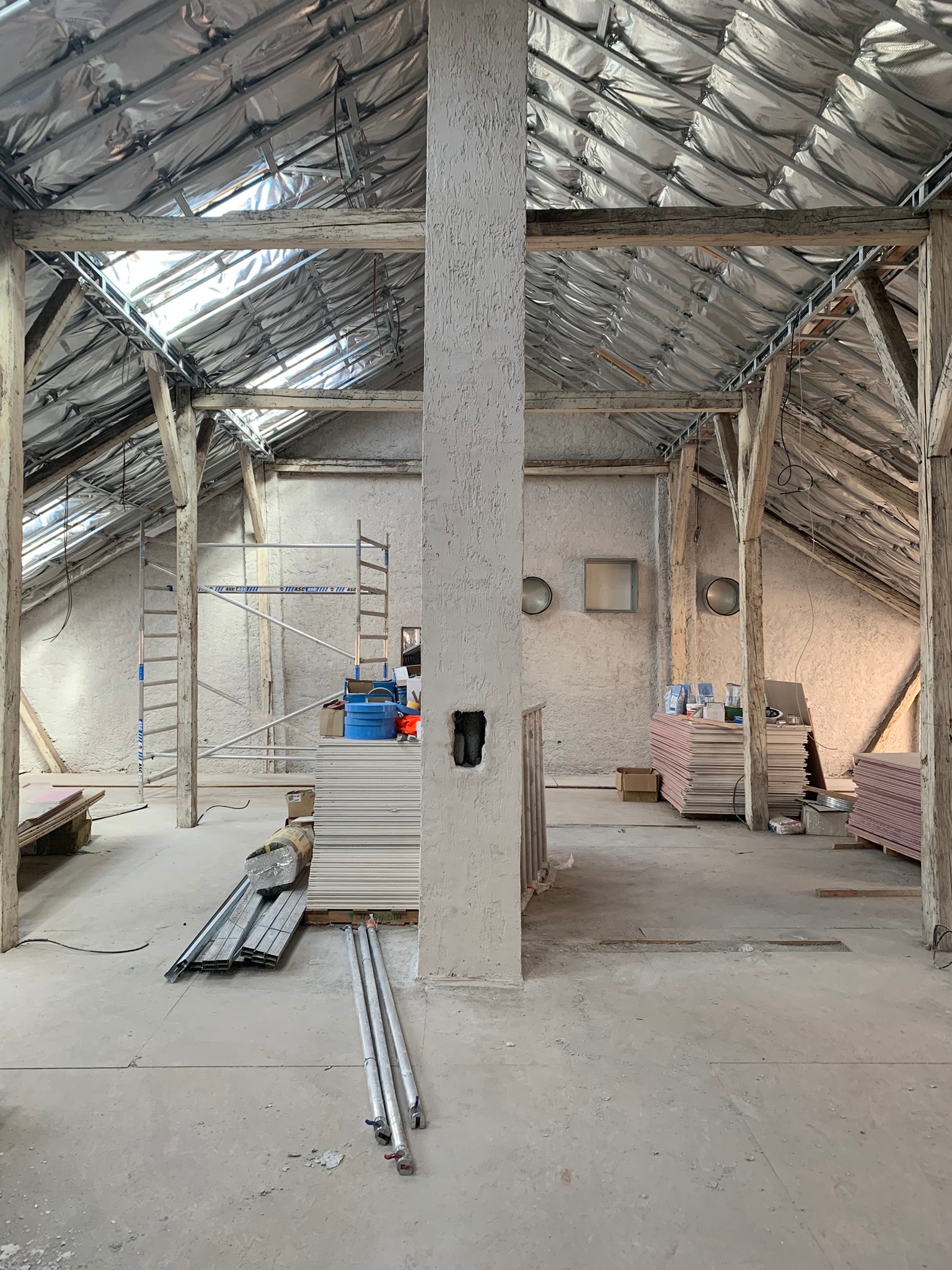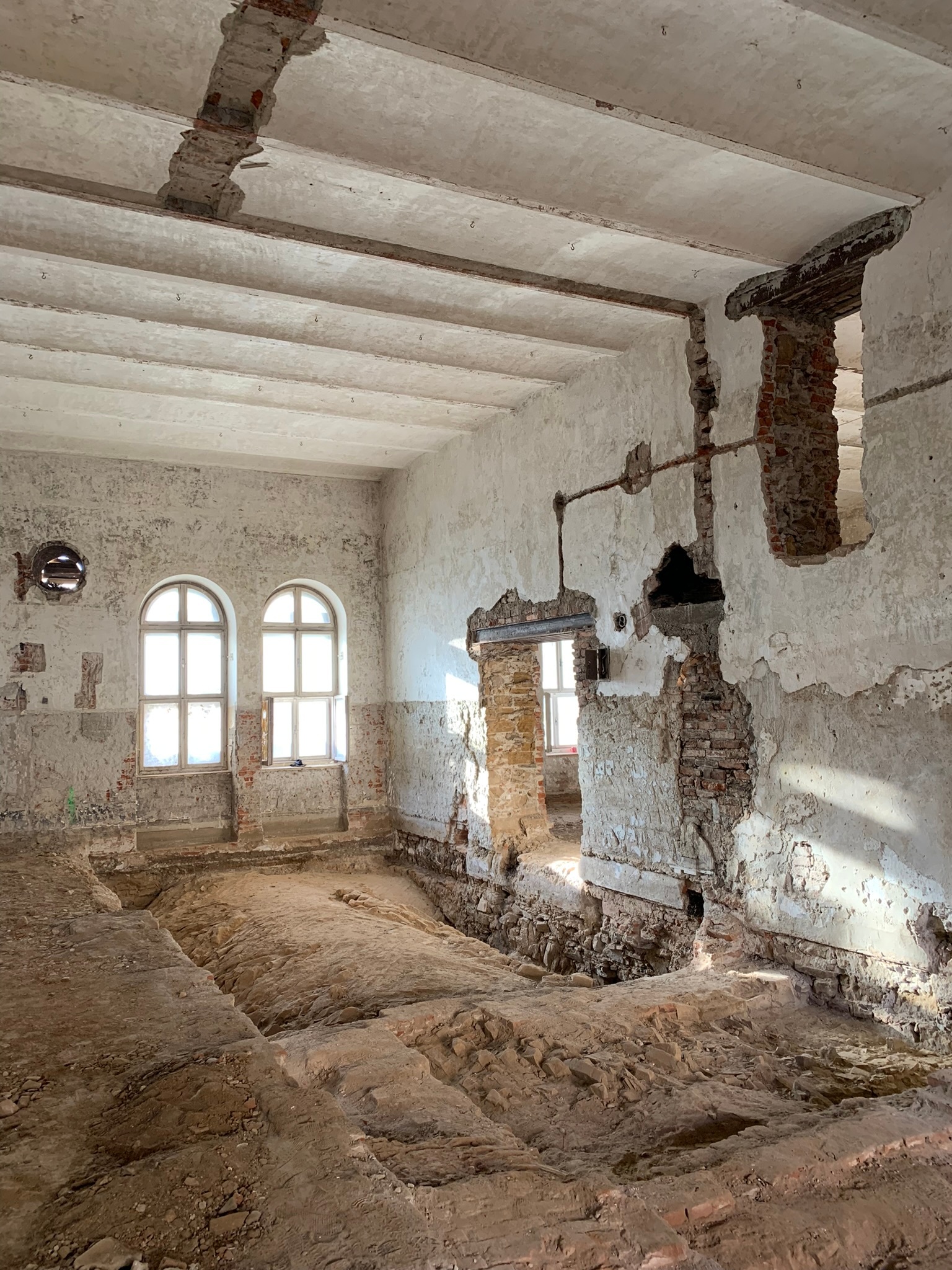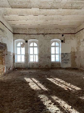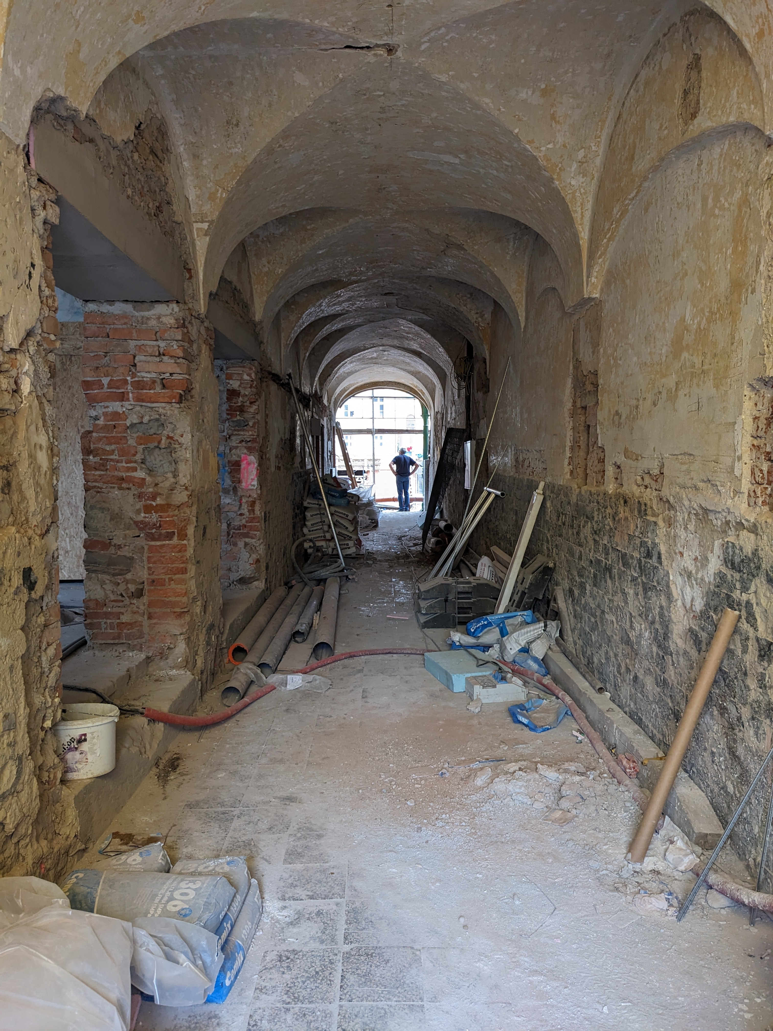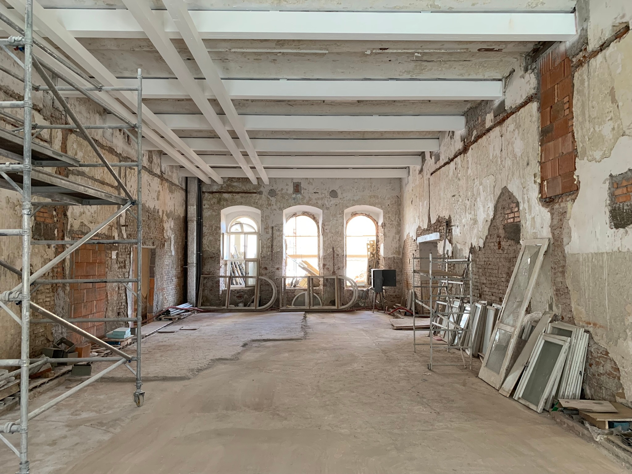 Vývoj stavebnej technológie v čase odzrkadľuje čitateľá prezentácia historických vrstiev objektu, ktoré završuje súčasné riešenie reflektujúce možnosti narábania s oceľou. Ilustrujeme tým “stenšovanie” konštrukcií v priebehu histórie. Od masívnych murovaných múrov cez liatinovú pavlač v neskoršom období až po navrhované oceľové prvky.