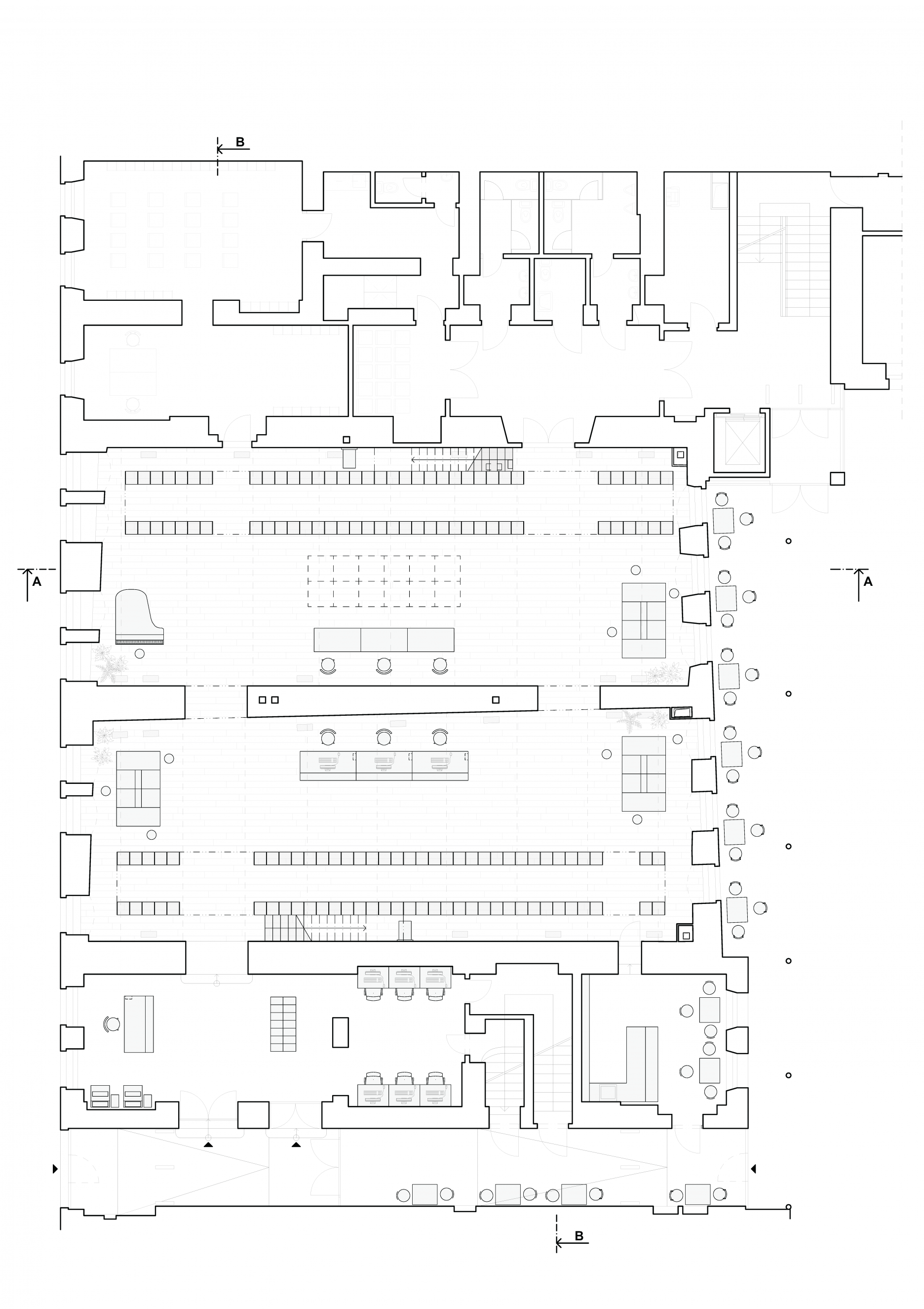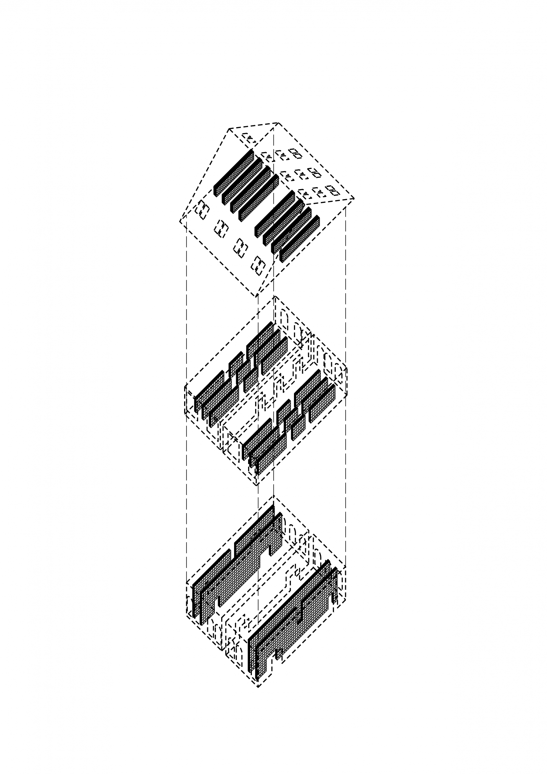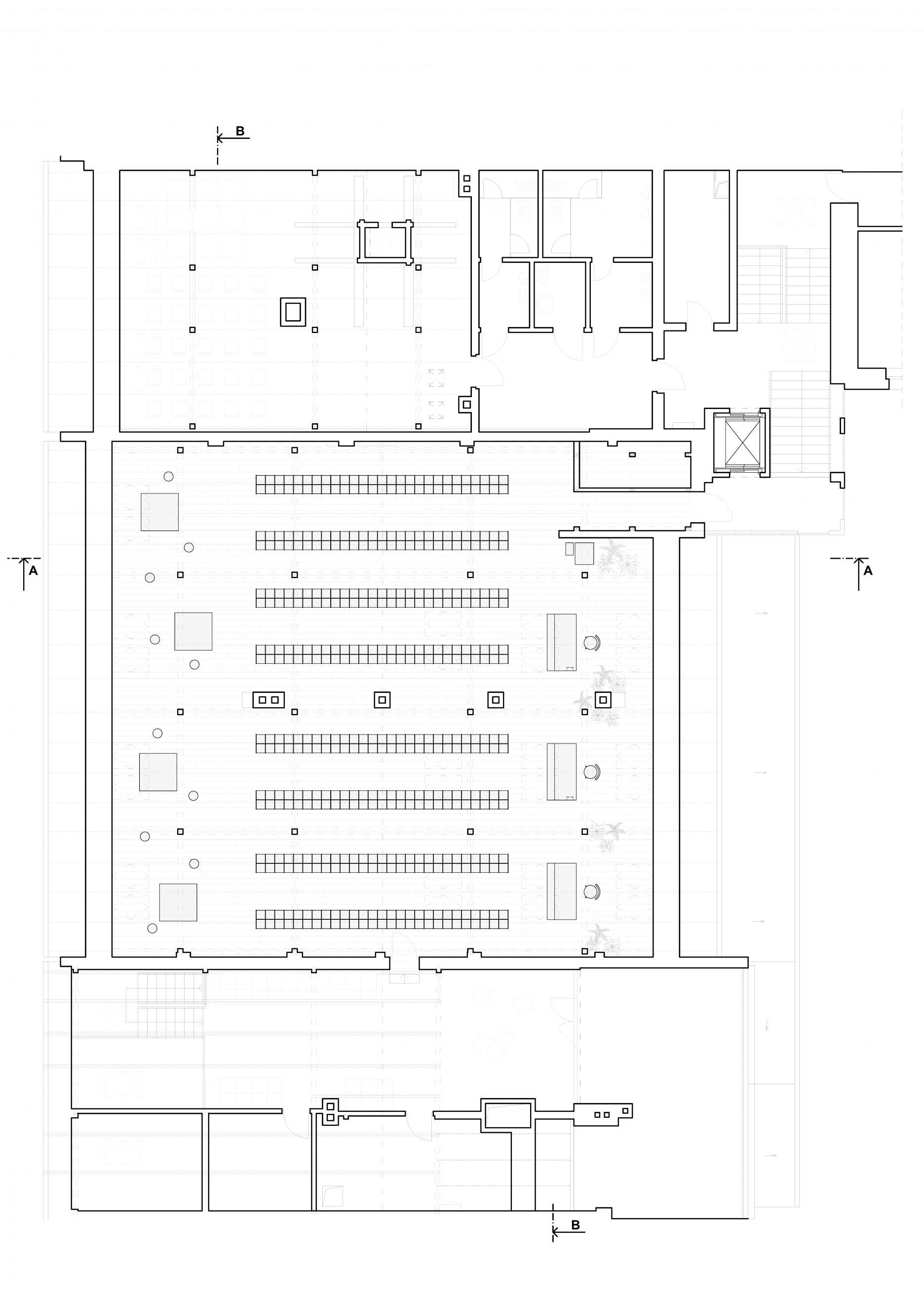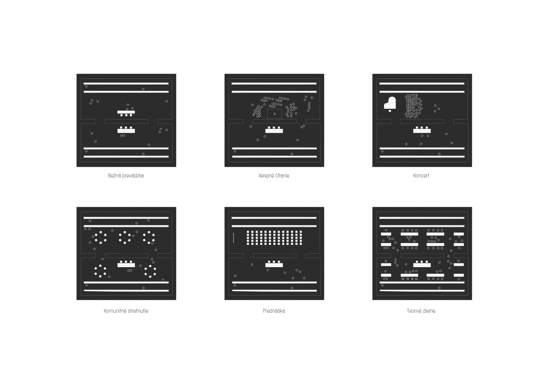 Prvé nadzemné podlažie ponúka široké spektrum užívateľských režimov, čo podporuje komunitný kultúrny život. V nasledujúcich podlažiach sa multifunkčnosť vytráca a priestor sa postupne zaplavuje knihami.