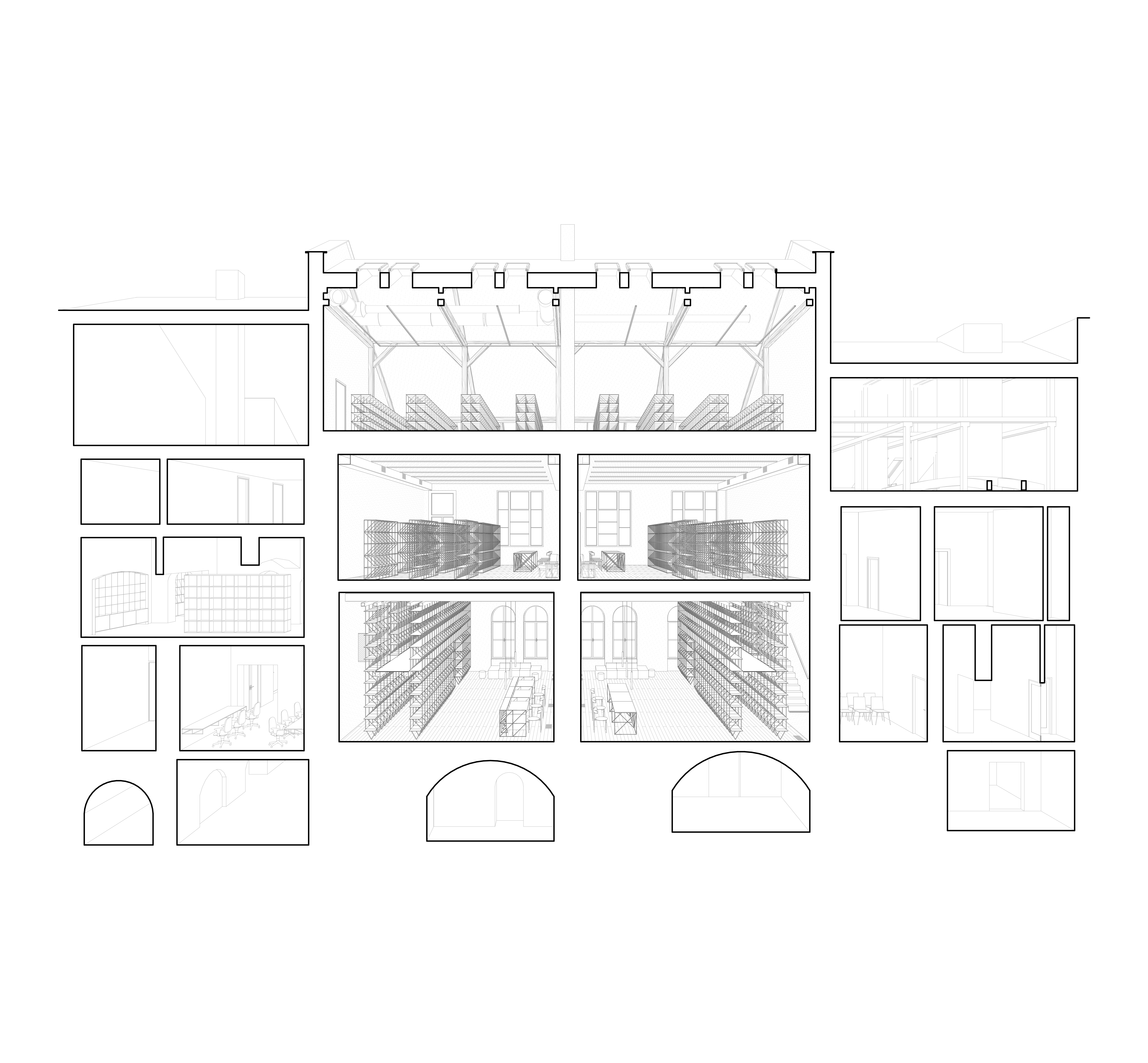 Navrhujeme gradientné zahusťovanie priestoru regálmi odspodu smerom nahor. V hlavných sieňach na prízemí umiestňujeme k obvodovým stenám po dva dvojposchodové regály (vešané na spevňujúce oceľové nosníky, ktoré zároveň pomáhajú preniesť tiaž z regálov aj na poschodí).