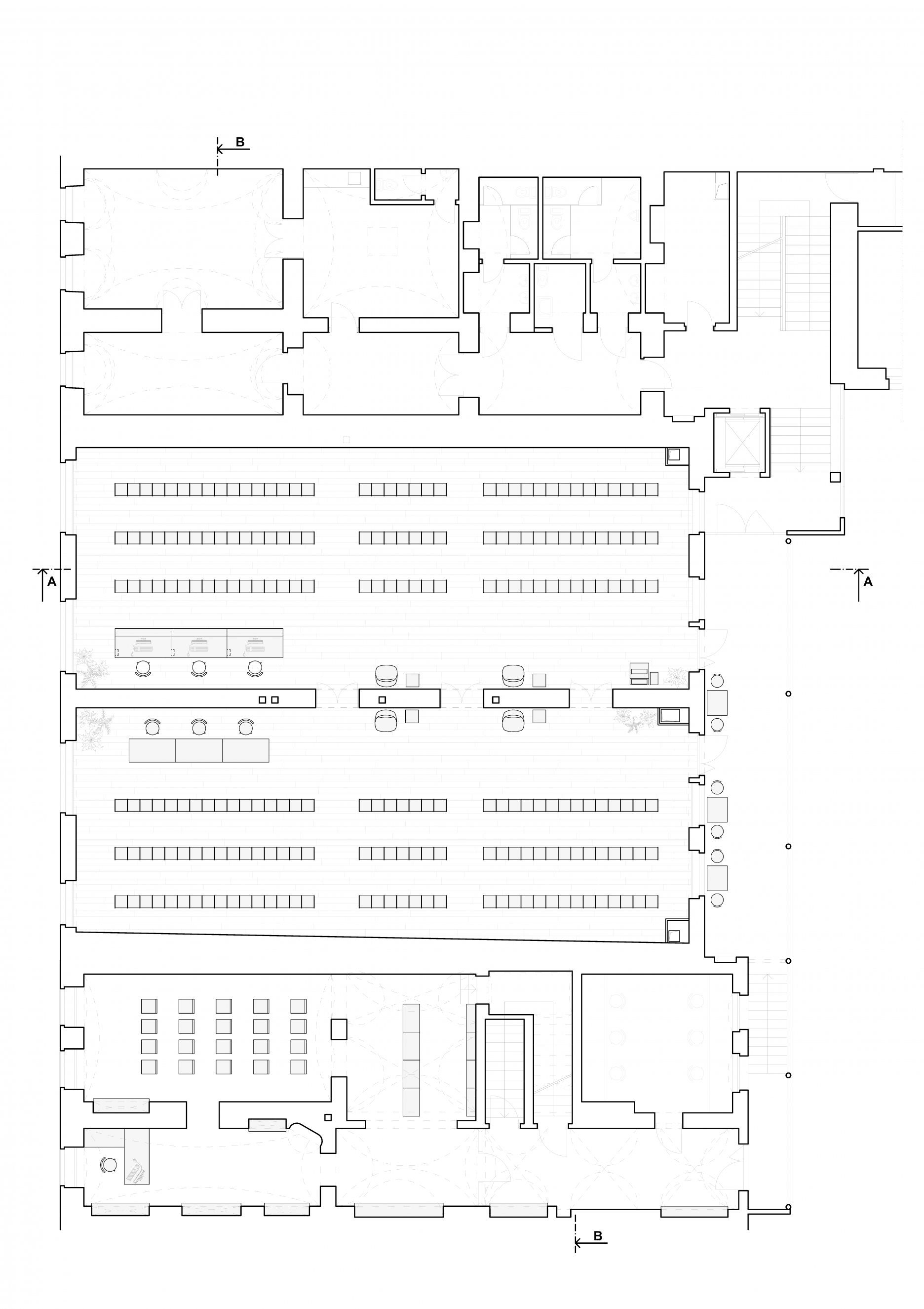 Potreba nevytvárať bariéry pre denné svetlo, ktoré vďaka vysokým oknám naplňuje siene, implikuje aj pozdĺžny smer uloženia regálov na všetkých podlažiach a spoločne s motívom subtílnych bielych políc vytvárame pre svetlo ľahko preniknuteľné prostredie.
