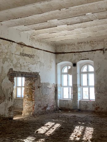 Hlavné priestory knižnice sa nachádzajú vo všetkých nadzemných podlažiach stredného meštianskeho domu. Pri obhliadke nás zaujala palácová mierka hlavných siení, využívajúcich celú šírku meštianskeho domu – od ulice až po dvor.