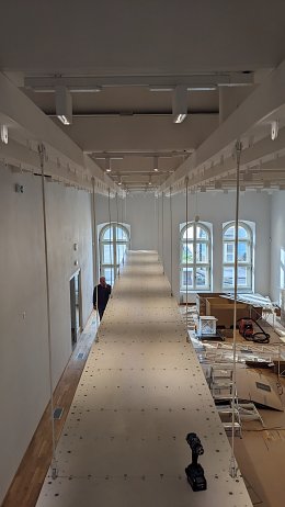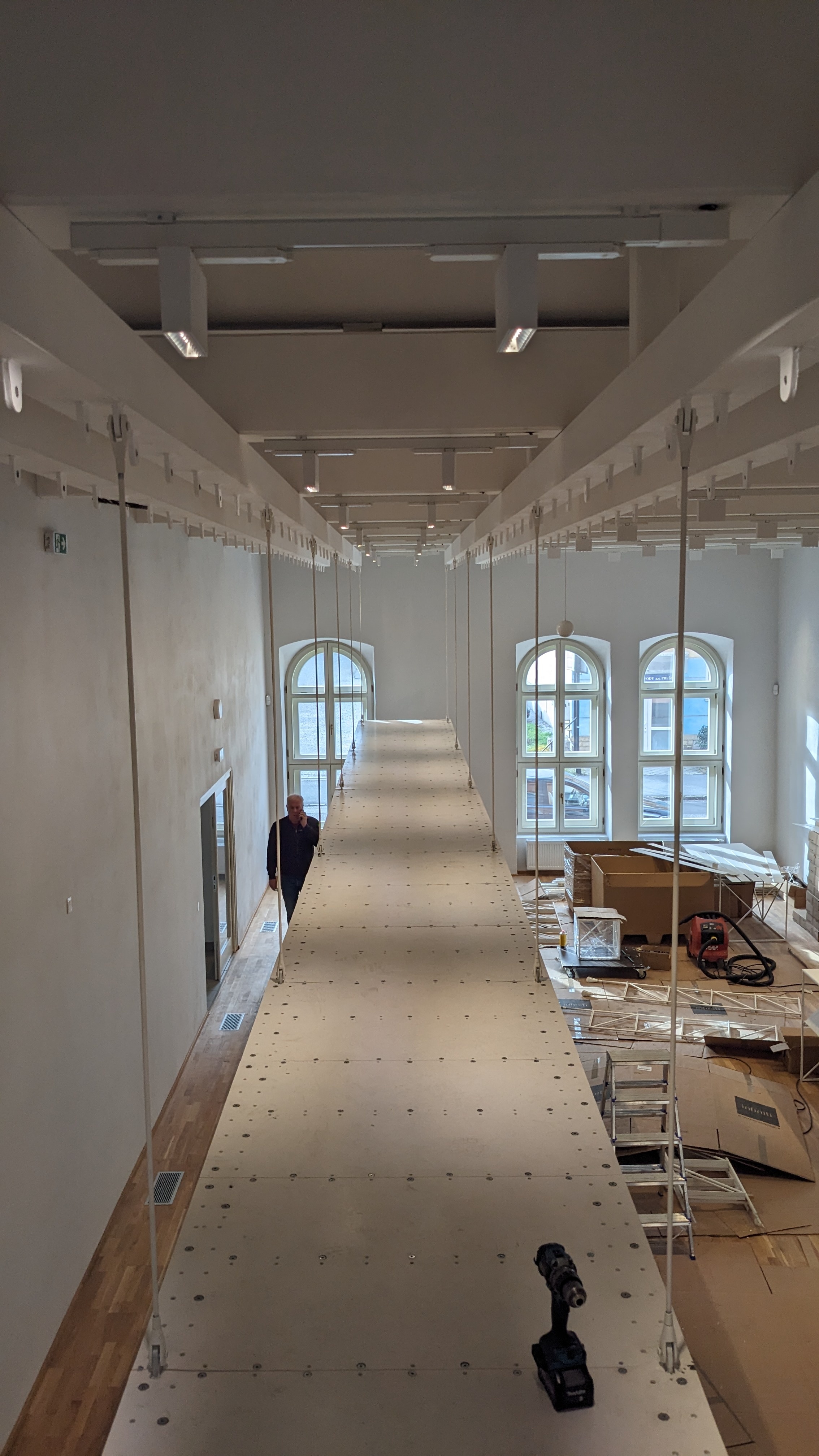 Táto statická schéma nám umožnila zrealizovať regály zo subtílnej oceľovej tyčoviny - princíp zavesenia súvisí s vysokou odolnosťou materiálu pri namáhaní ťahom. Takto sa z regálu, ktorý nesie veľkú váhu kníh, stáva efemérna záclonová konštrukcia.