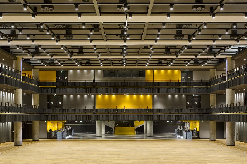 Za pódiom sú na jednotlivých podlažiach umiestnené obslužné miestnosti - šatne prestavateľné na prednáškové sály, miestnosti pre catering, kancelárie. Industriálna hrubosť sa odráža v materiáloch a detailoch interiéru - sú priznané betónové stĺpy nosnej konštrukcie, pohľadový betón hlavného schodiska, obklady stien zo surovej ocele. Tieto svojim povrchom aj detailom hrubé materiály sú kombinované s jemnými detailmi interiéru v baroch, precíznymi detailmi atypových dverí či oceľového schodiska a zrkadlami na najvyššom podlaží. Povrch parketu je z prírodného dubu.