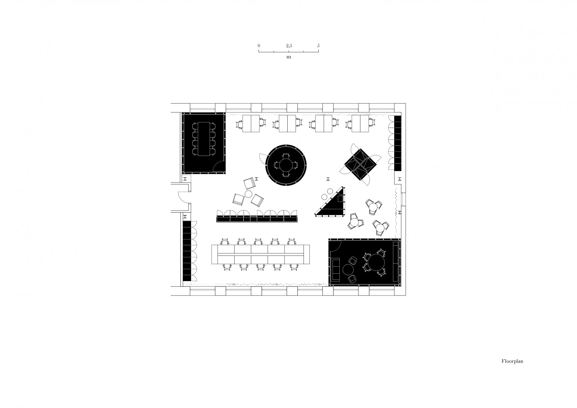 Koncept interiéru je podľa slov architektov založený na myšlienke podpory komunity a tímovej práce, zároveň však s odlíšením rozdielnych potrieb jednotlivých tímov. Základ tvorí otvorený priestor (260 m2) rozdelený na tri hlavné zóny.