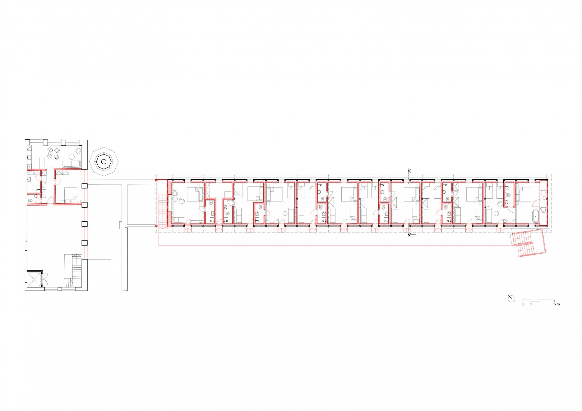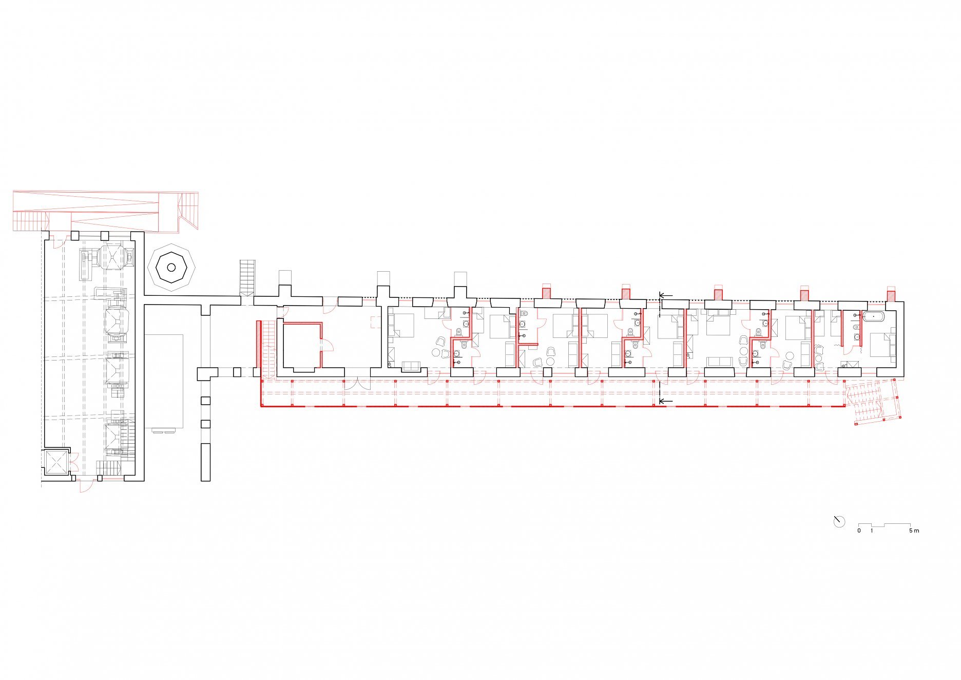 Projekt rieši premenu bývalého skladu na ubytovacie zariadenia. Vzhľadom na šírku objektu necelých 6 metrov nebolo možné viesť komunikáciu vo vnútri dispozície. Zvlášť na druhom podlaží by to znamenalo výrazný zásah do zachovaných konštrukcií. Autori sa preto rozhodli pristavať samostatnú pavlač, z južnej strany. Pavlač je zostavená z dubového reziva druhej kvality, ktoré malo pôvodne slúžiť ako palivo.