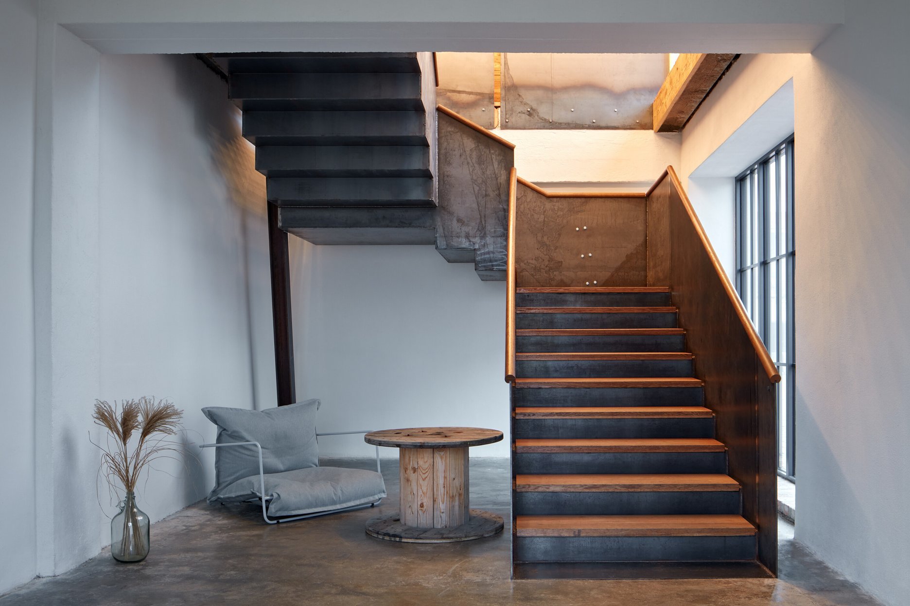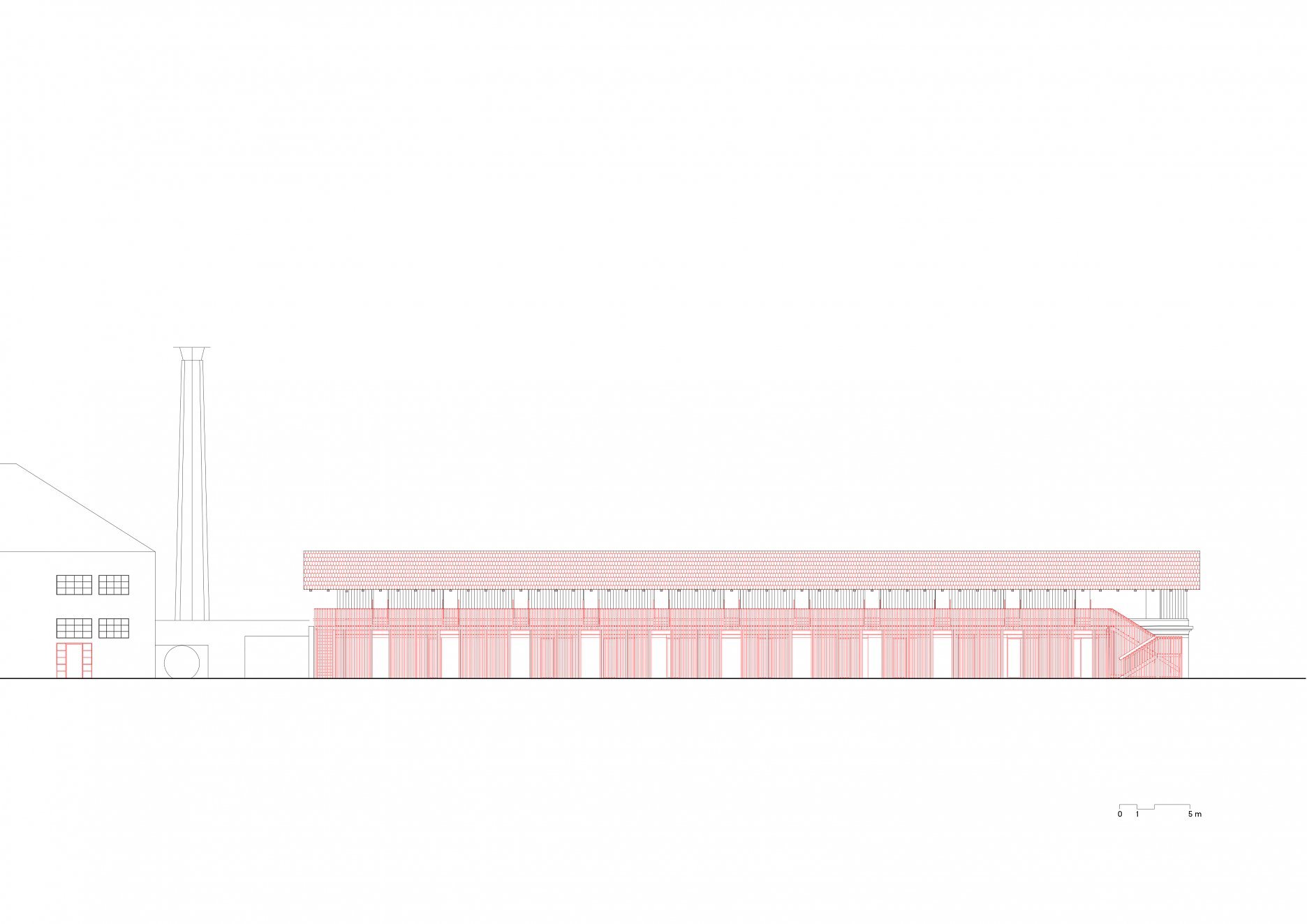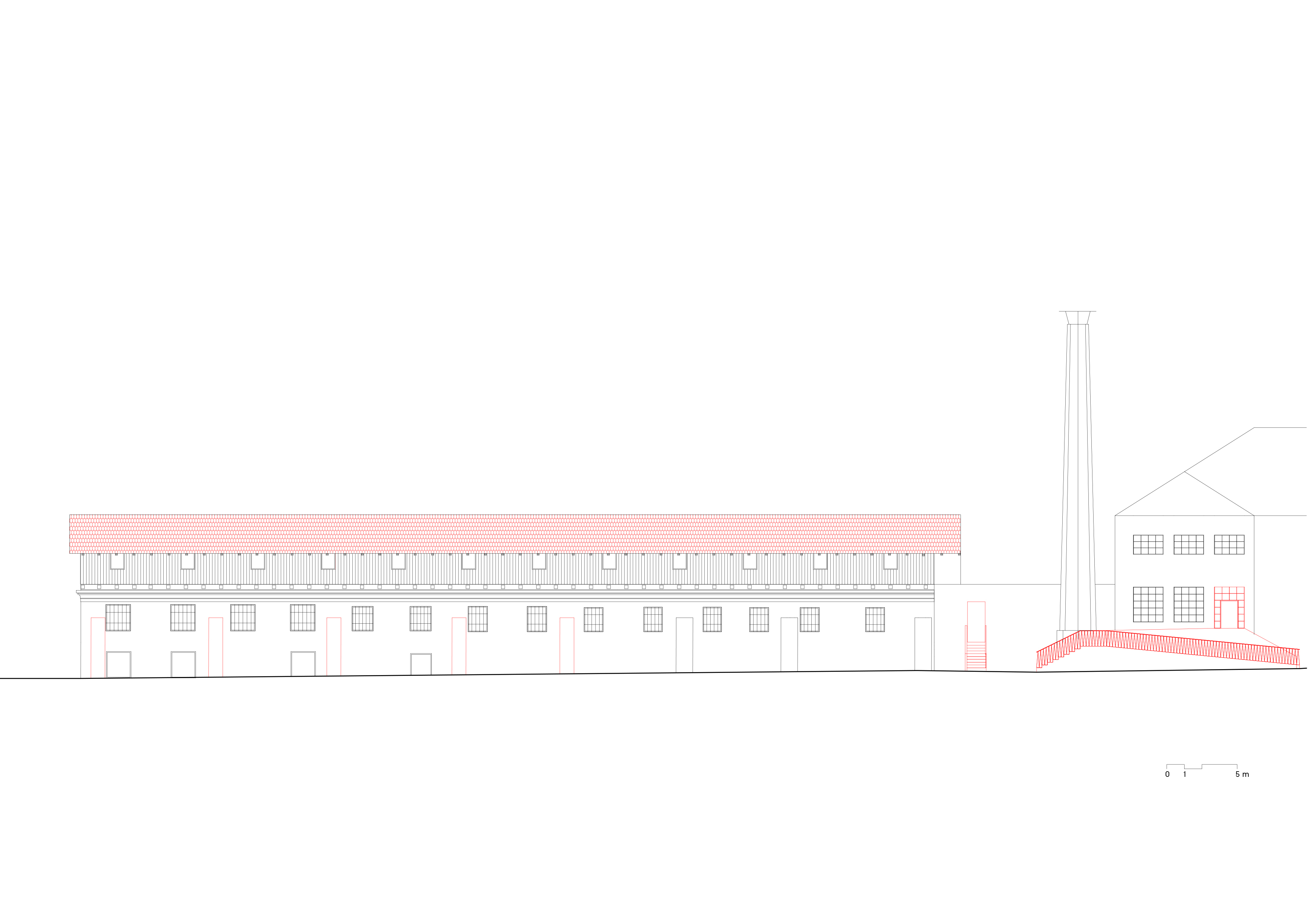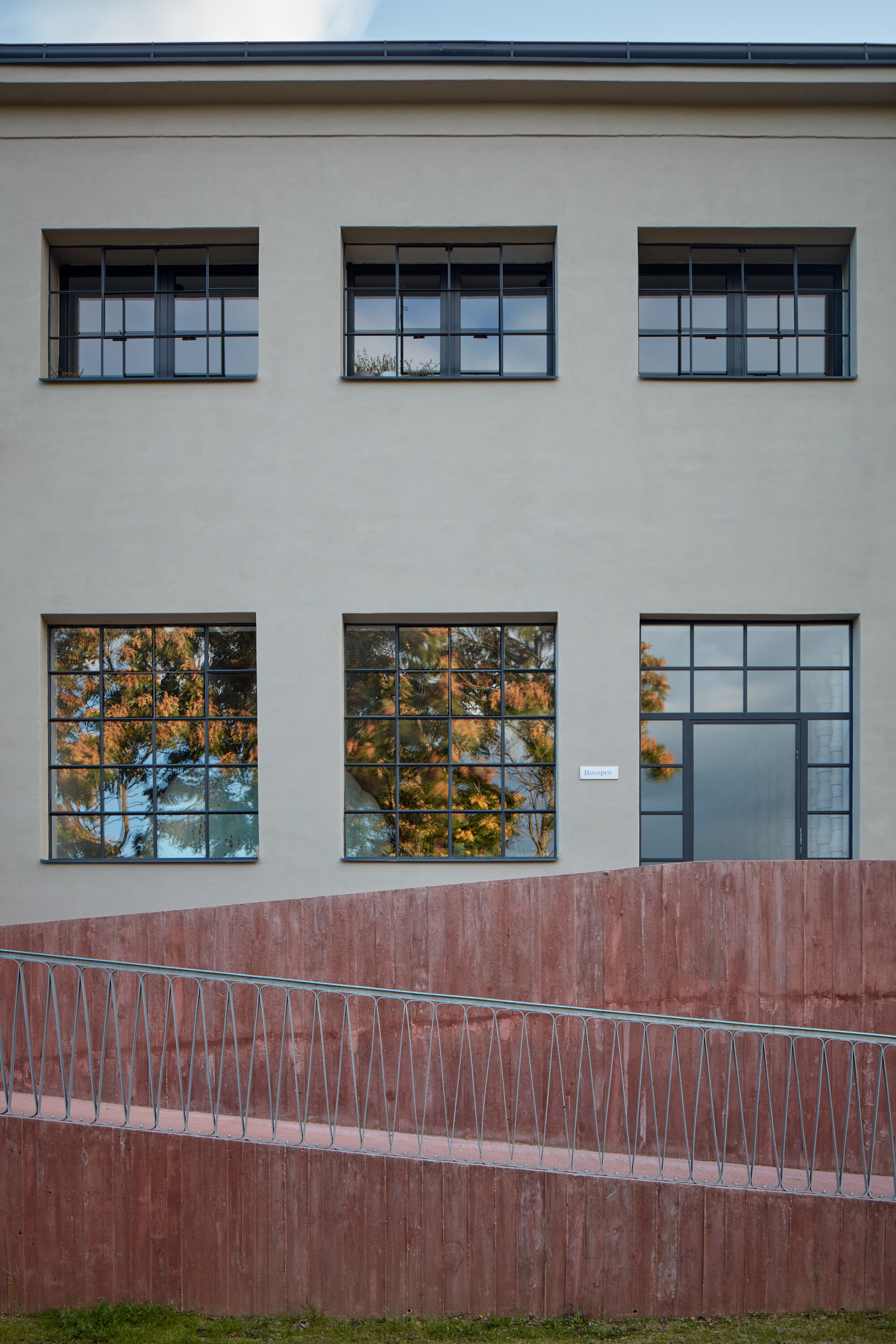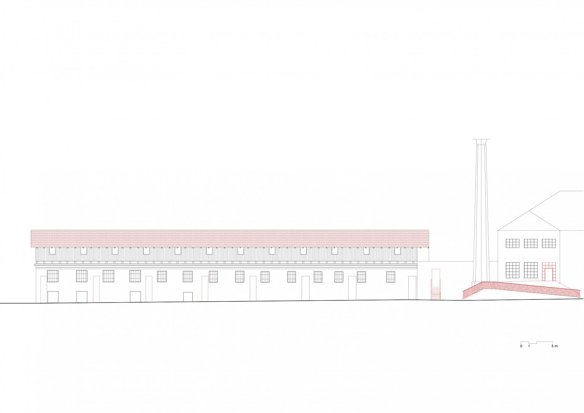 Izby na prízemí majú vybúrané parapety, vďaka tomu je možné do nich vstúpiť priamo spoza drevenej zásteny. Na severnej fasáde architekti zachovali oceľové rámy bývalých továrenských okien. Nové výplne sú až za nimi. Rámy tvorí mreža, ktorá funguje ako bariéra proti pádu, pretože okná majú nízky parapet. Zároveň ponechávajú otvorom ich pôvodné delenie. Rekonštrukcia objektu zahŕňala pristavanie oporných pilierov k severnej fasáde, ktoré zabezpečili jej stabilizáciu. V izbách na prízemí je však možné vnímať výrazné naklonenie múrov.