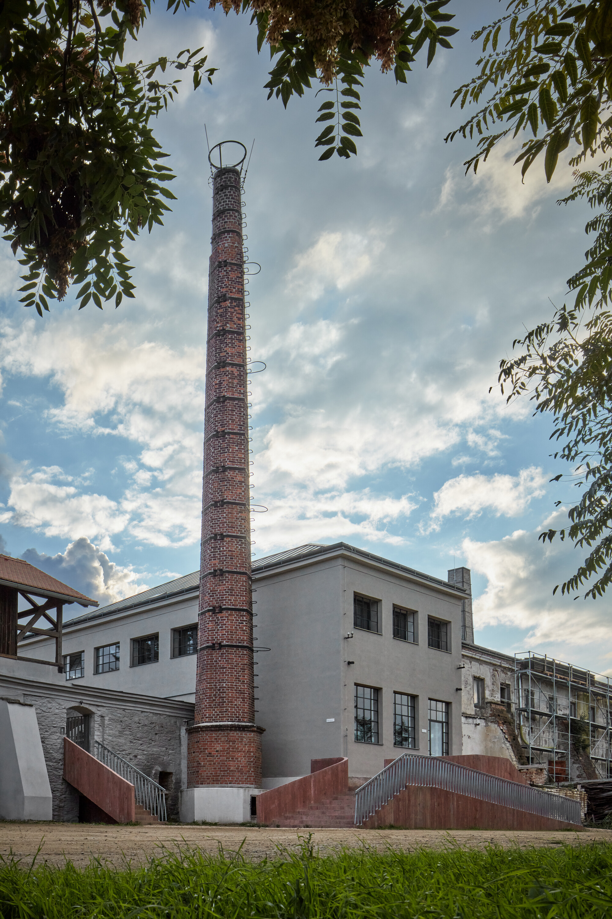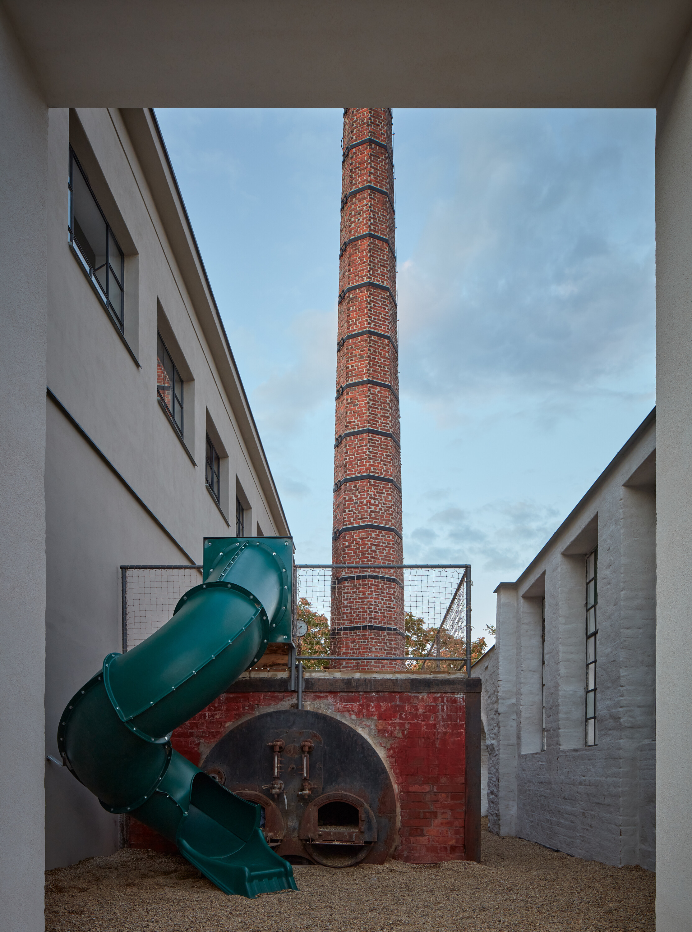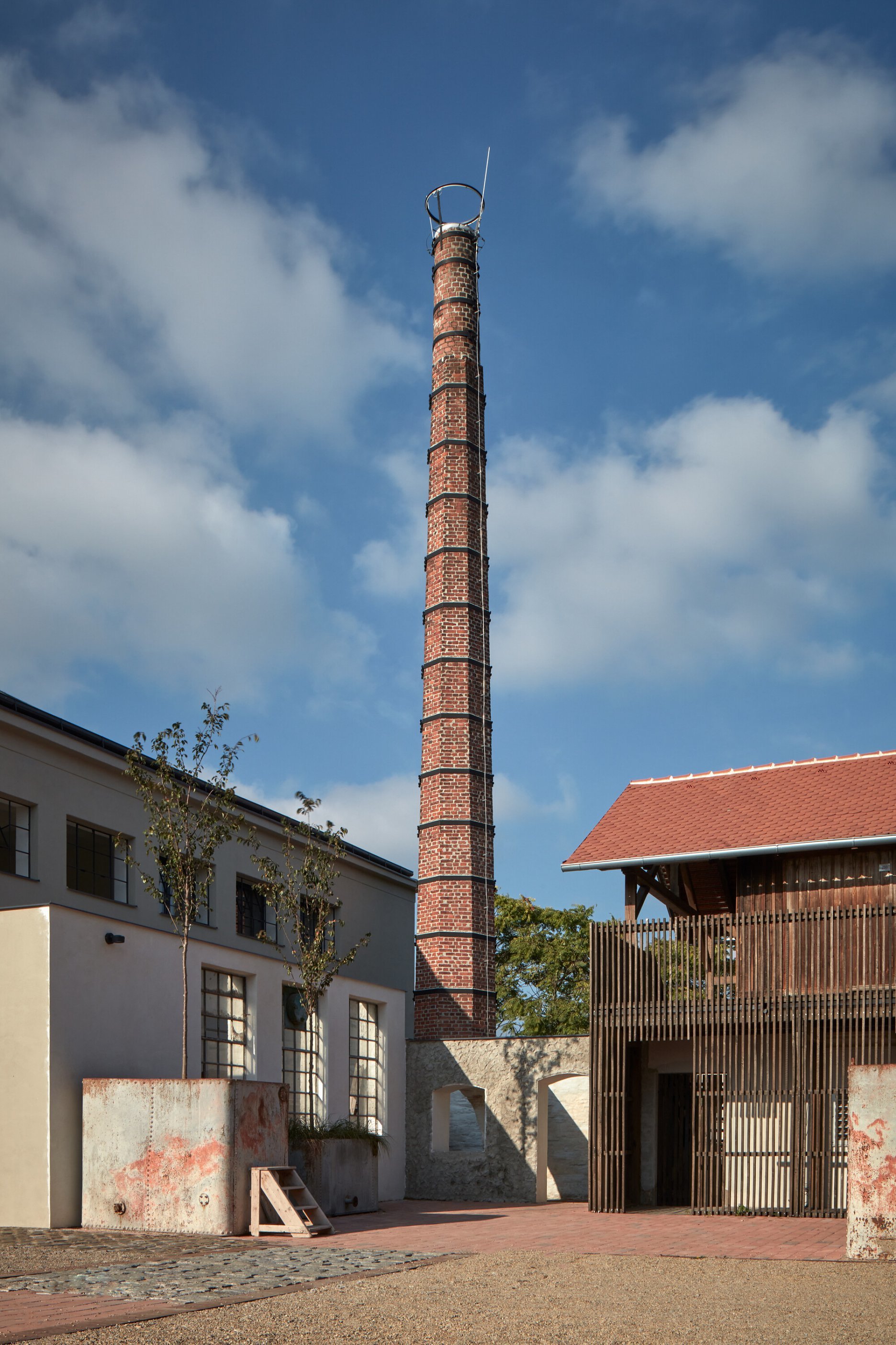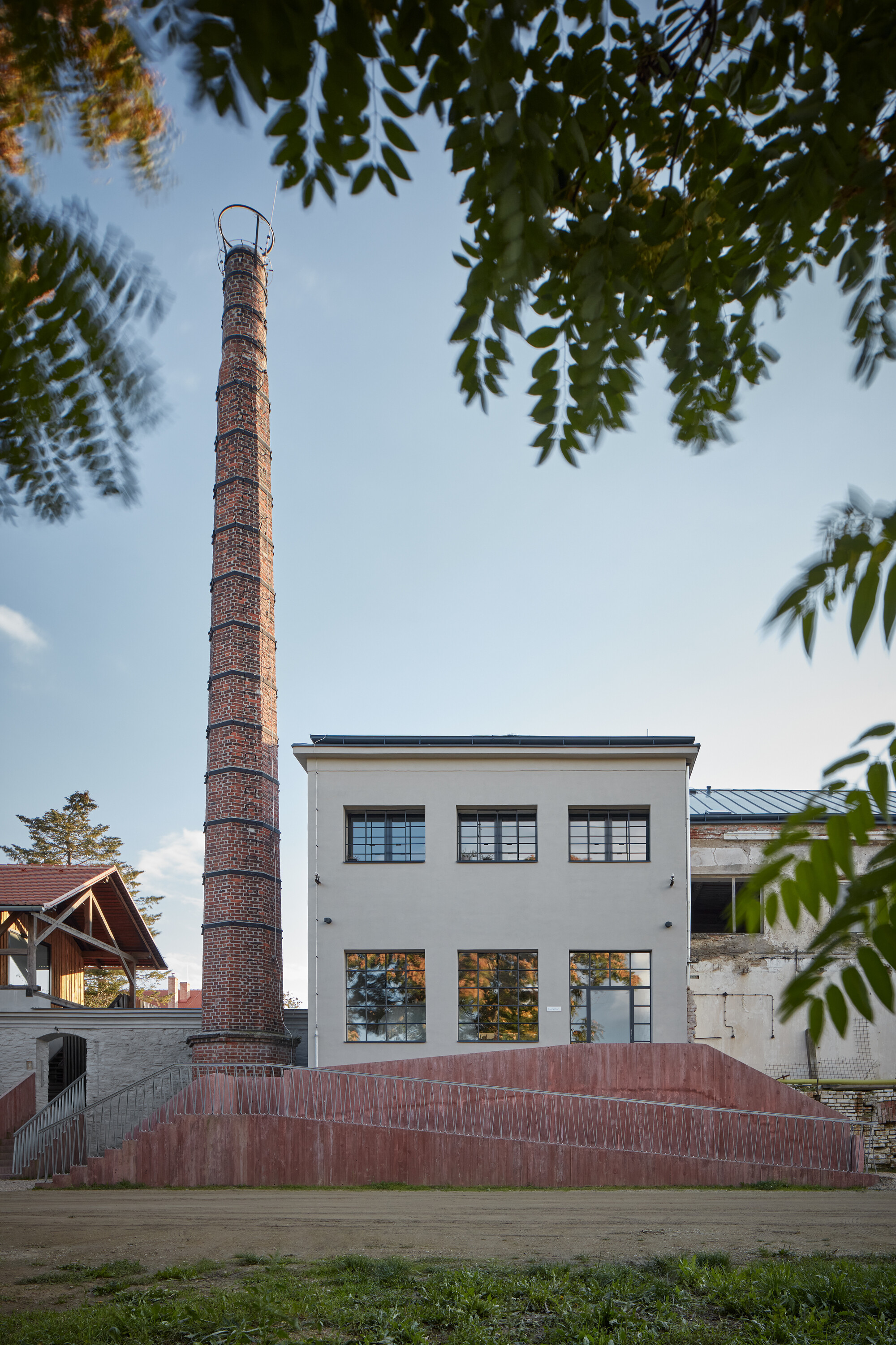 Ako hlavná dominanta pôsobí murovaný továrenský komín, viditeľný už diaľky. Časť pôvodnej fabriky, hneď vedľa komína, po rekonštrukcii slúži ako recepcia a zázemie pre zamestnancov. Do objektu sa vstupuje po rampe z pigmentovaného betónu. Súčasný vstup bol kedysi zadným traktom areálu, preto architekti jasne definovali a akcentovali nový hlavný vstup.