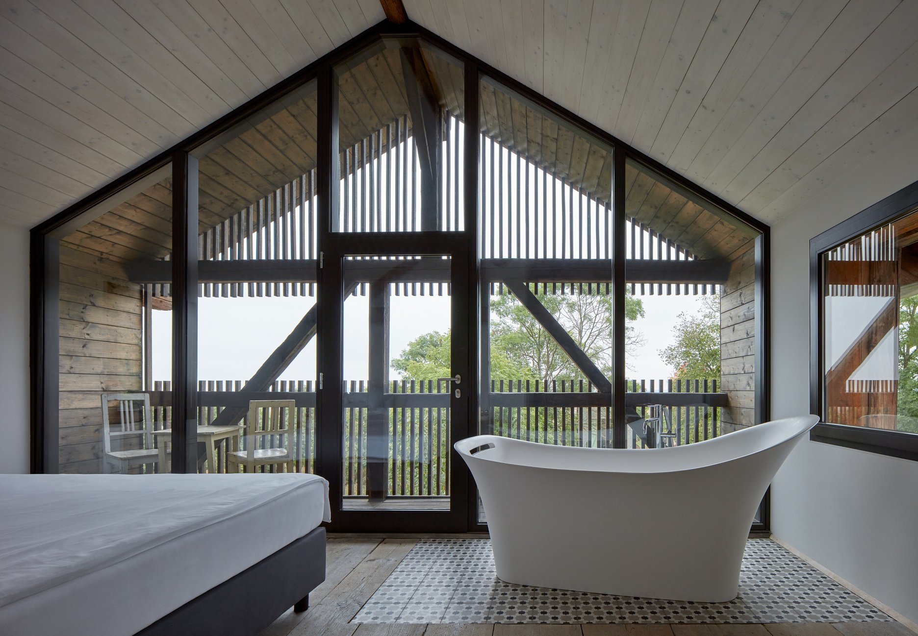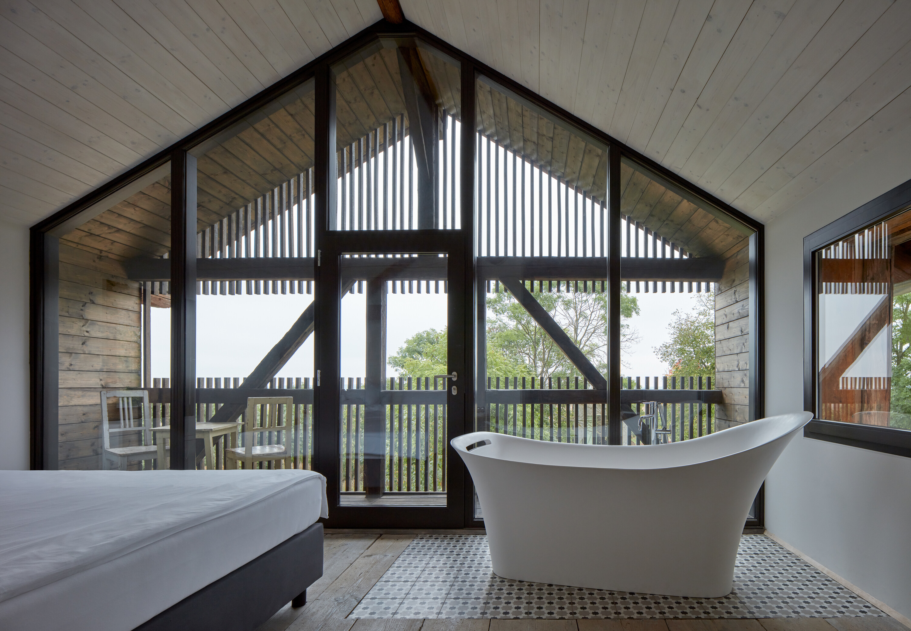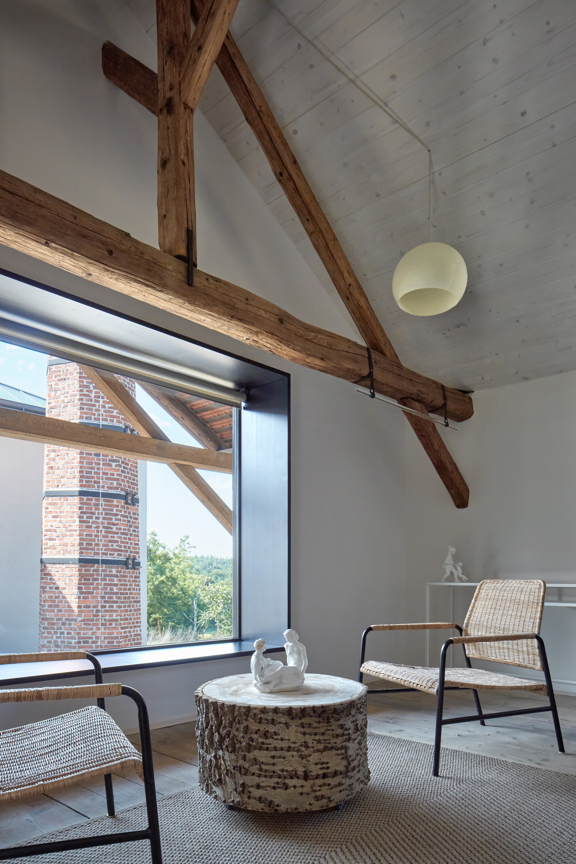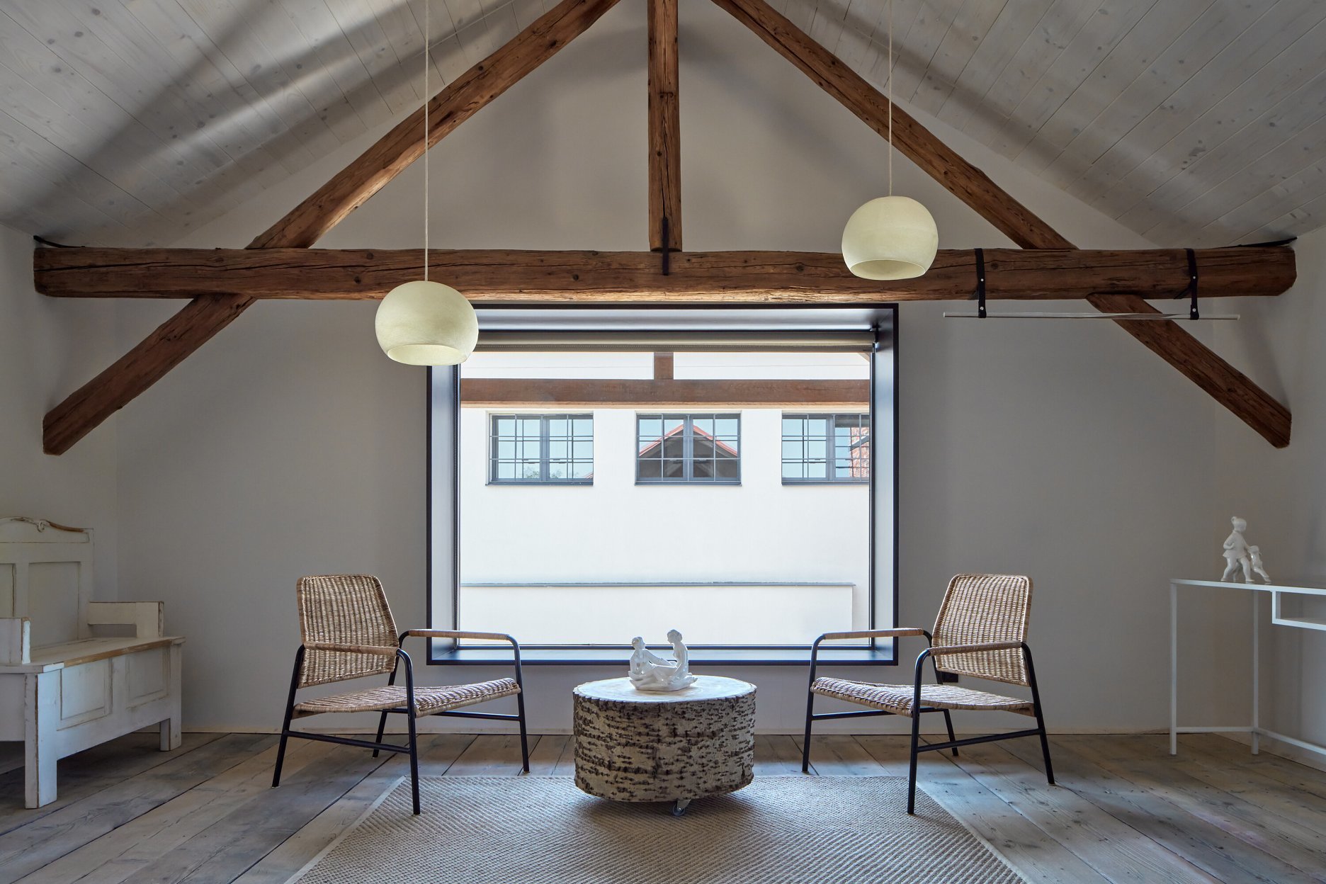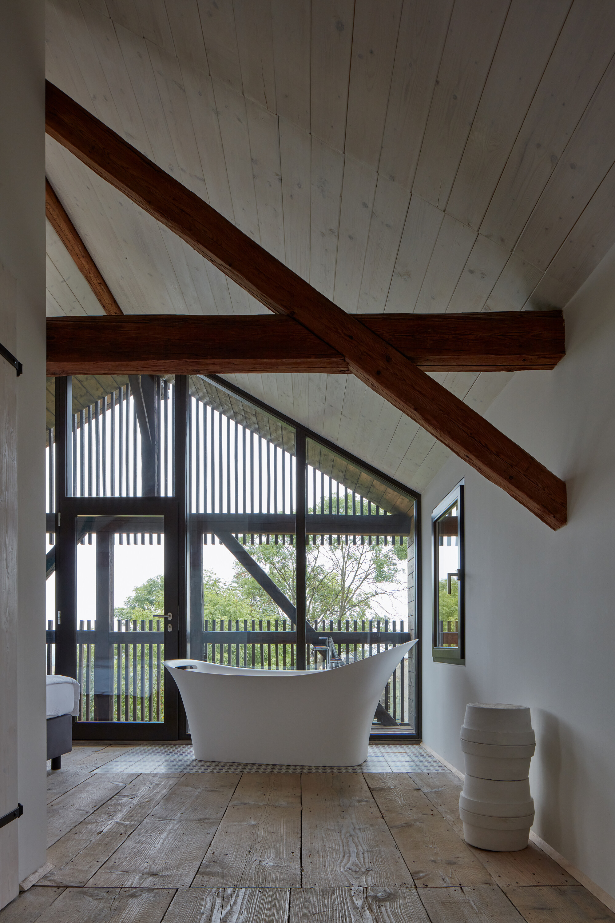 Na poschodí môžu hostia obdivovať priznané trámy plných väzieb a pôvodné fošne, ktoré našli využitie ako nová podlaha.