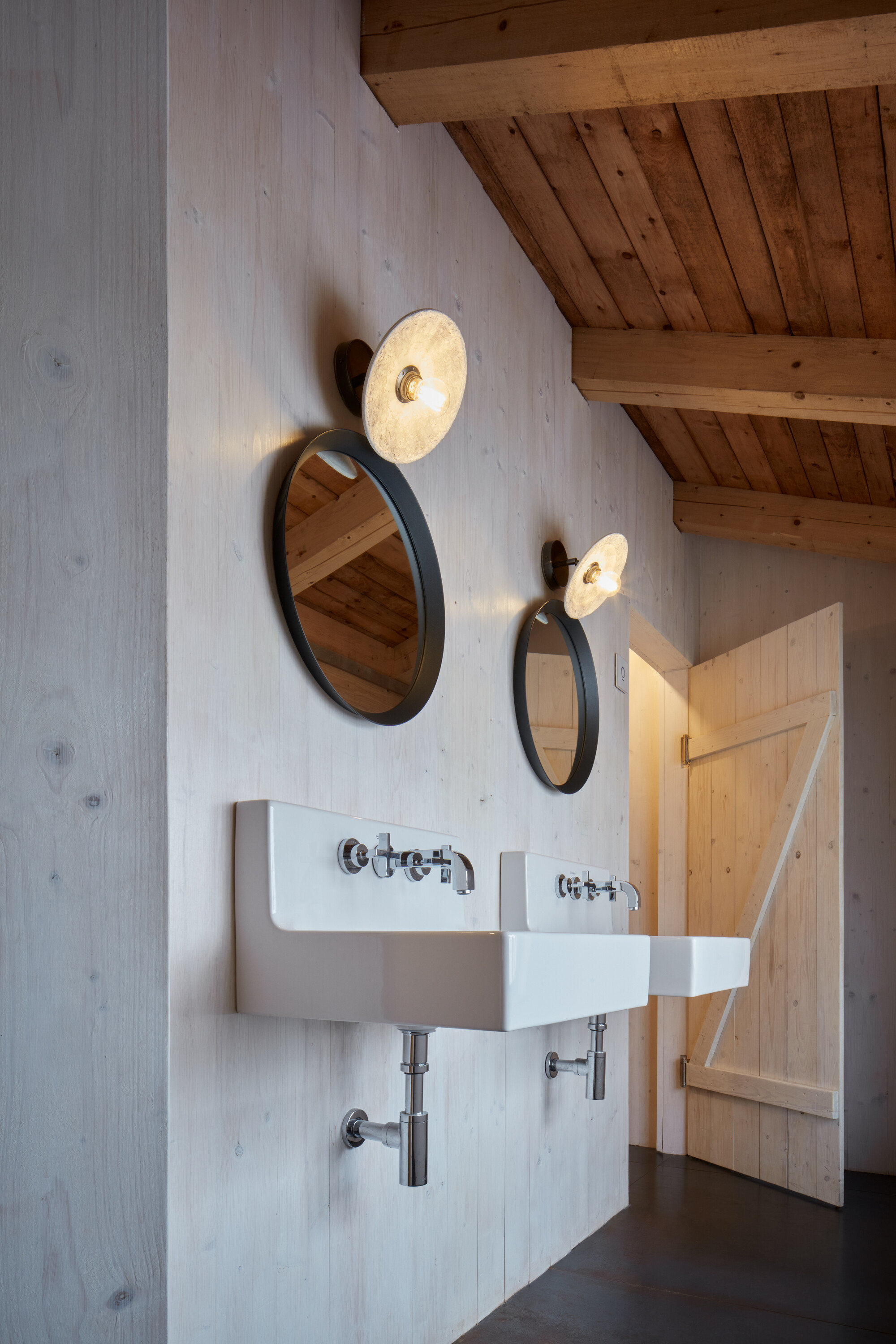 Izby na prízemí tvoria jednoduché svetlé priestory, kúpeľne sú oddelené oceľovými rámami s matným zasklením.