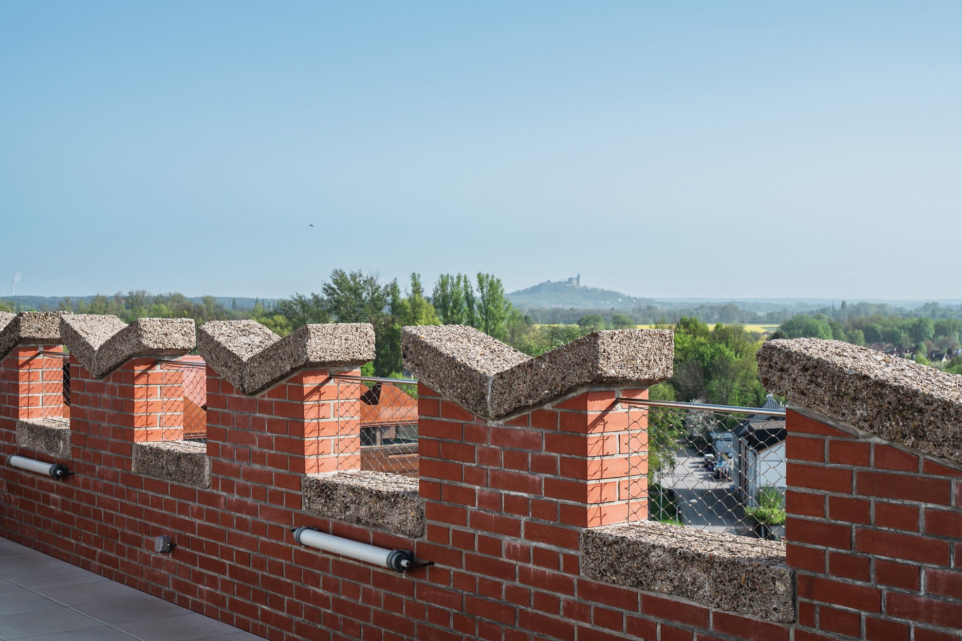 Určujúci bodom požiarno-bezpečnostného riešenia tvorila spoločenská sála na úrovni 6. N.P. a strešná terasa, z ktorých vedie iba jedna úniková cesta. Schodiskový priestor je chránenou únikovou cestou typu "B" s núteným pretlakovým vetraním. Ventilátor je umiestnený v suteréne, výduch v strešnej nadstavbe. Prefabrikované sklobetónové podlahové panely na prízemí a v sále slúžia aj ako požiarna deliaca konštrukcia. Atypické prvky vykazujú odolnosť až 90 minút.