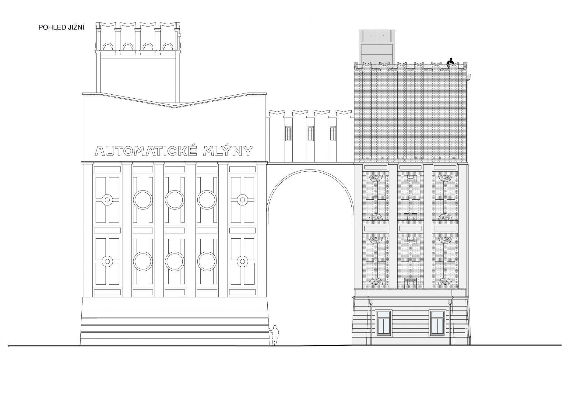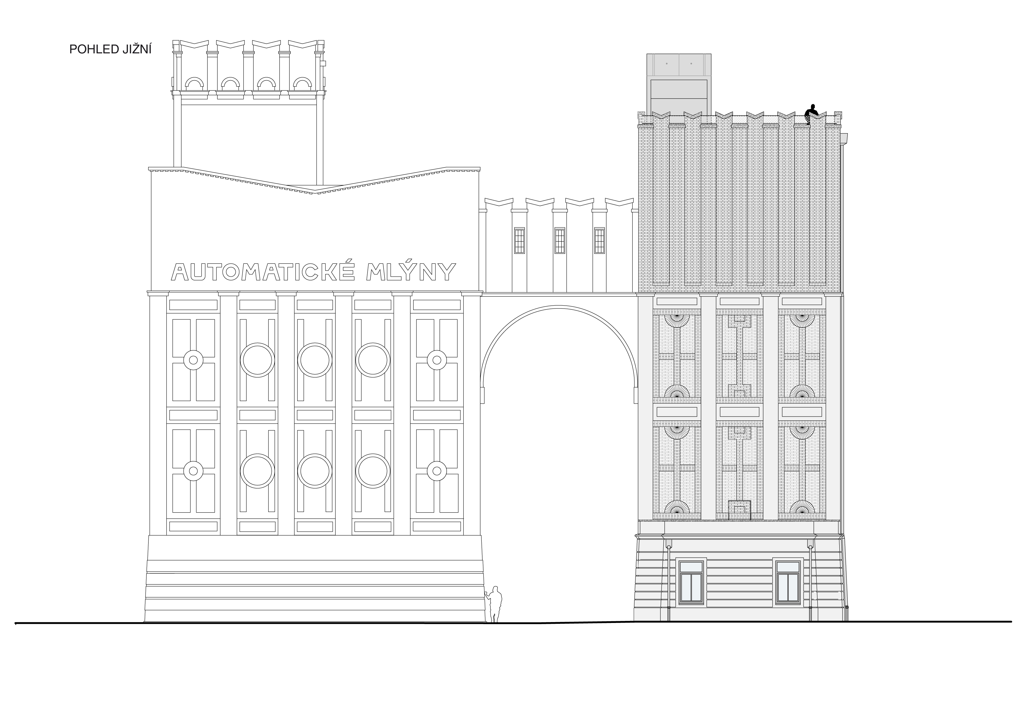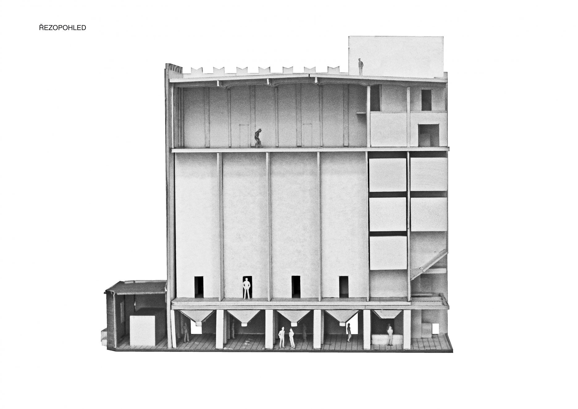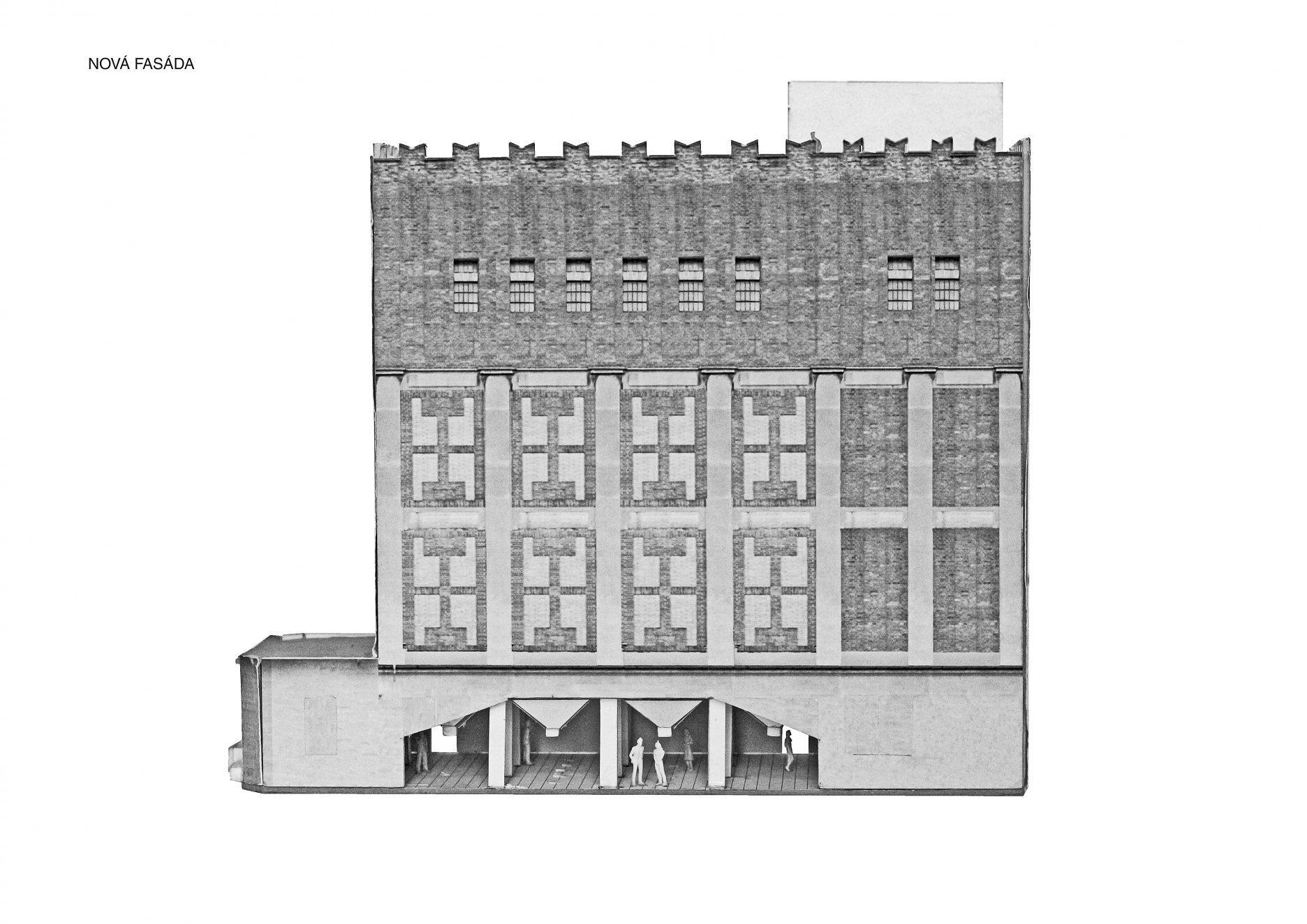 Najvýraznejším zásahom ateliéru Prokš Přikryl architekti je otvorenie stavby z oboch bočných strán a vytvorenie krytého podlubia v priestore pod násypníkmi. "Myšlenka otevření budovy do náměstí šla ruku v ruce s celkovým otevřením areálu městu po více než sto letech. Otevření bran, otevření parteru. Otevřeli jsme i cihelný sokl velkým otvorem, který byl doposud tajemně uzavřený. Odkryté zásobníky obilí daly krytému prostoru atmosféru. Ze strany mezi mlýny a silem je parter propojen v místech původních dveří. Z druhé strany je sokl naopak široce prolomen novým otvorem." vysvetľujú architekti.