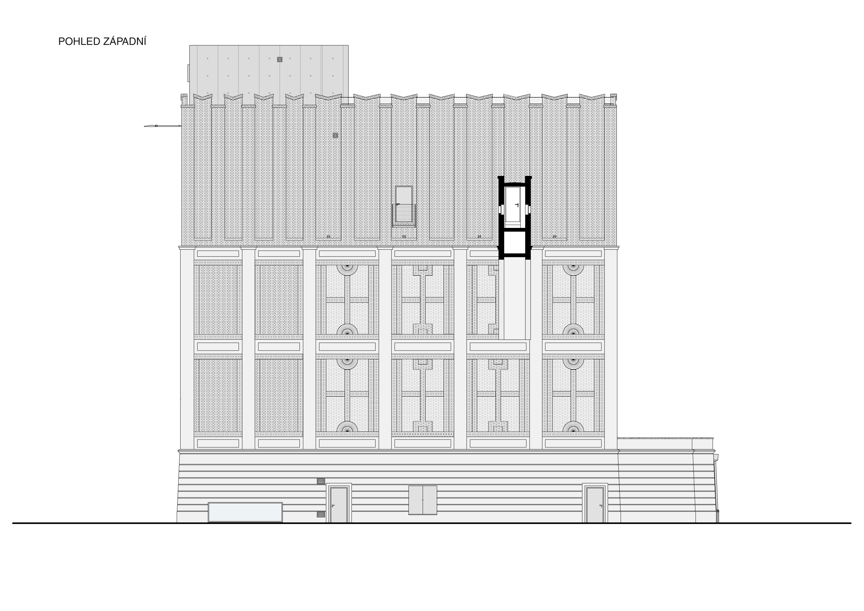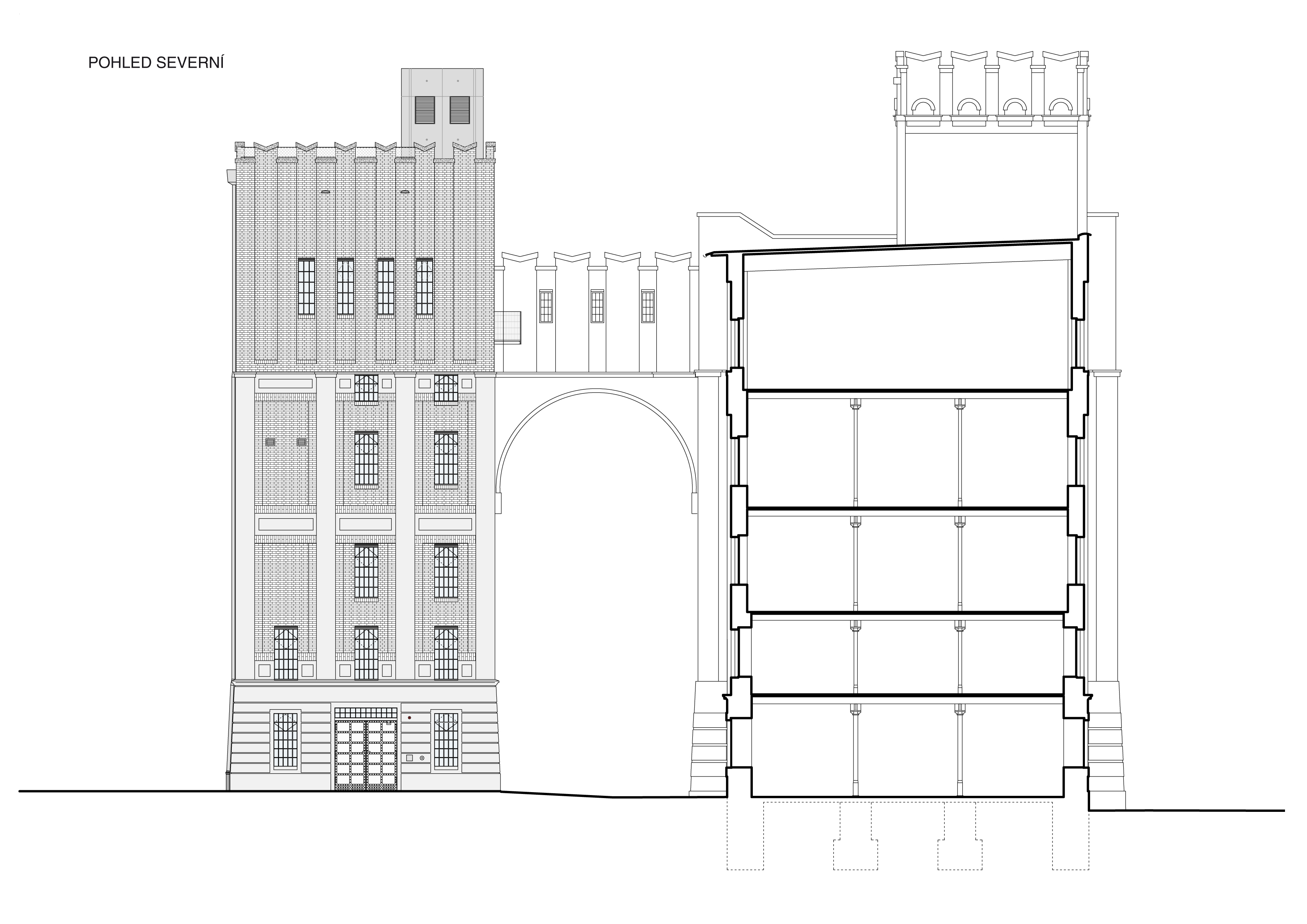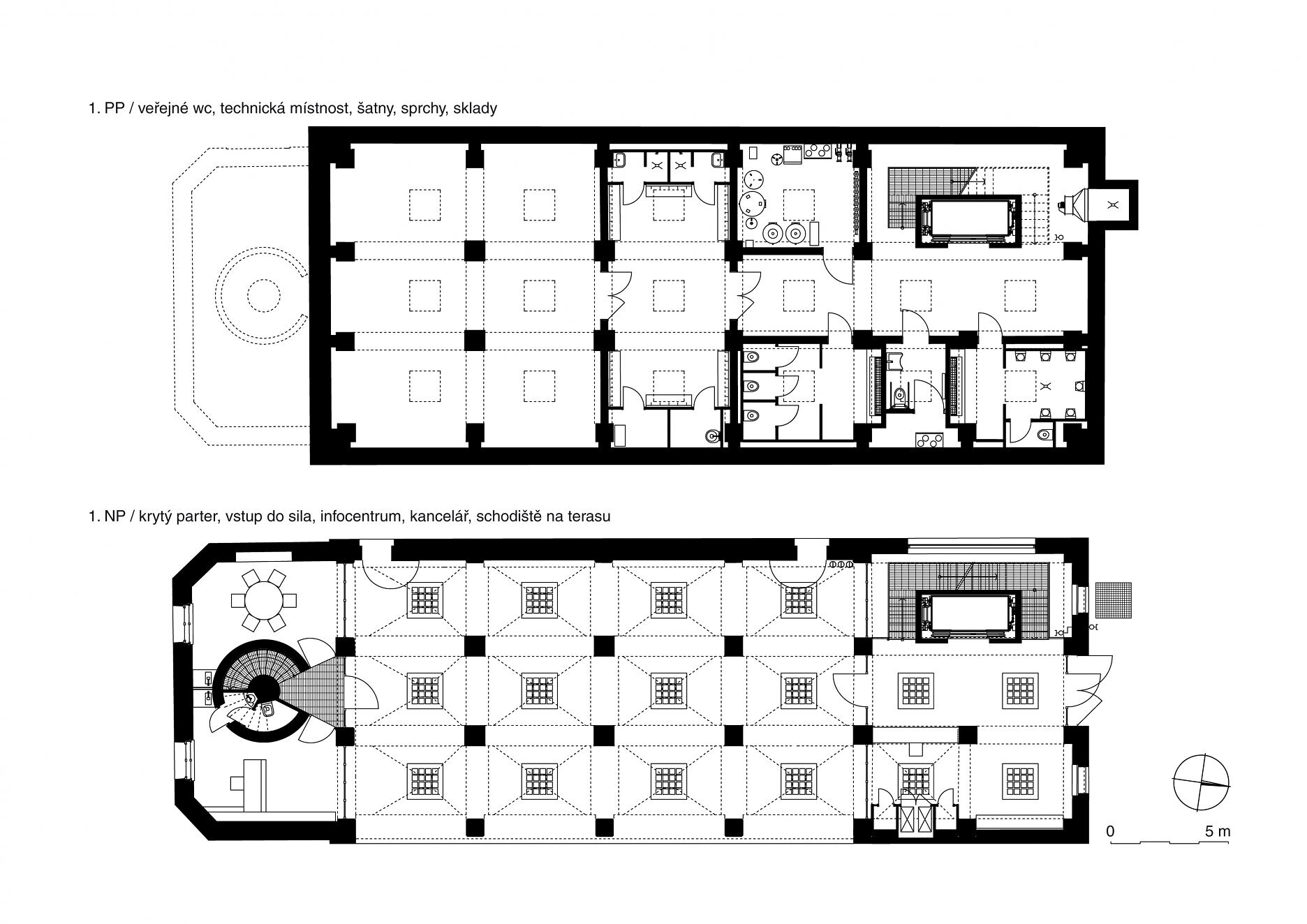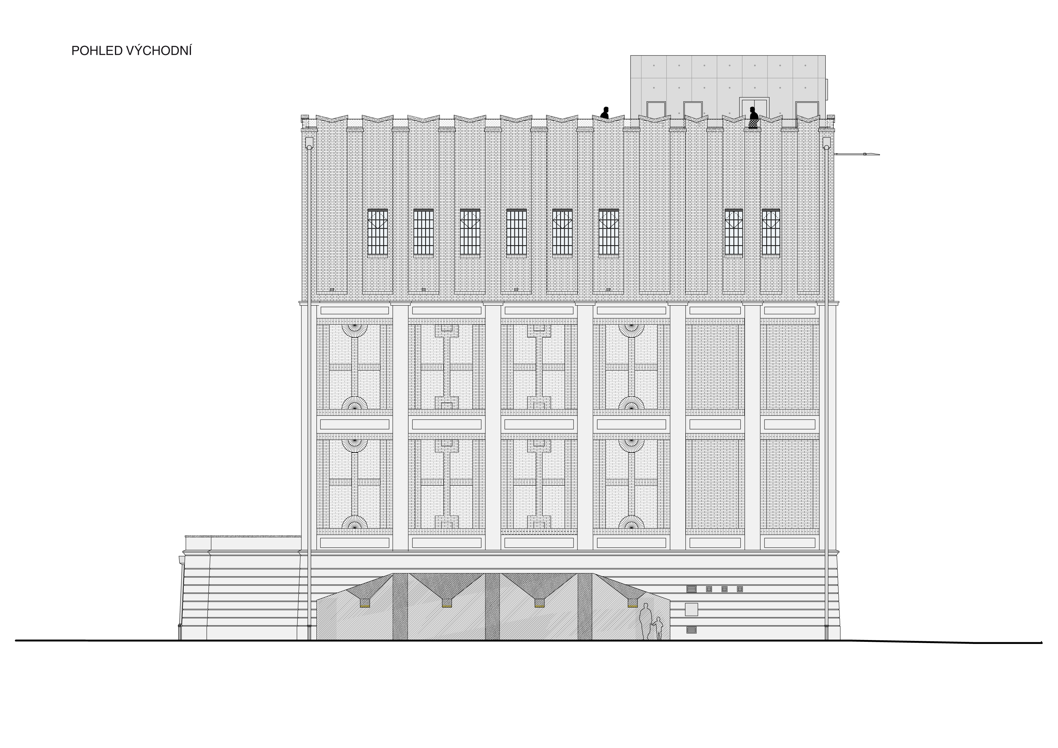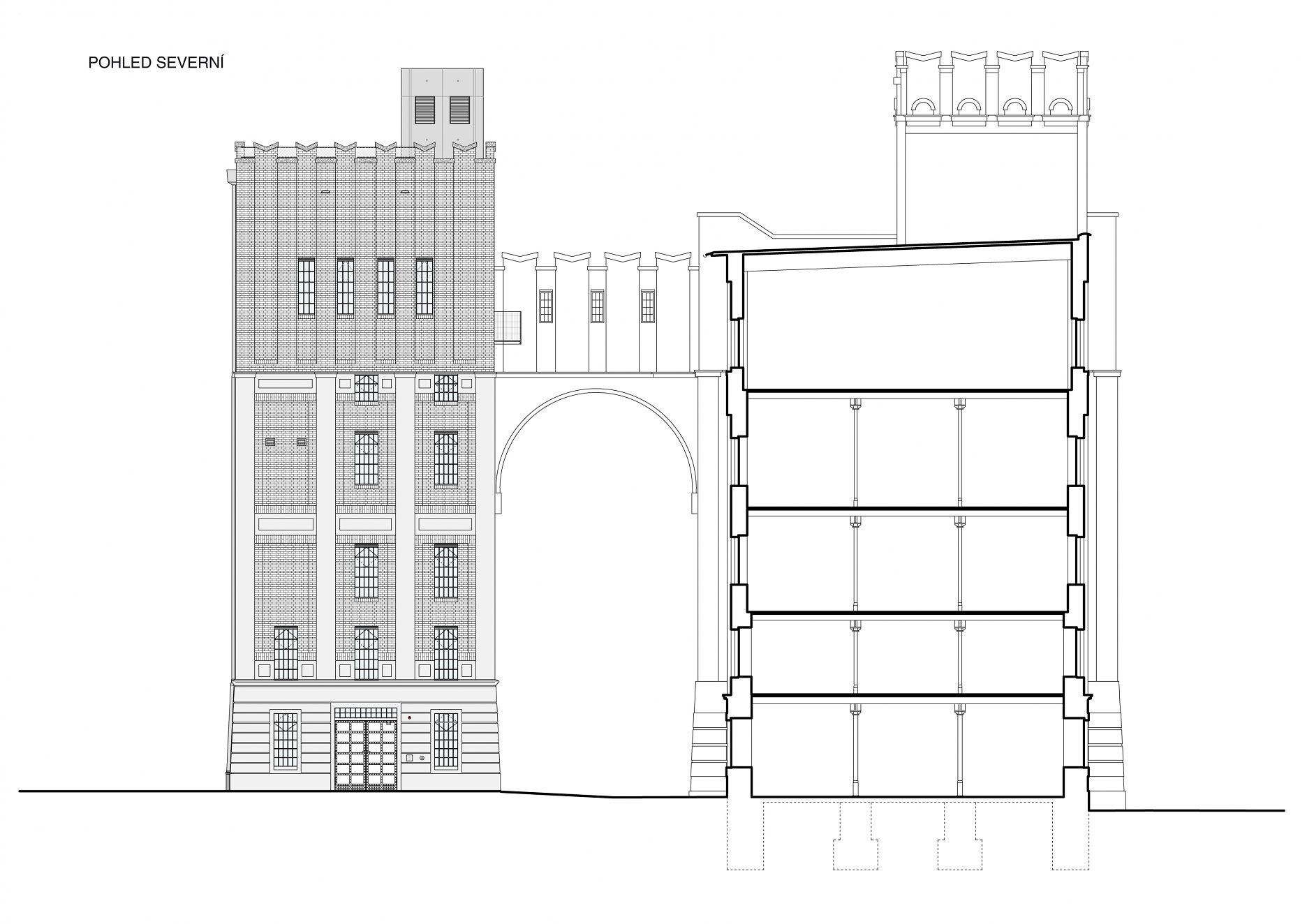 Najvýraznejším zásahom ateliéru Prokš Přikryl architekti je otvorenie stavby z oboch bočných strán a vytvorenie krytého podlubia v priestore pod násypníkmi. "Myšlenka otevření budovy do náměstí šla ruku v ruce s celkovým otevřením areálu městu po více než sto letech. Otevření bran, otevření parteru. Otevřeli jsme i cihelný sokl velkým otvorem, který byl doposud tajemně uzavřený. Odkryté zásobníky obilí daly krytému prostoru atmosféru. Ze strany mezi mlýny a silem je parter propojen v místech původních dveří. Z druhé strany je sokl naopak široce prolomen novým otvorem." vysvetľujú architekti.