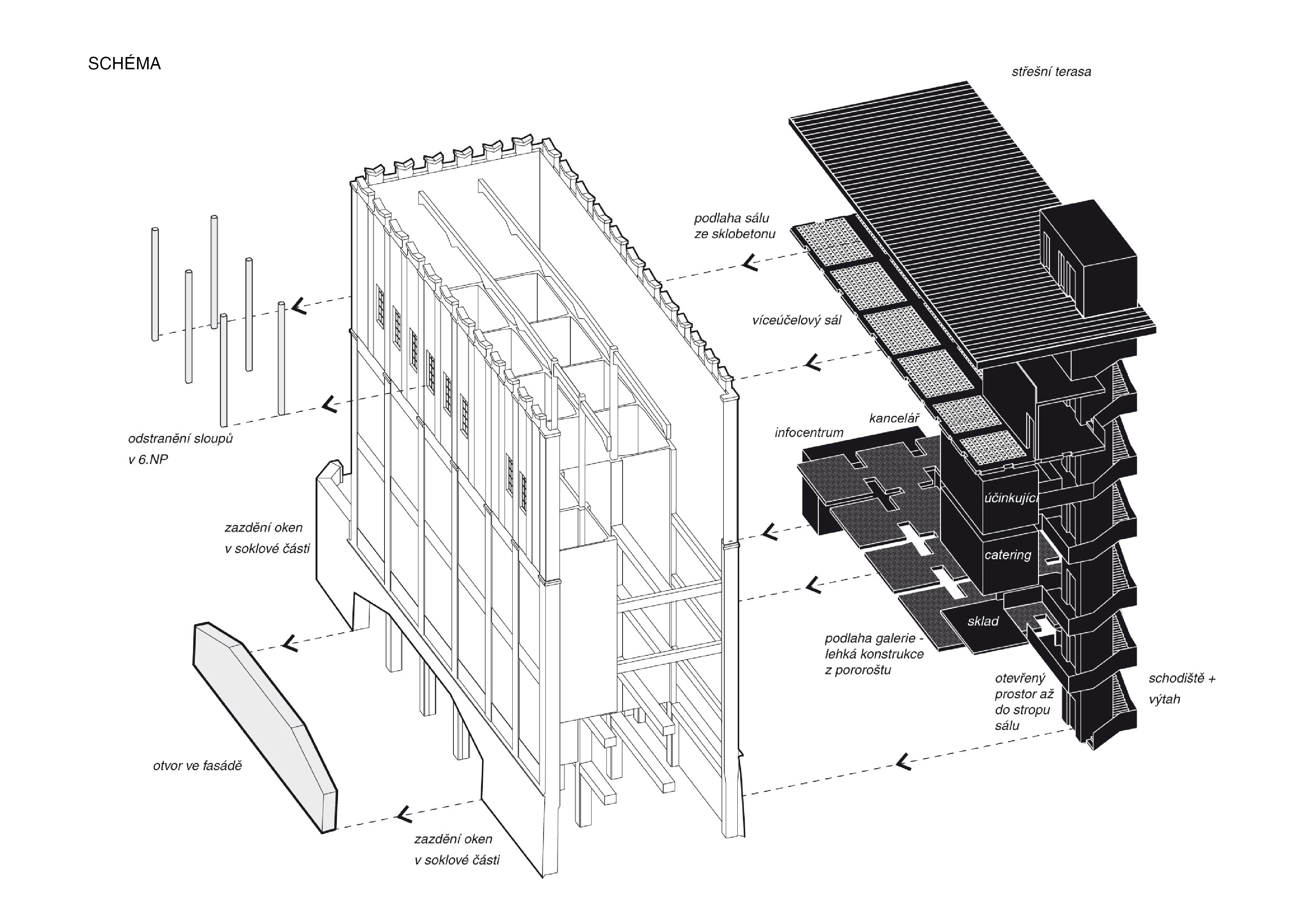 Rovnako ako v minulosti, aj dnes jednotlivé výškové úrovne sila spája jediné komunikačné jadro. Hlavnou zmenou je vloženie sály do bývalého technologického priestoru na šiestom podlaží. Tá má výsostnú polohu nad celým areálom. Spoločne so sálou je bezbariérovo sprístupnená aj strecha objektu.