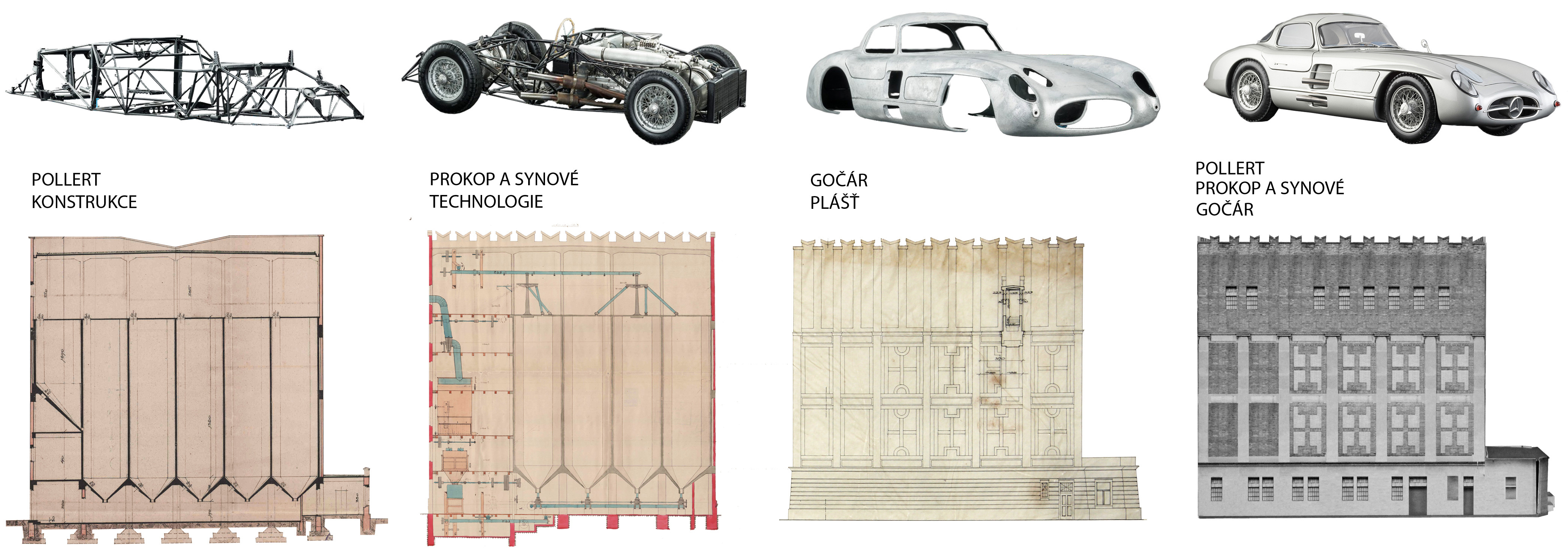 Objekt-stroj pôvodne tvorili tri základné časti: technológia (firma Prokop a synovia), skeletová konštrukcia (dielo staviteľa Pollerta) a vonkajší plášť (architekt Josef Gočár). Práve vďaka Josefovi Gočárovi, ktorý patrí medzi kľučových českých autorov XX. storočia, nevnímajú stavbu obyvatelia mesta iba ako jeden z mnohých industriálnych objektov. Už krátko po výstavbe si zvykli na neho ako na významnú súčasť architektonickej identity sídla.
