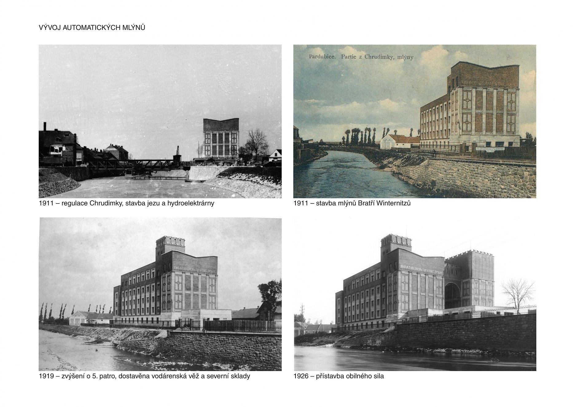 Národná kultúrna pamiatka Winternitzovy automatické mlýny patrí medzi prvé realizácie Josefa Gočára. Dve porovnateľne výrazné etapy výstavby v rokoch 1910 - 1911 a 1920 - 1924 reflektujú vývoj dobových architektonických tendencií. Od ranej moderny k národnému slohu - paralelne k dvom fázam pohonu mlyna vodnou a elektrickou energiou. V prvej etape vytvoril Gočár lapidárnu hmotu mlyna pozdĺž rieky Chrudimka. Neskôr k nej pridal najvyššie poschodie. Pribudli tiež dve veže, prepojené oblúkovým premostením do podoby mýtickej Ištarinej brány - vodárenská veža a samostatná veža sila. Až v spomínanej druhej fáze dopĺňa architekt stavbu cimburím geometricky abstrahovaných lastovičích chvostov.
