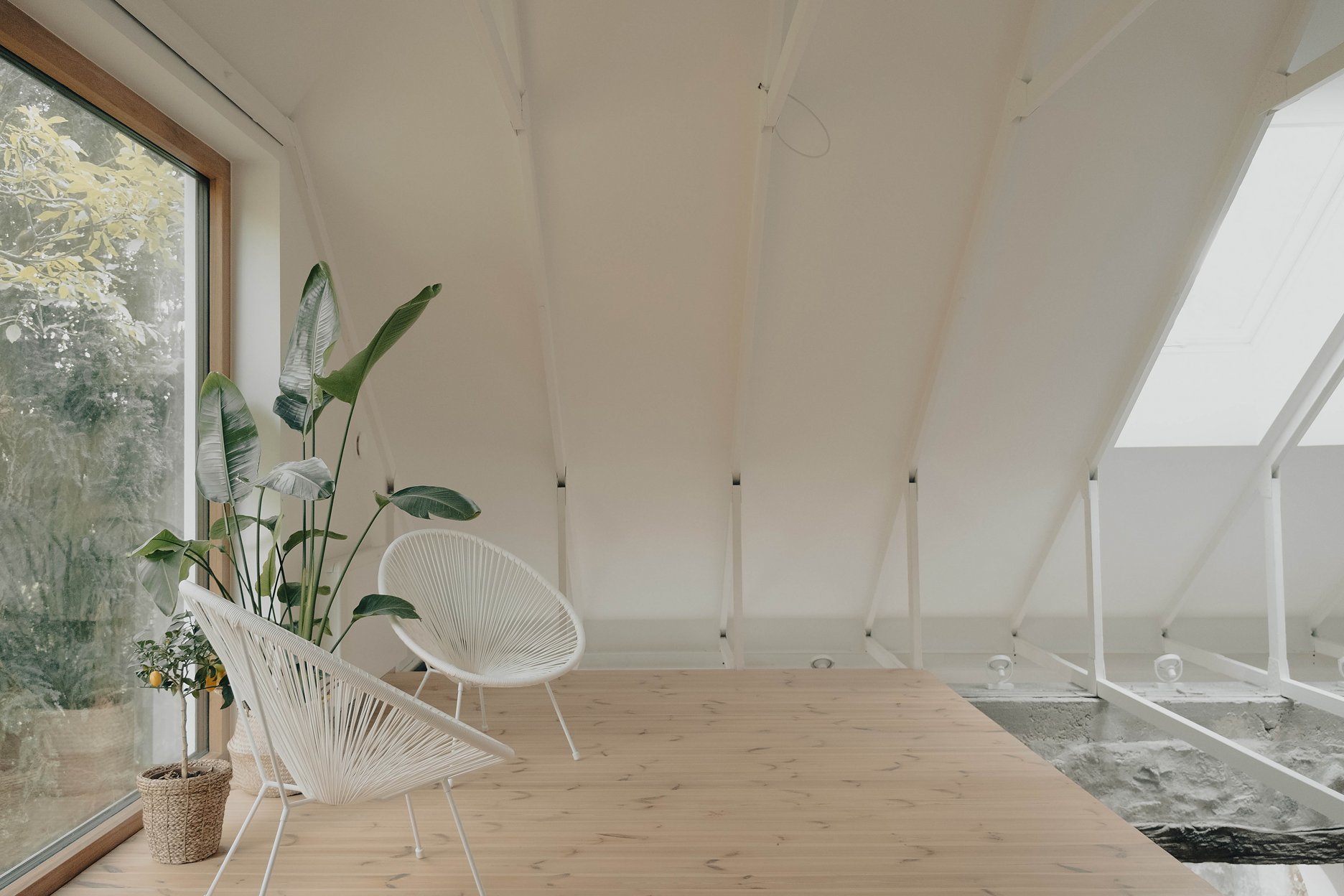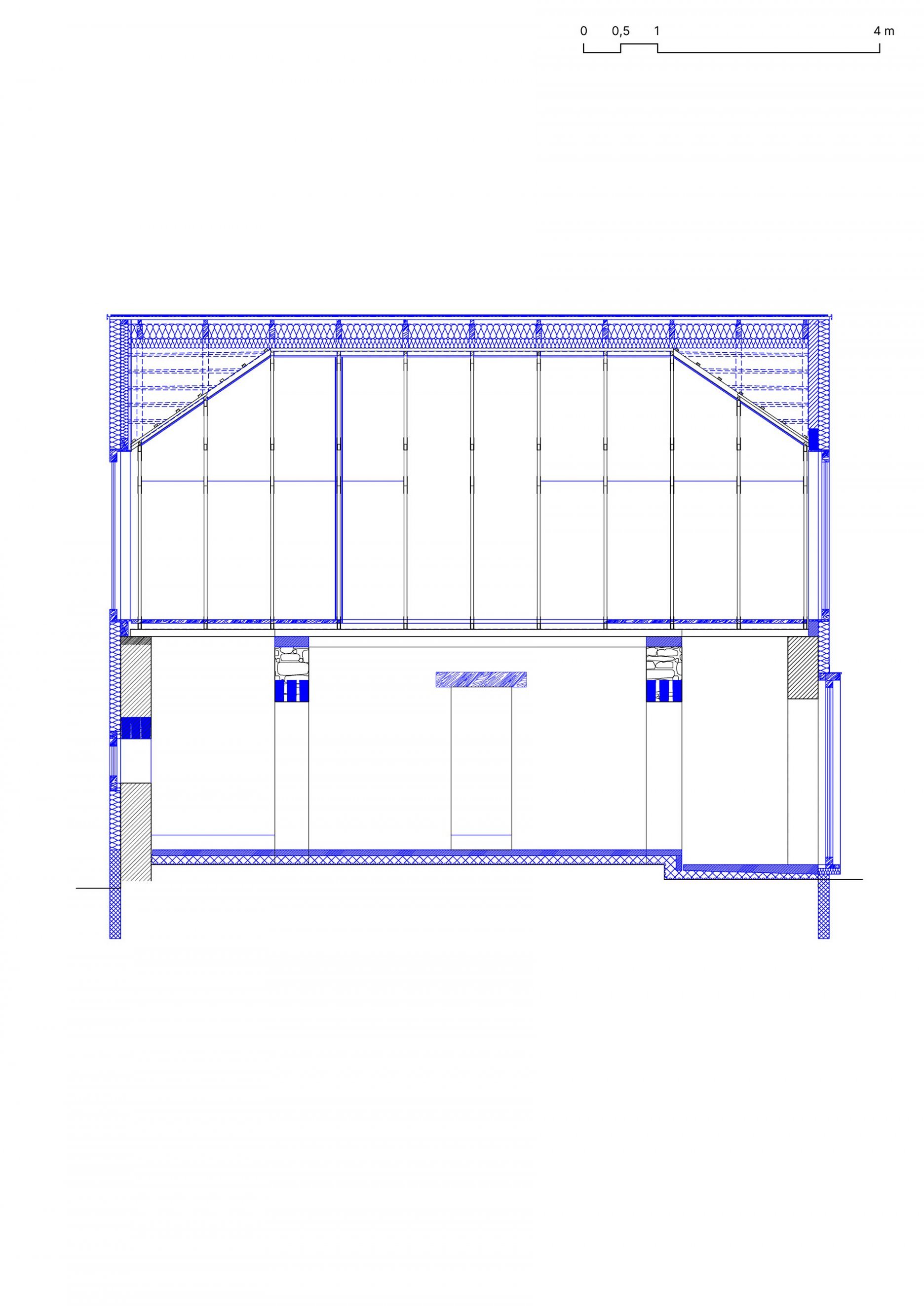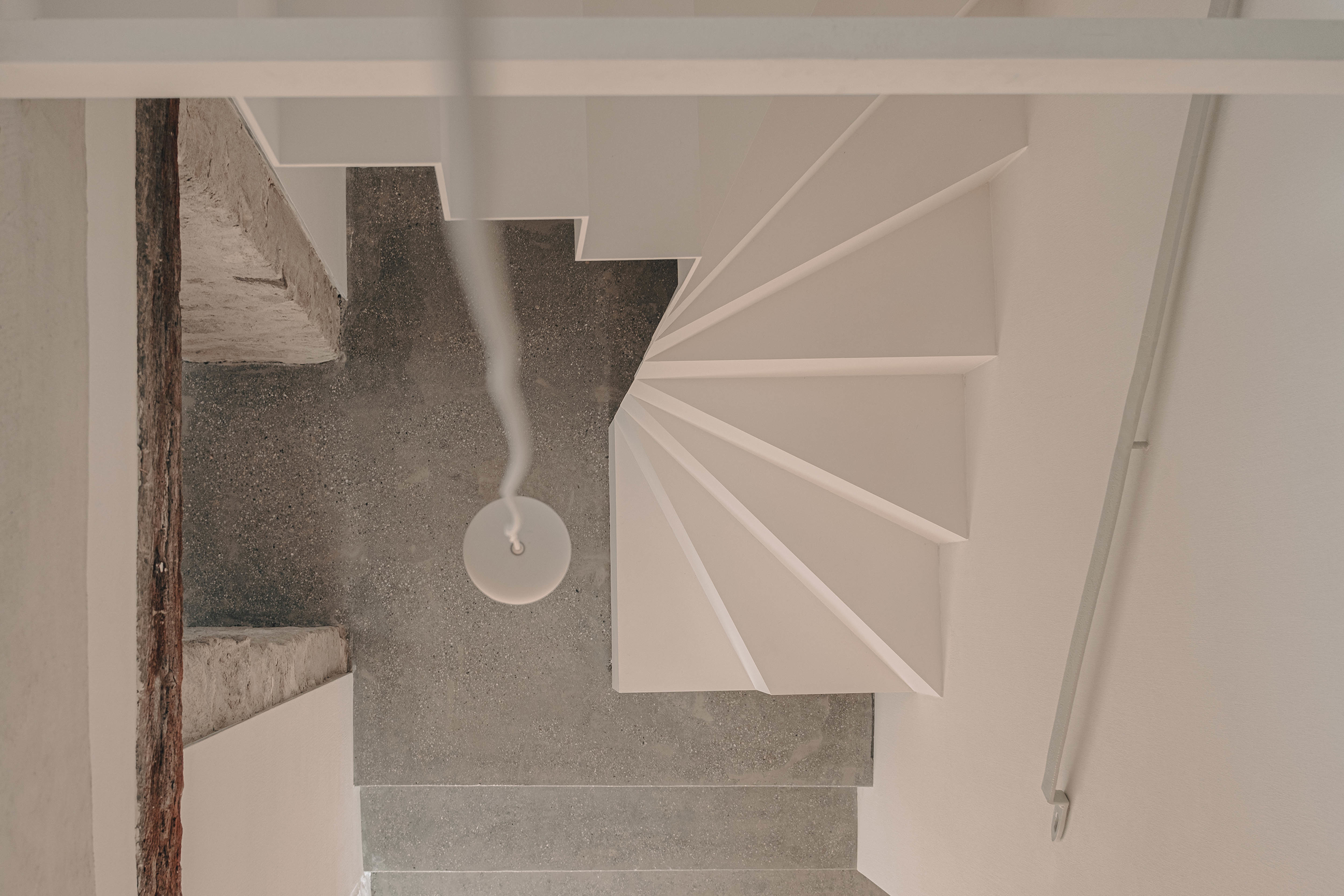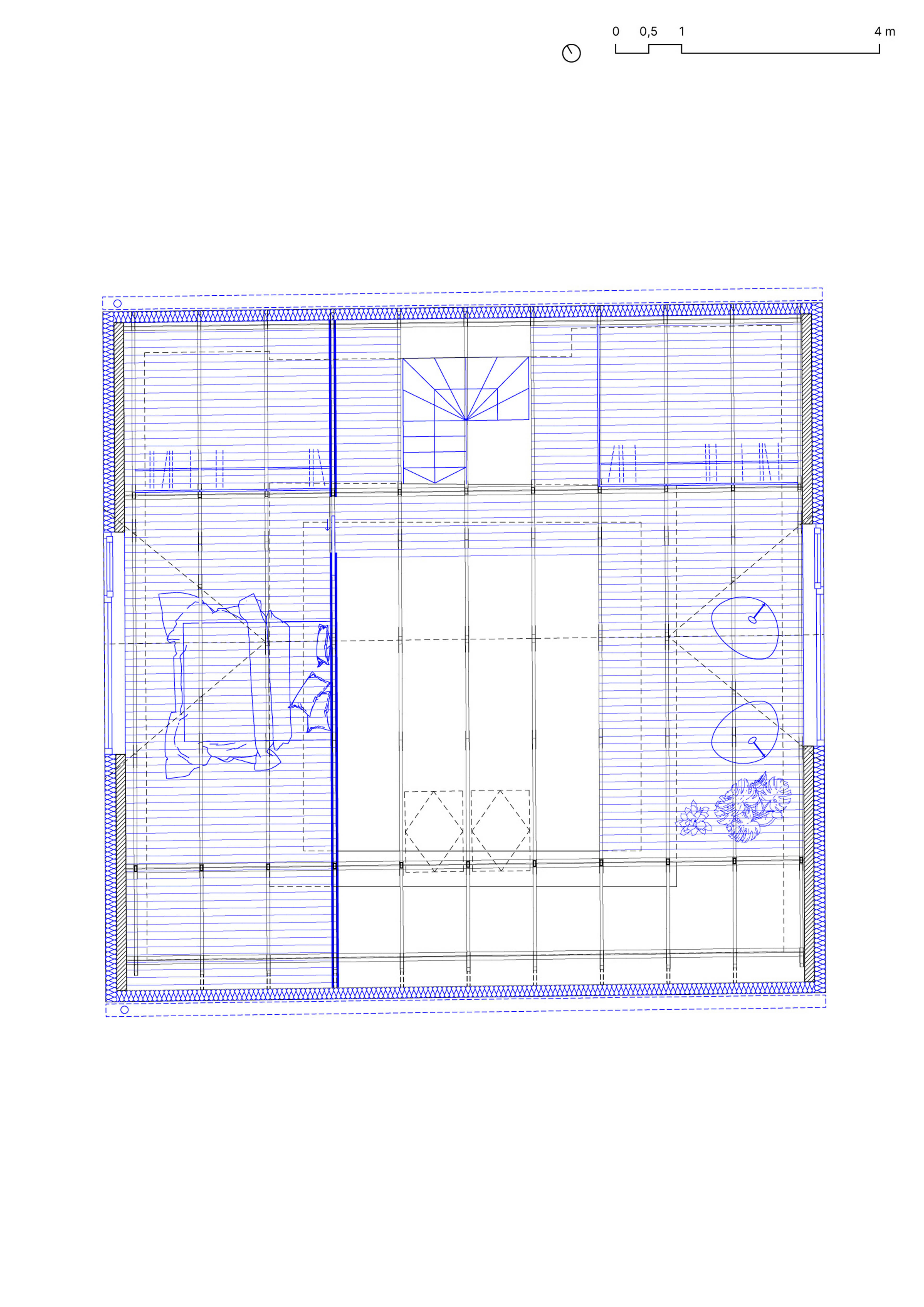 Nočnú zónu na poschodí sprístupňuje kompaktné schodisko. Priestor nad vloženou galériou definuje zachovaná nezvyčajná oceľová konštrukcia krovu. Predsadená rovina tepelnej izolácie a zasklenia definuje novú hranicu medzi interiérom a exteriérom, pričom rámuje kolonádu v nových obdĺžnikových prehľadoch.