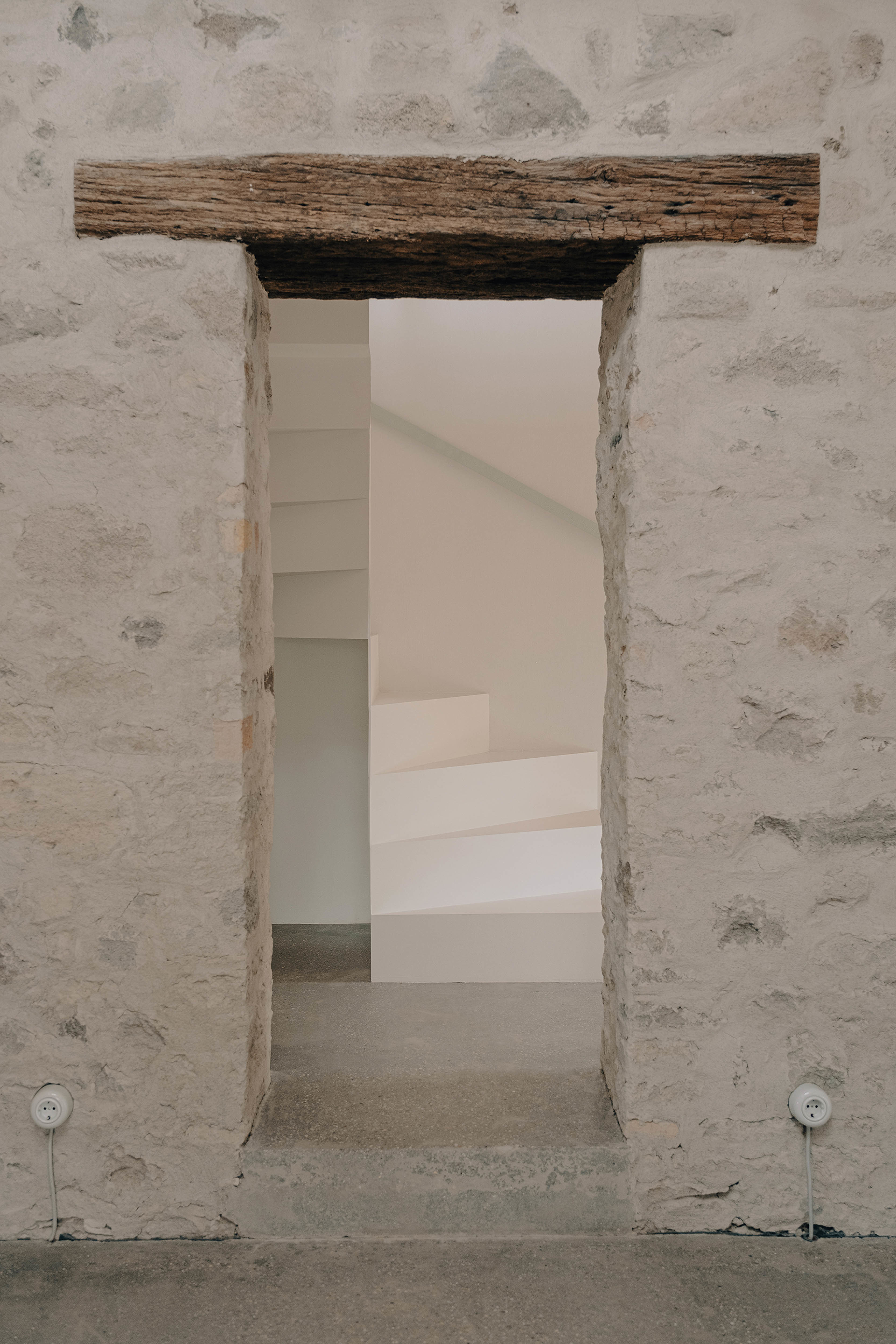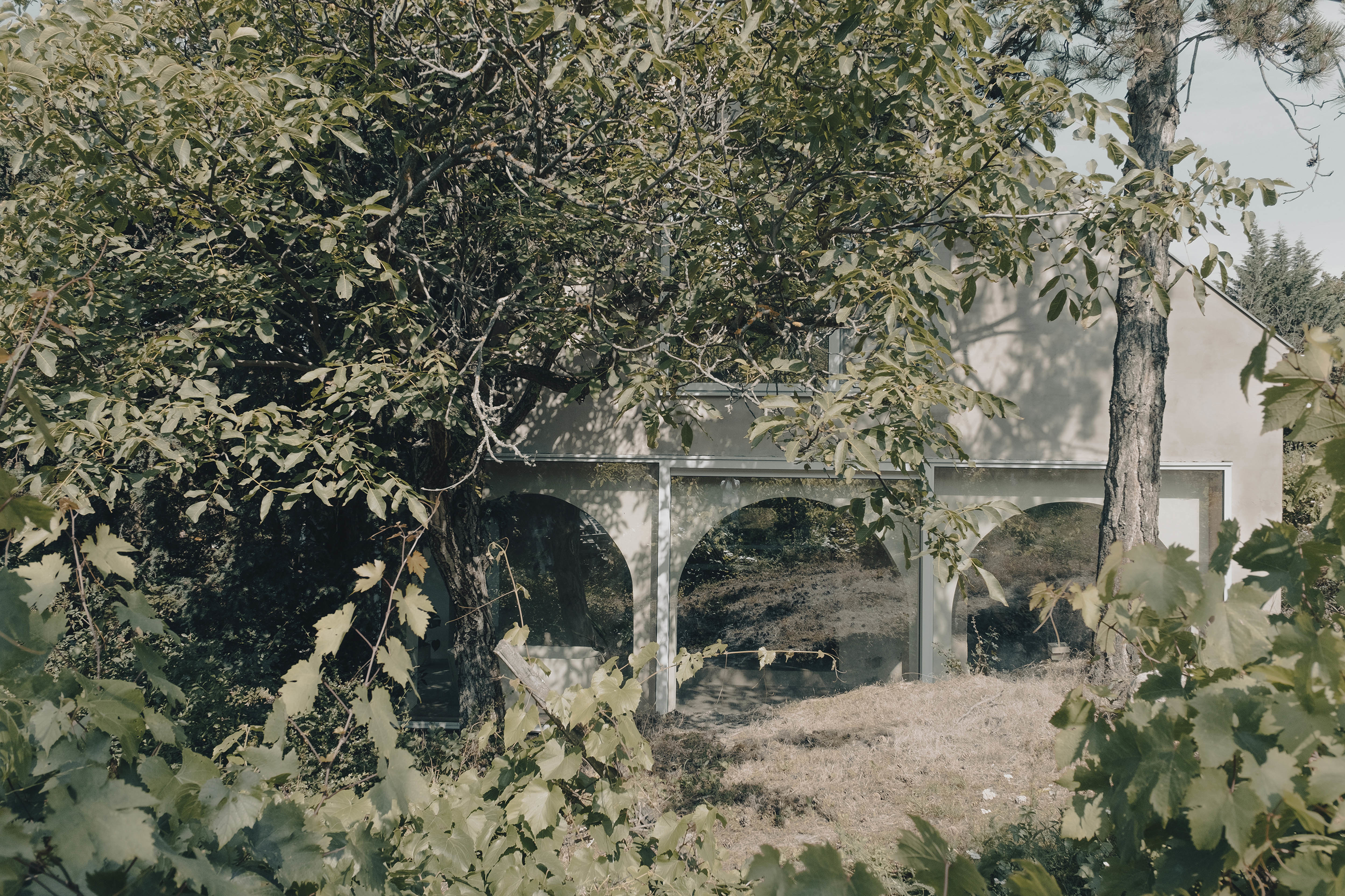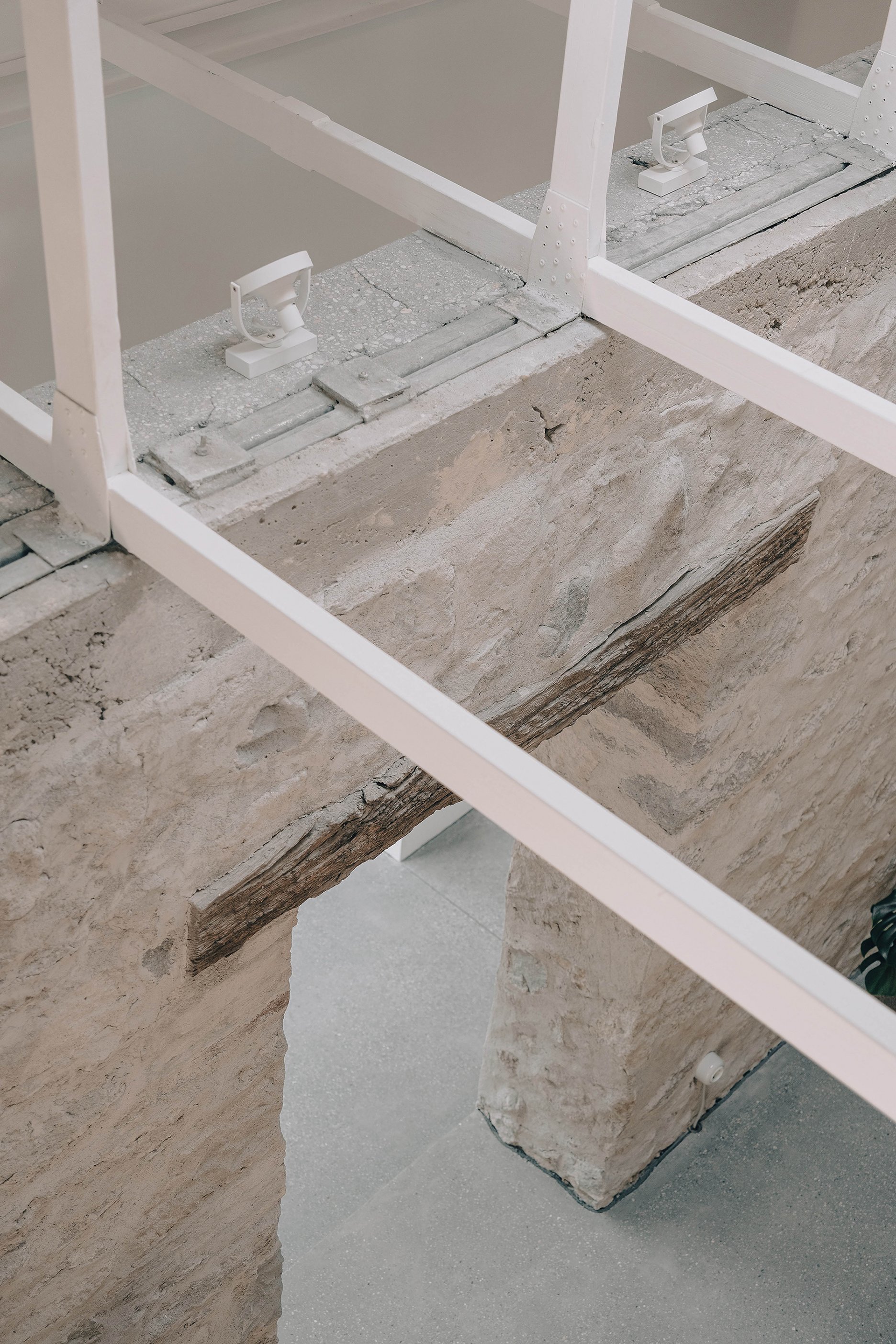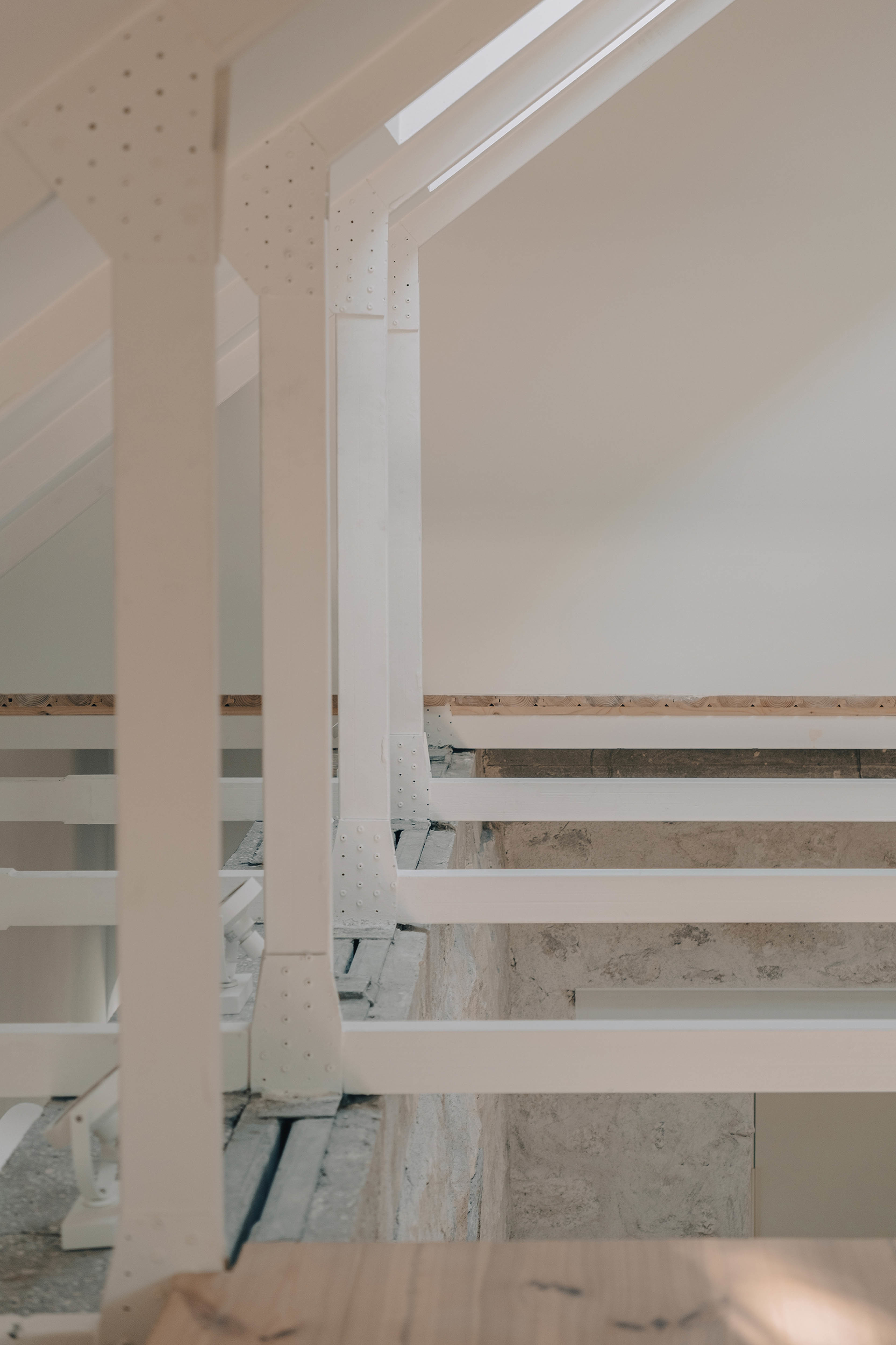 Nočnú zónu na poschodí sprístupňuje kompaktné schodisko. Priestor nad vloženou galériou definuje zachovaná nezvyčajná oceľová konštrukcia krovu. Predsadená rovina tepelnej izolácie a zasklenia definuje novú hranicu medzi interiérom a exteriérom, pričom rámuje kolonádu v nových obdĺžnikových prehľadoch.