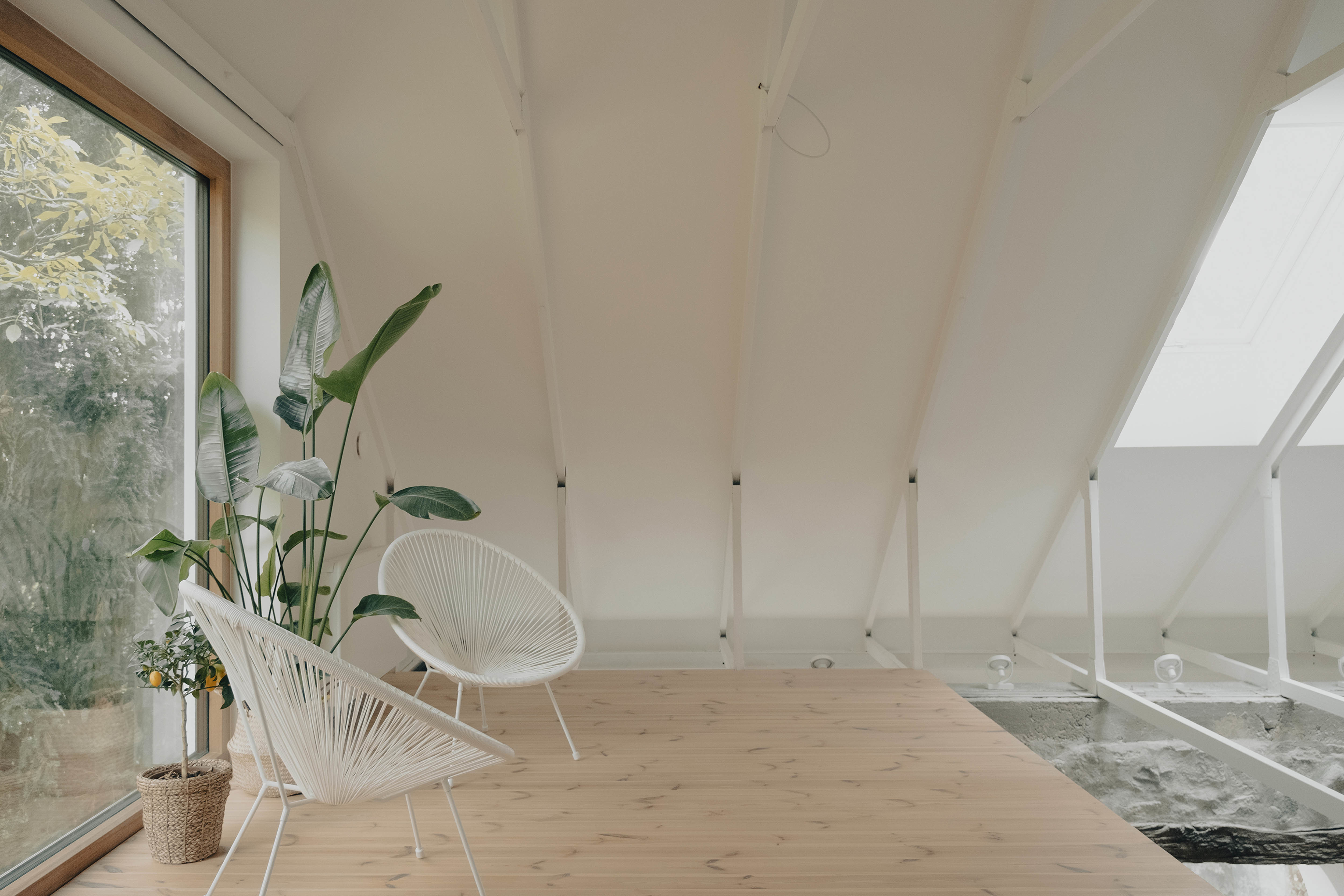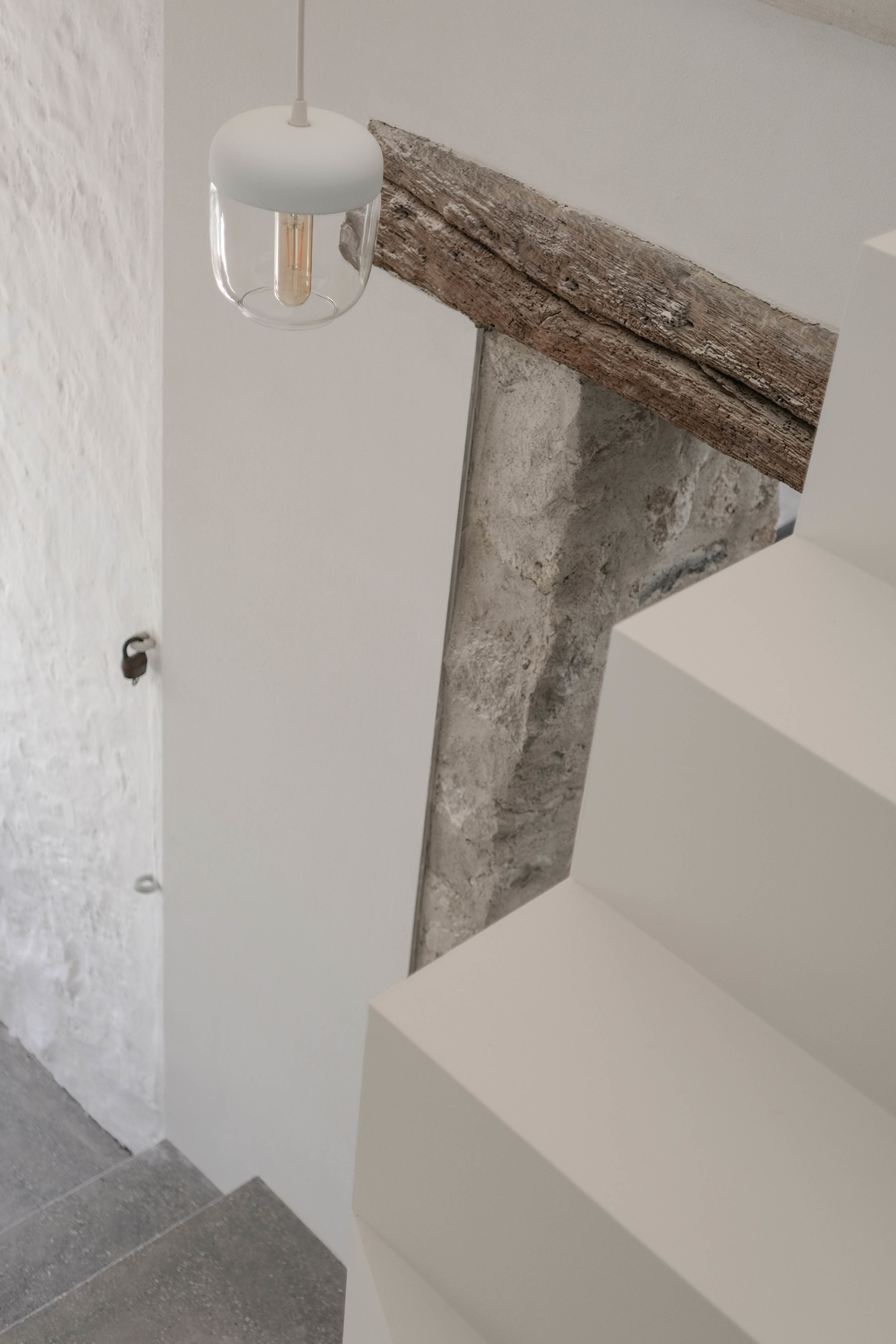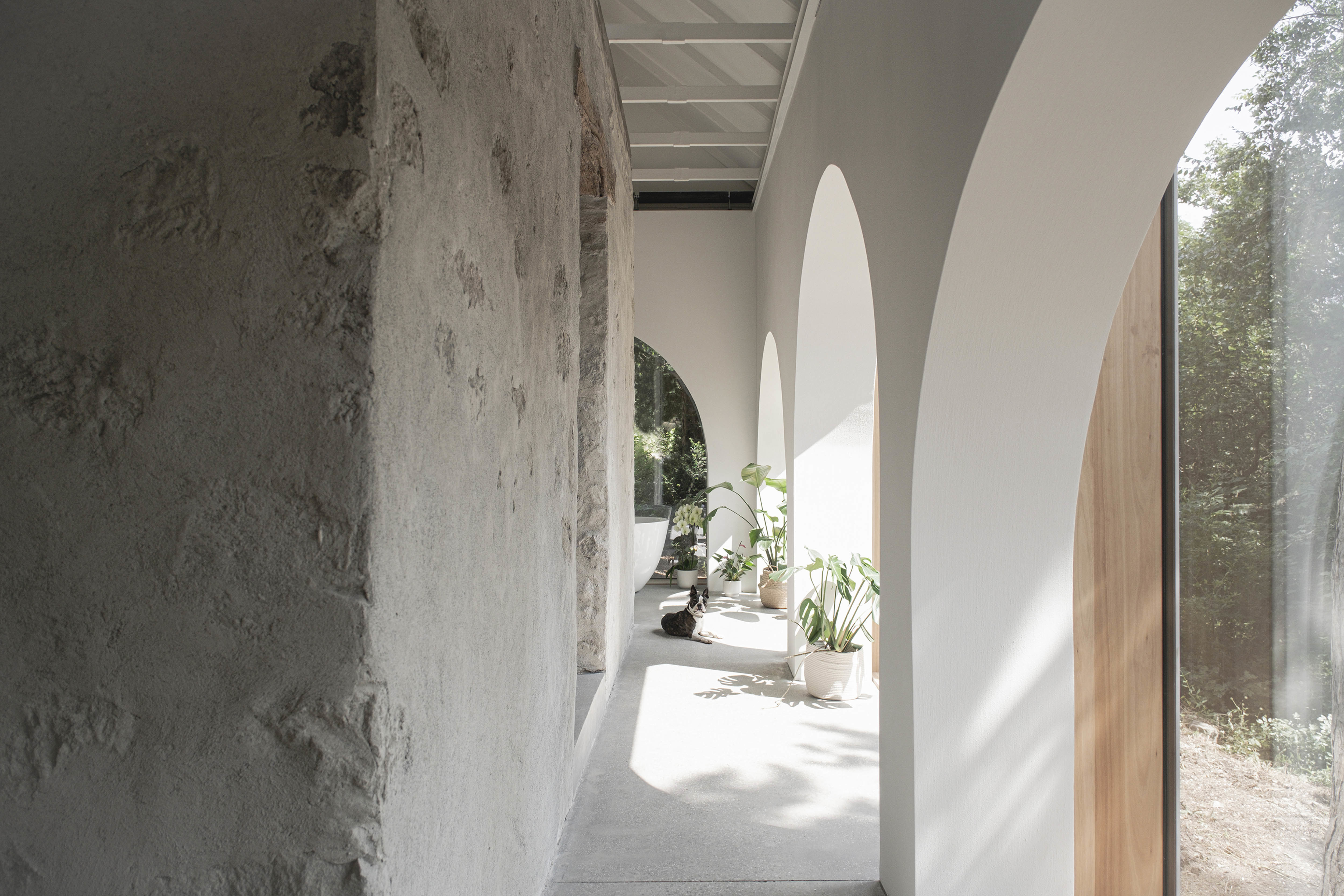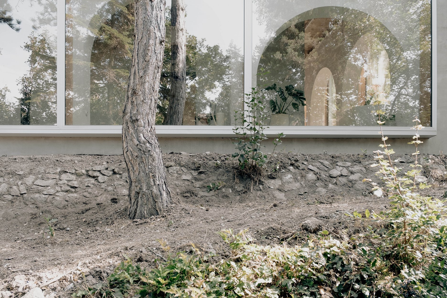 Nočnú zónu na poschodí sprístupňuje kompaktné schodisko. Priestor nad vloženou galériou definuje zachovaná nezvyčajná oceľová konštrukcia krovu. Predsadená rovina tepelnej izolácie a zasklenia definuje novú hranicu medzi interiérom a exteriérom, pričom rámuje kolonádu v nových obdĺžnikových prehľadoch.