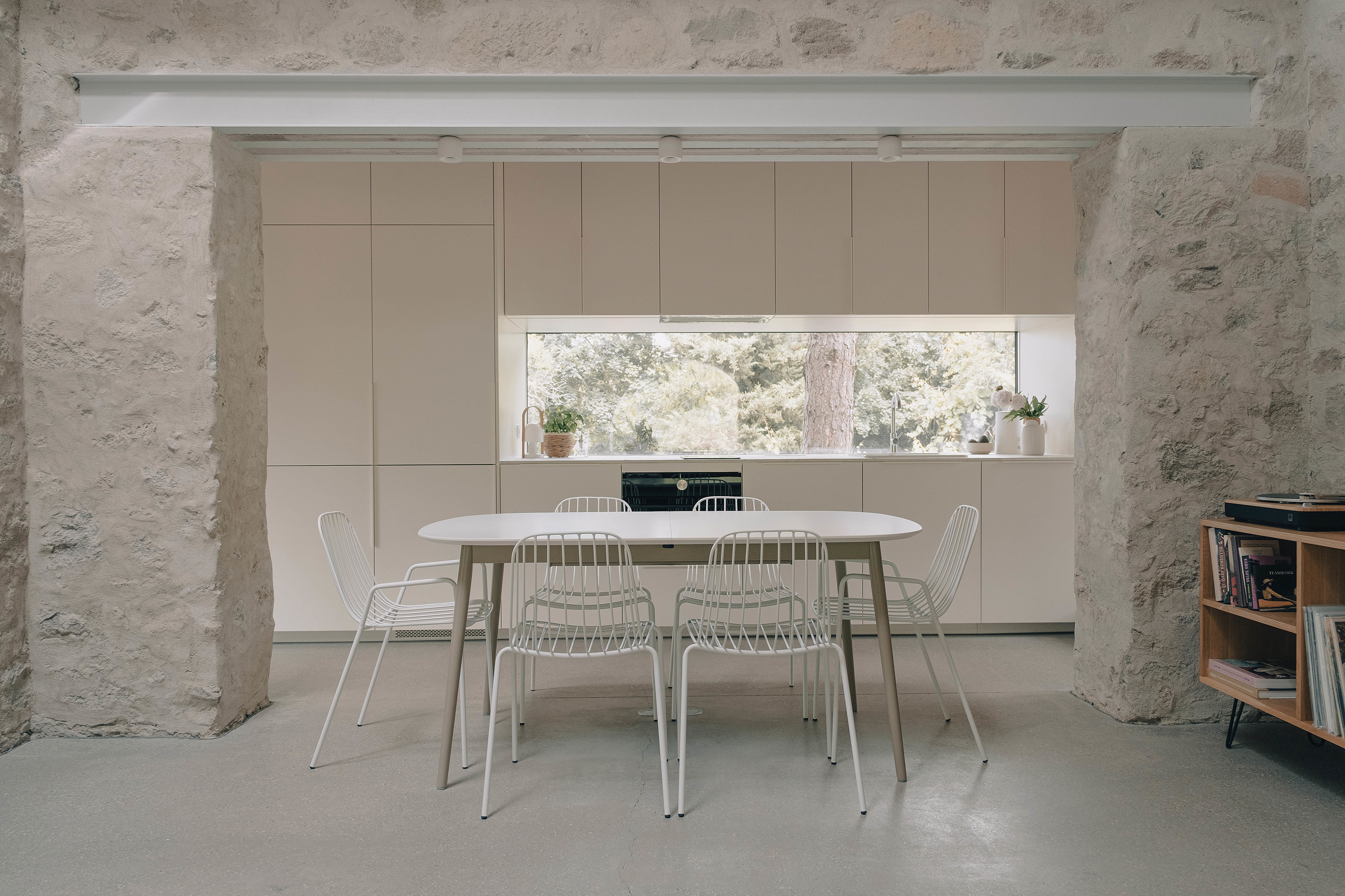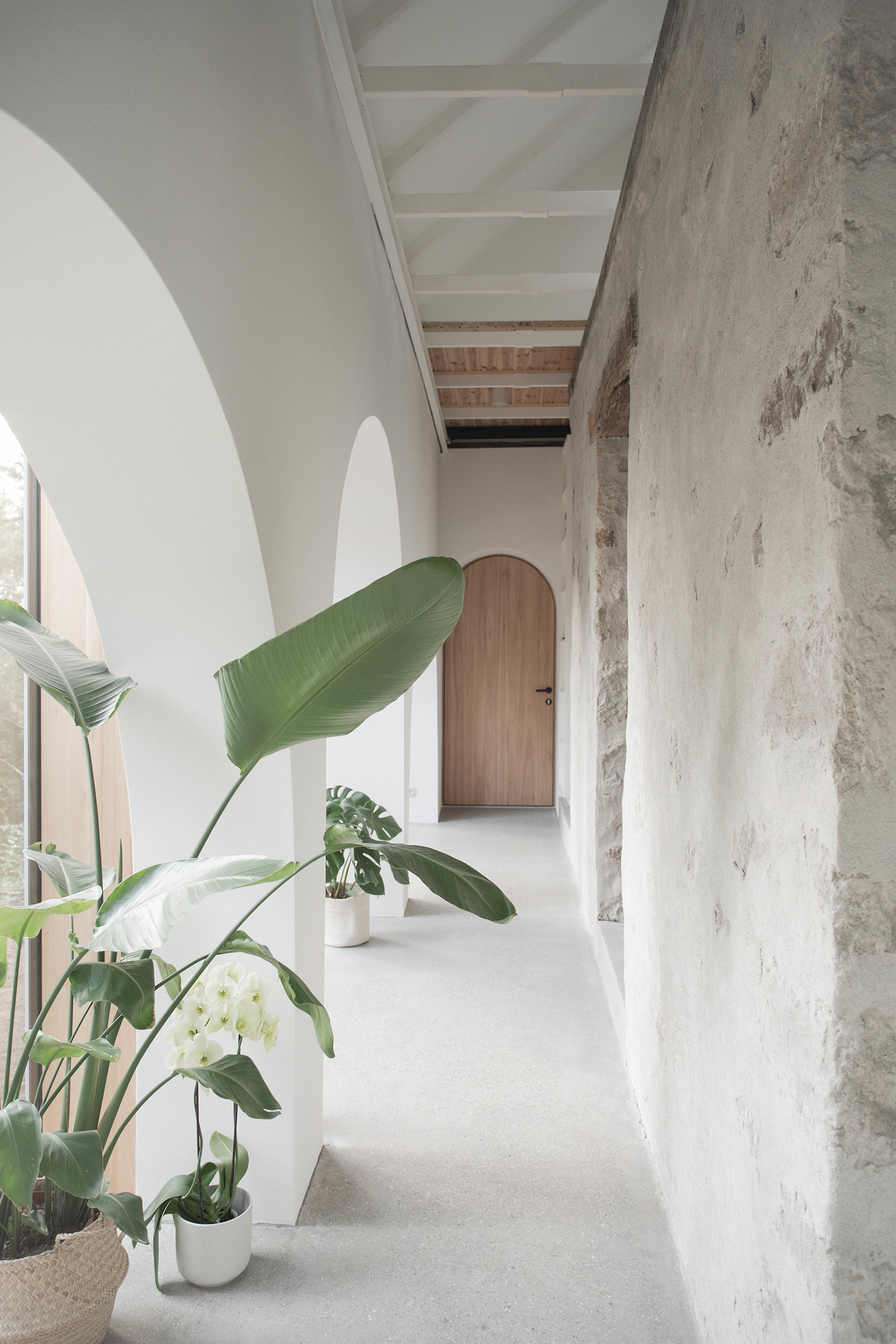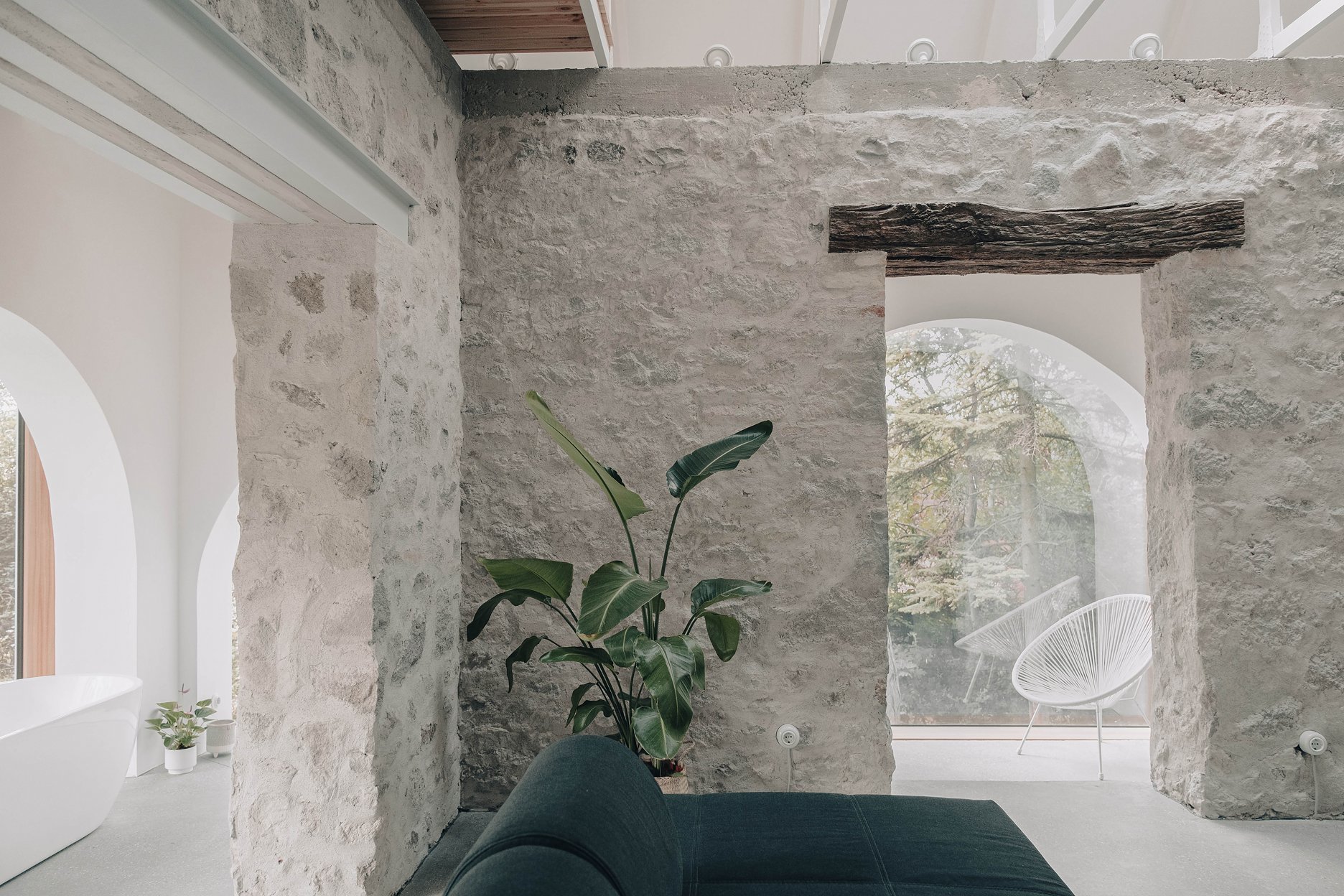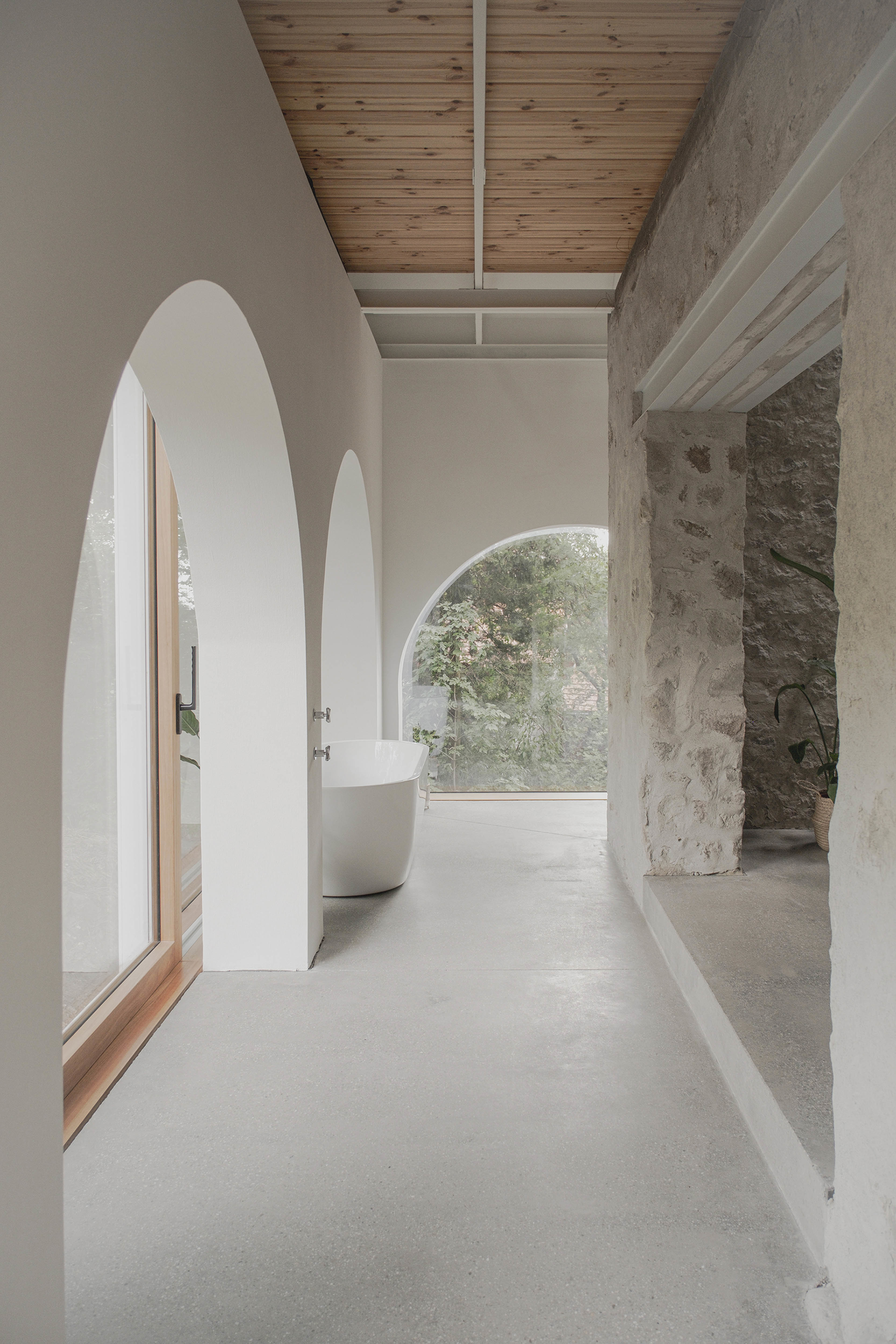 Nočnú zónu na poschodí sprístupňuje kompaktné schodisko. Priestor nad vloženou galériou definuje zachovaná nezvyčajná oceľová konštrukcia krovu. Predsadená rovina tepelnej izolácie a zasklenia definuje novú hranicu medzi interiérom a exteriérom, pričom rámuje kolonádu v nových obdĺžnikových prehľadoch.