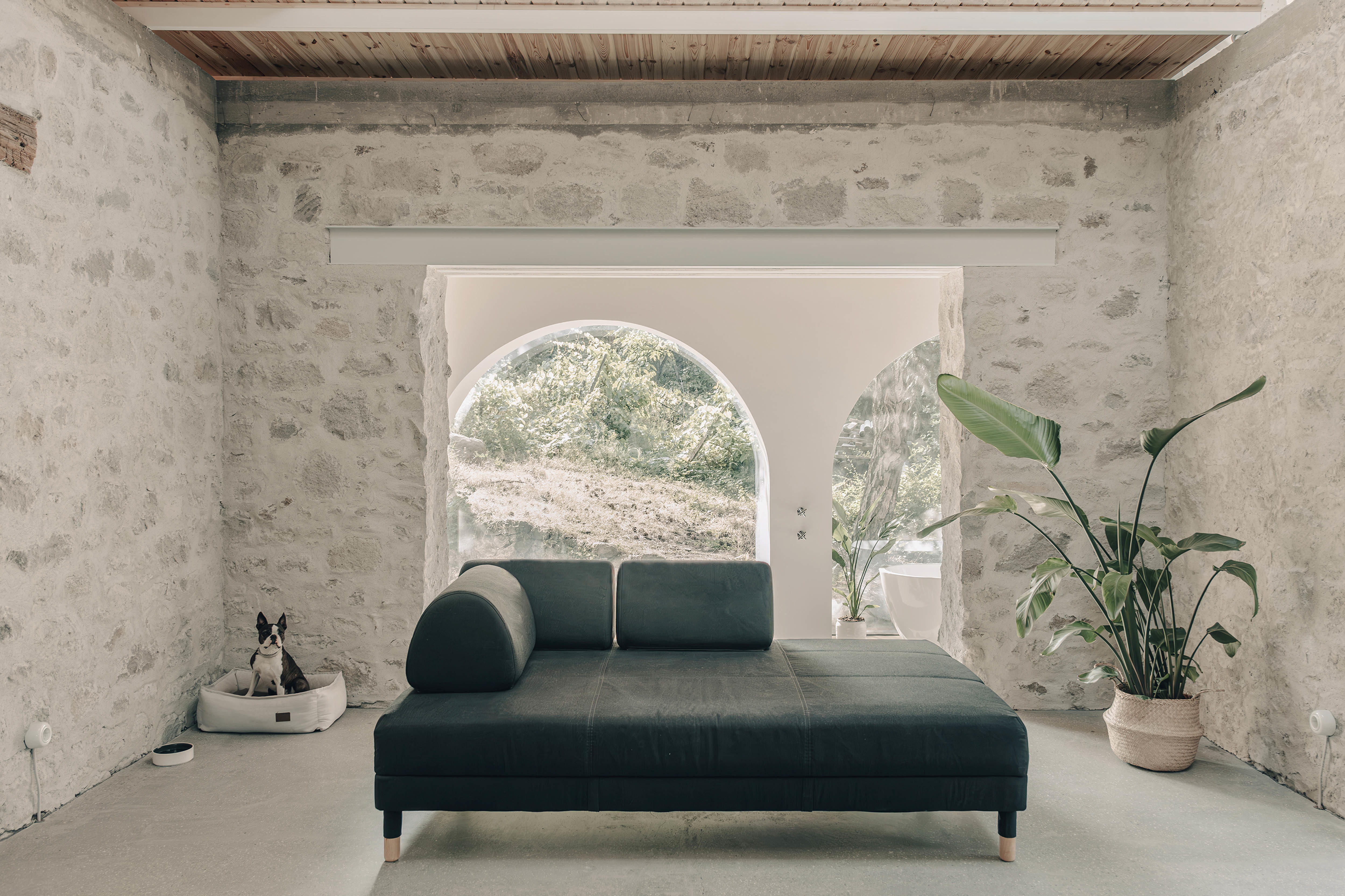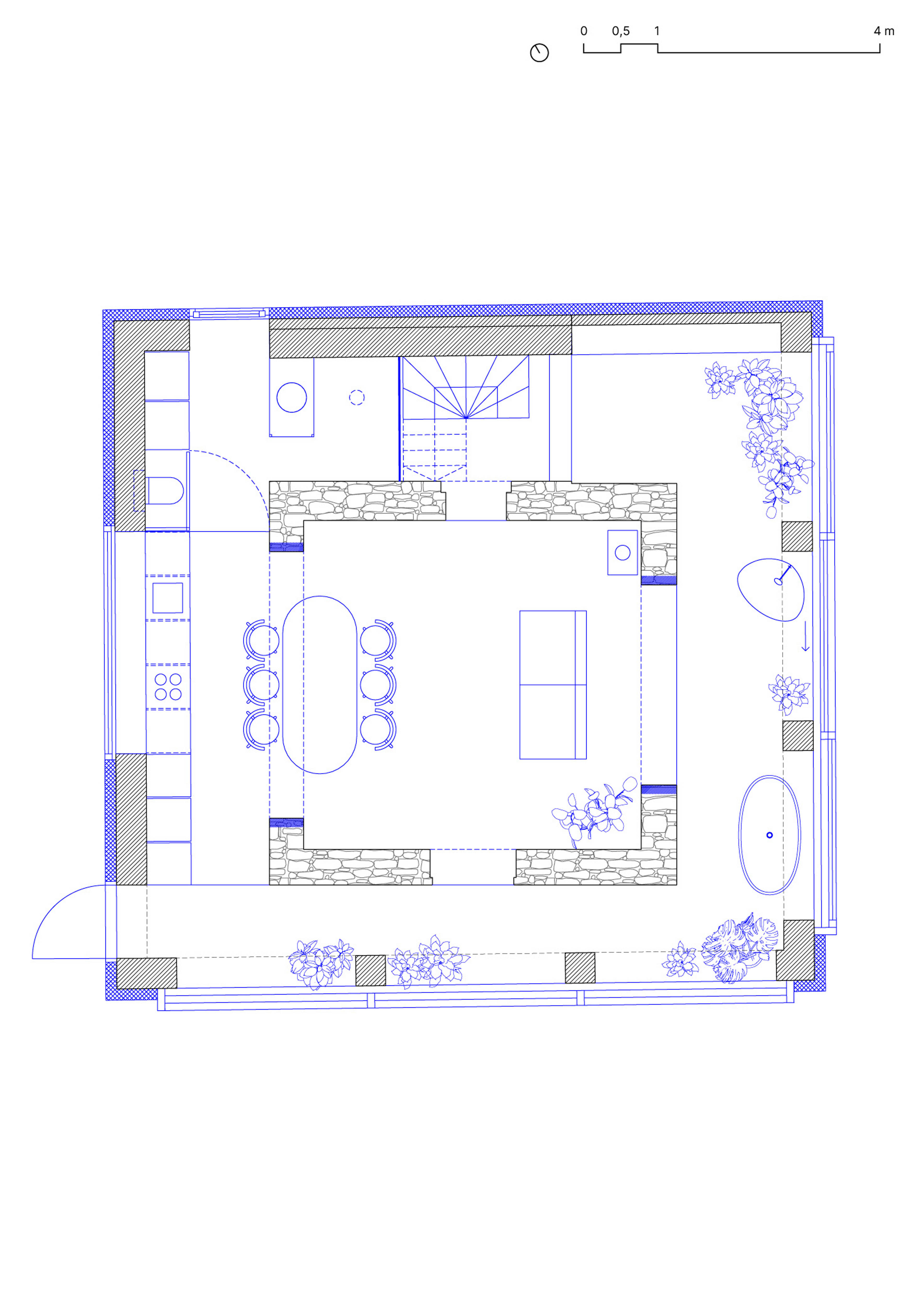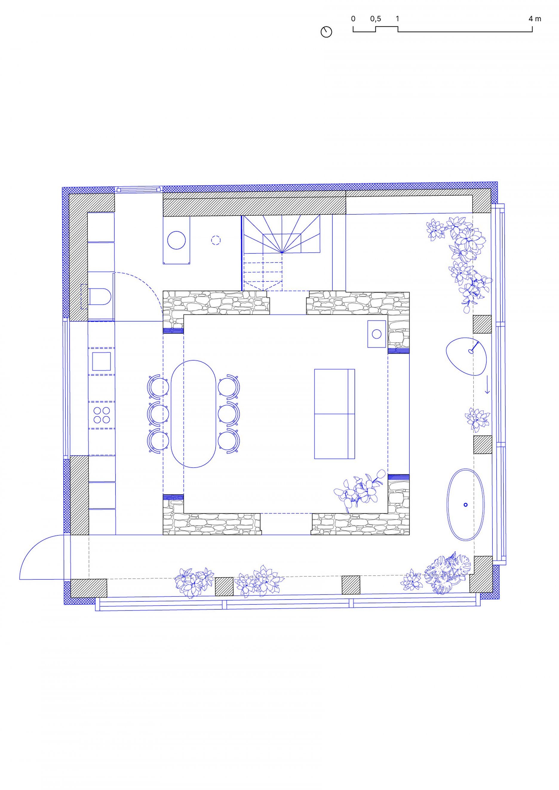 Dispozičné riešenie napĺňa všetky požiadavky manželského páru a ich psa Zary. Múry pôvodného skladu vymedzujú hlavný obytný priestor v centre dispozície. Priestor medzi stenami bývalého skladu a predsadenou kolonádou integruje všetky potrebné obslužné funkcie. Aj vďaka priamemu prepojeniu s “jadrom” dispozície a exteriérom však nepôsobí ako podradné zázemie. Spomínané zóny zjednocuje betónová liata podlaha. Rozdielne výšky podlahy zohľadňujú východiskový stav.