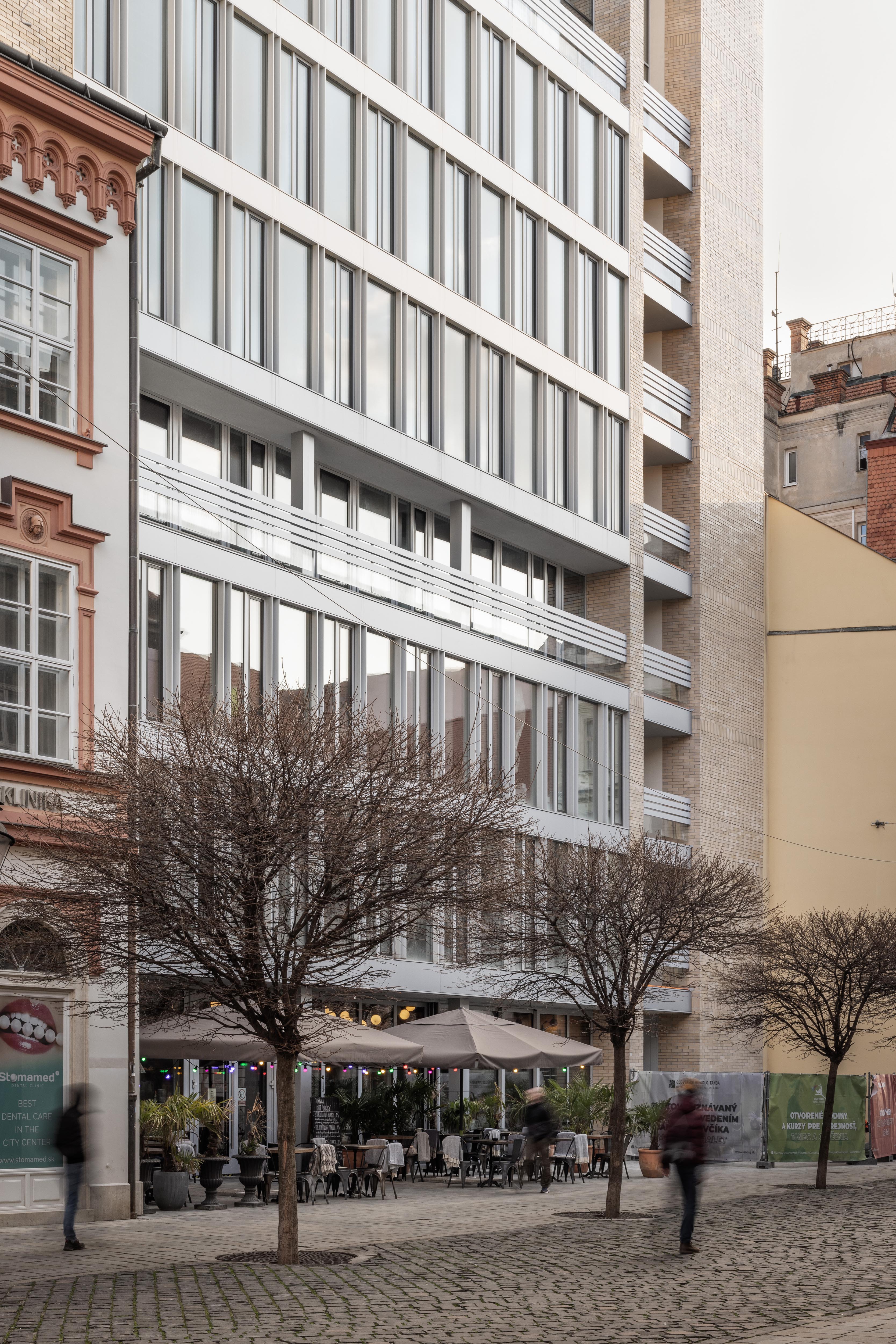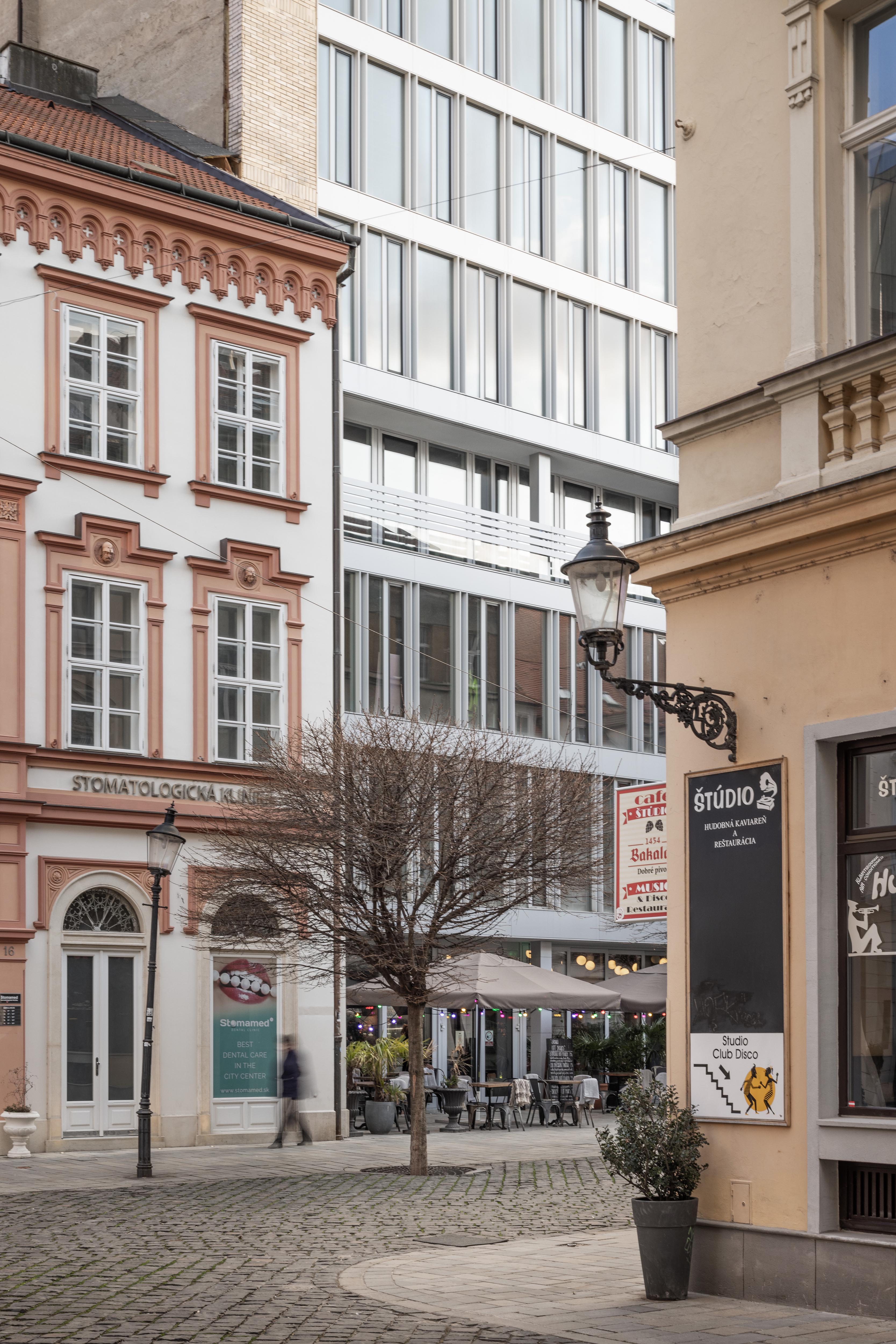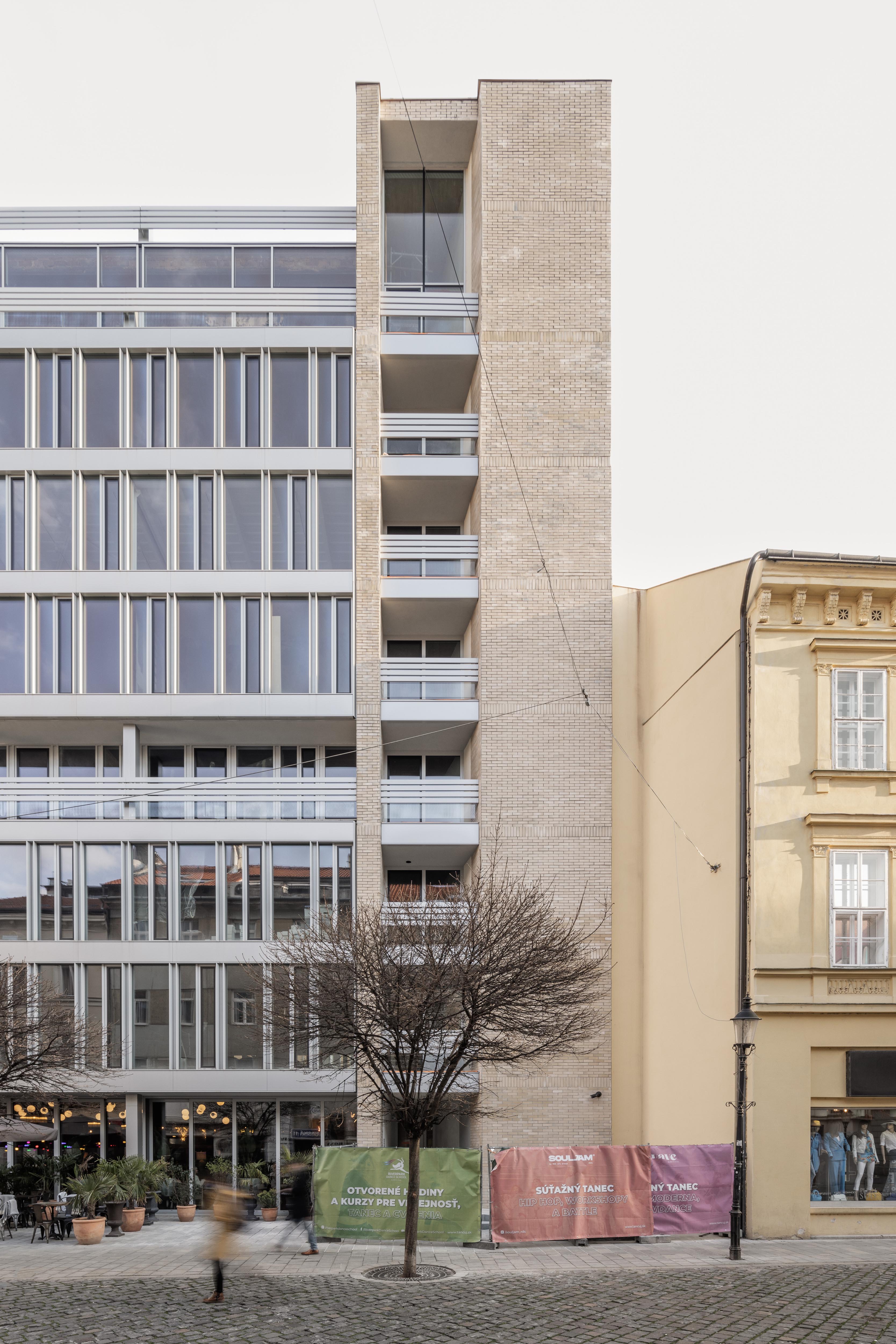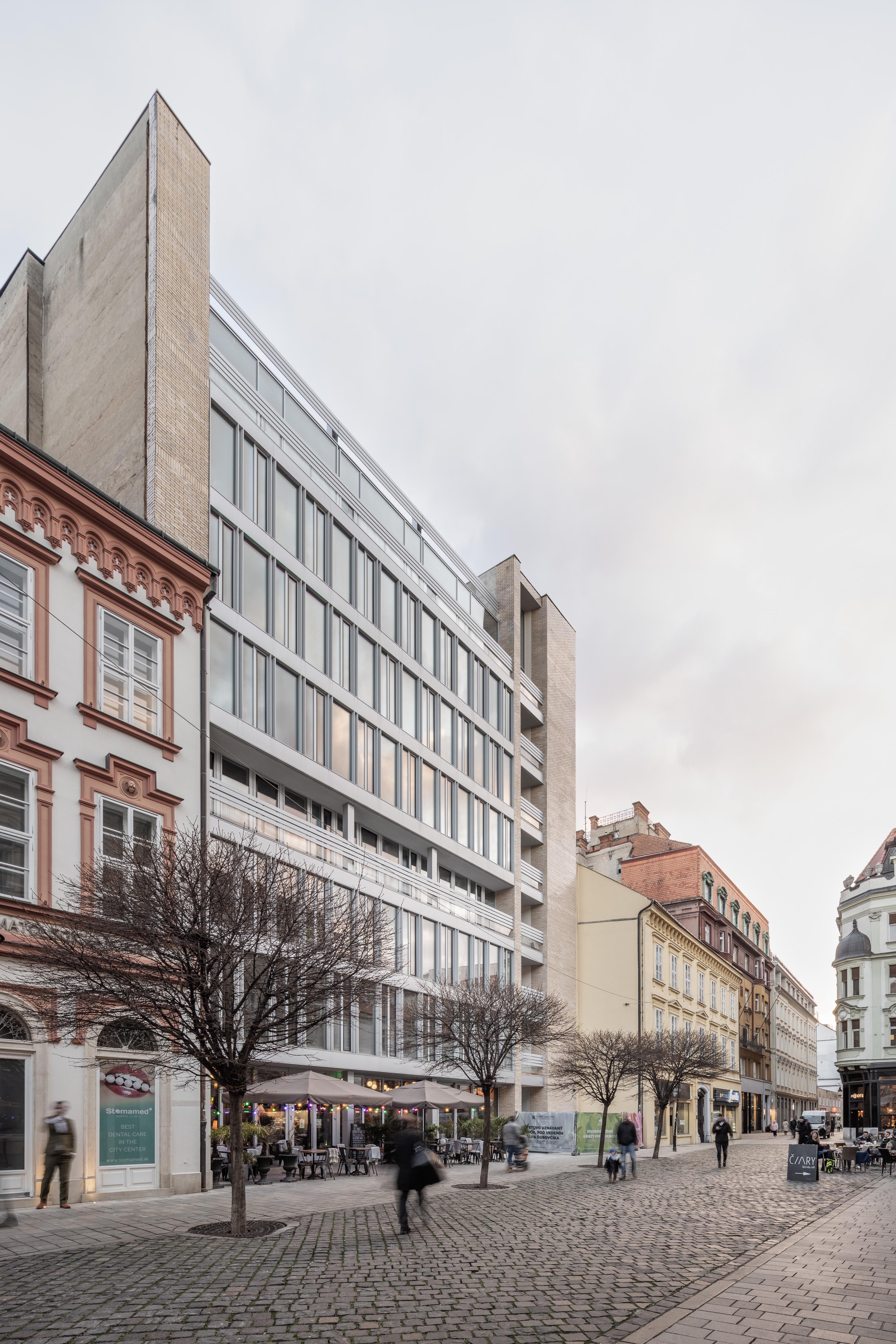Dôležitá bola tiež výmena oboch montovaných oceľových fasád, ktoré boli v havarijnom stave. Členenie a proporcie nových polí rešpektuje vertikálny raster pôvodného riešenia, rámy sú však výrazne subtílnejšie. Fasádu orientovanú na Laurinskú ulicu navrhli architekti ako zavesenú s vložením nových otváravých segmentov, pričom parapet lícuje s úrovňou podlahy. Modul sa opakuje na každom podlaží - od 2. NP až po podlažia po 7. NP. Výnimku tvorí ustúpené štvrté nadzemné podlažie s pochôdznou terasou a rovnako ustúpené 8. NP, z ktorého sa otvárajú výhľady na mestskú pamiatkovú rezerváciu a Staré mesto.