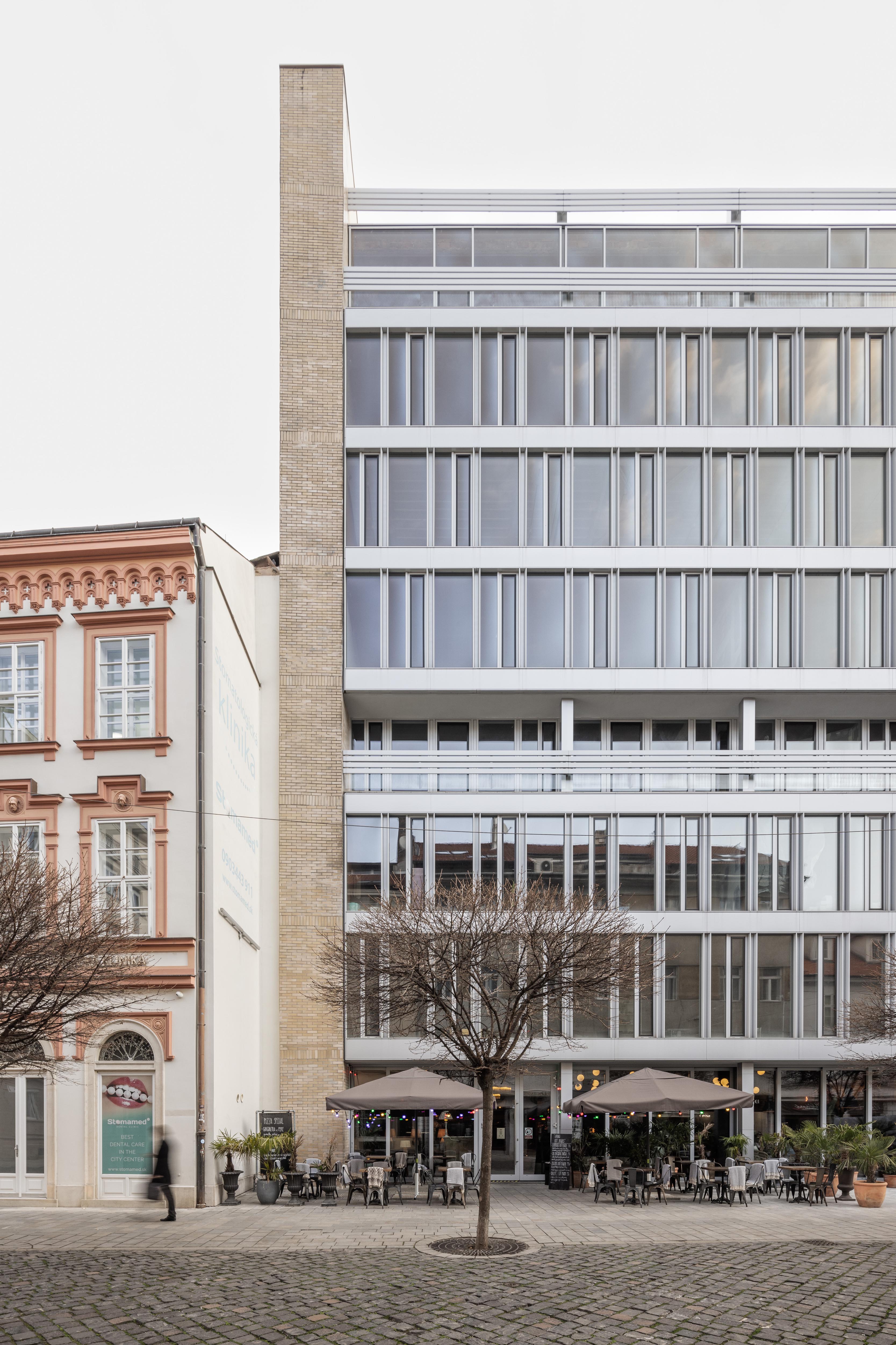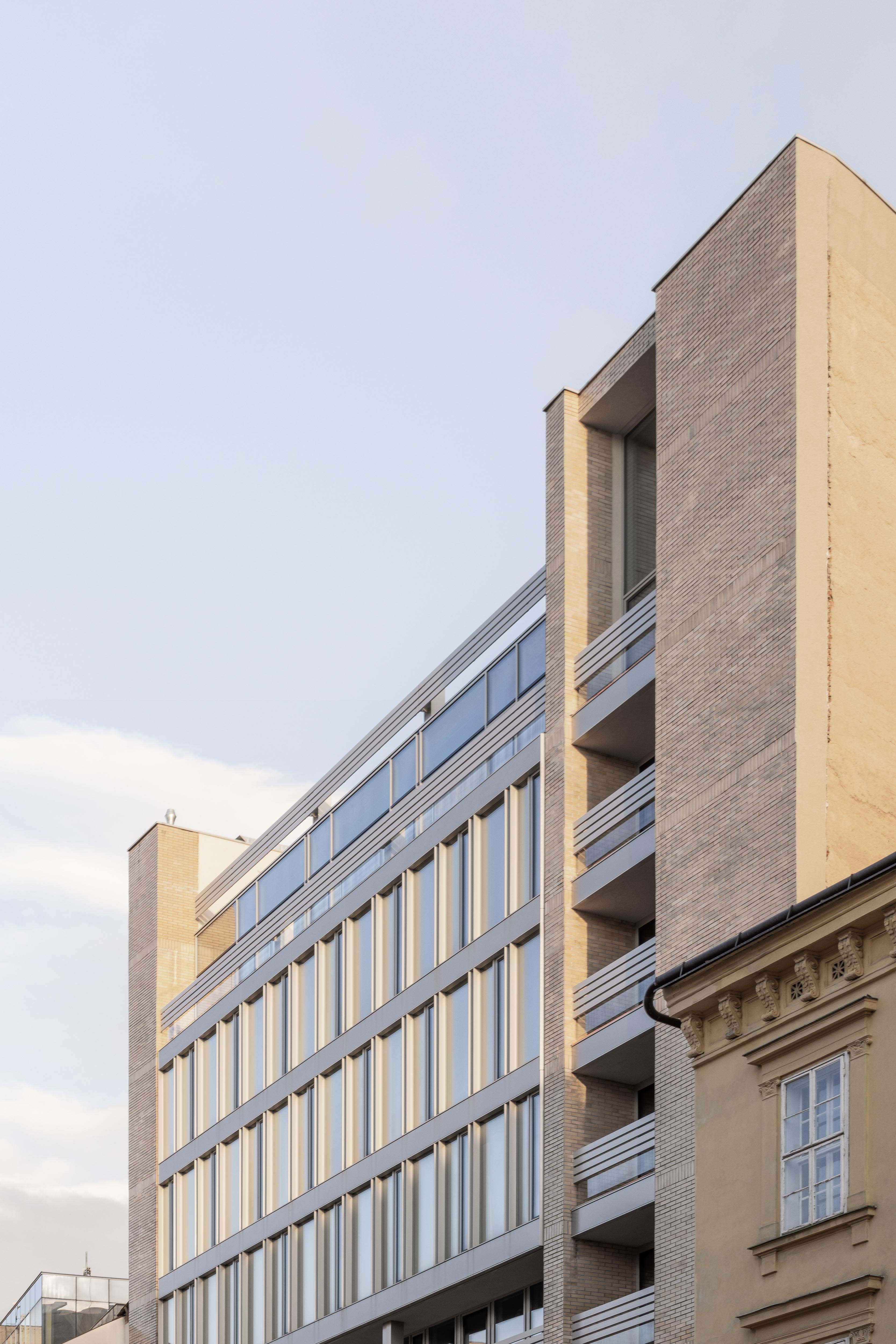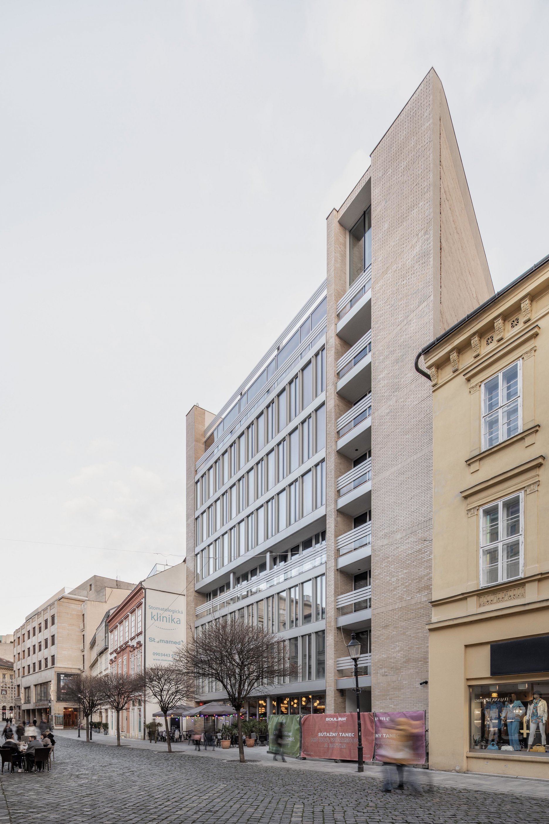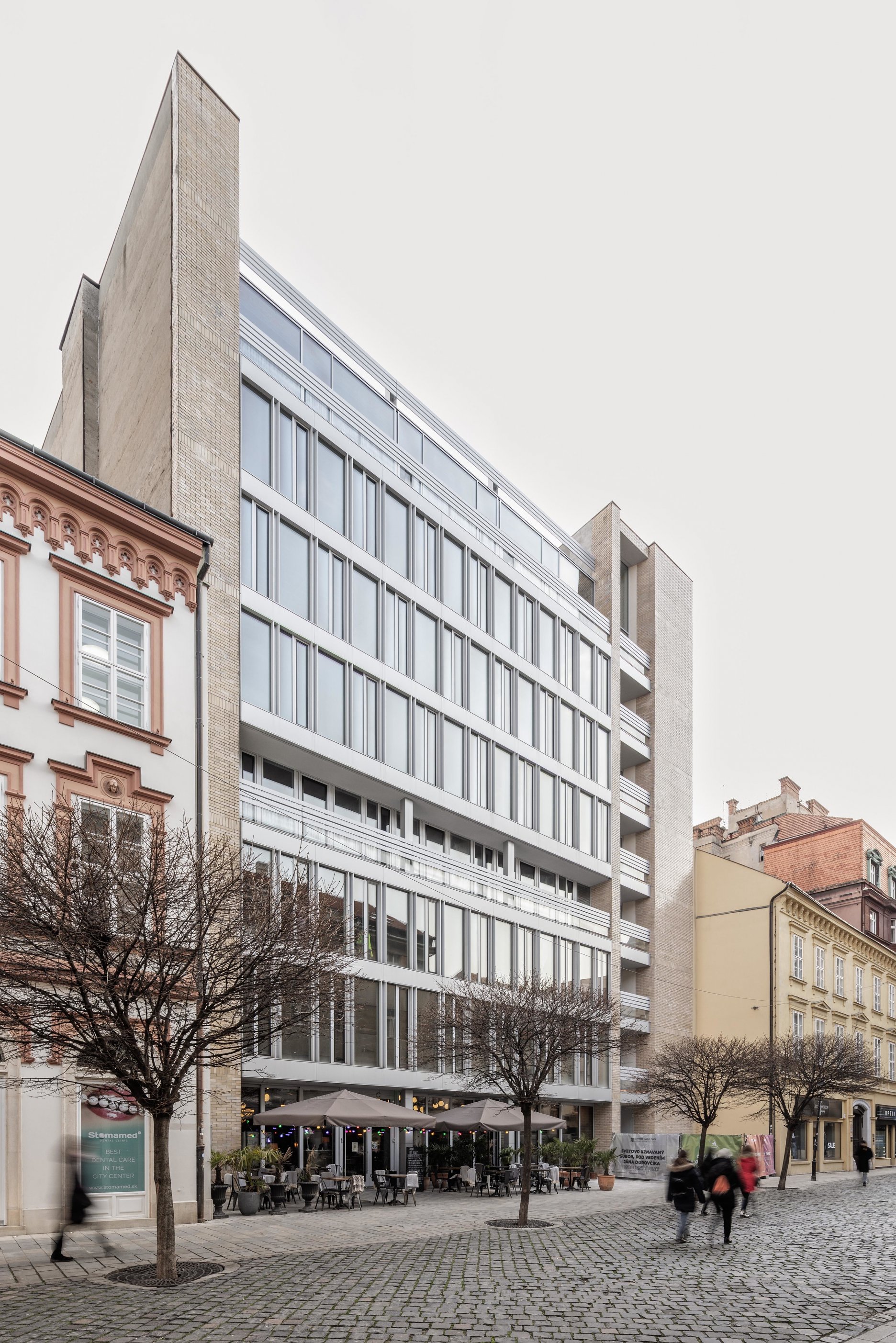 Dôležitá bola tiež výmena oboch montovaných oceľových fasád, ktoré boli v havarijnom stave. Členenie a proporcie nových polí rešpektuje vertikálny raster pôvodného riešenia, rámy sú však výrazne subtílnejšie. Fasádu orientovanú na Laurinskú ulicu navrhli architekti ako zavesenú s vložením nových otváravých segmentov, pričom parapet lícuje s úrovňou podlahy. Modul sa opakuje na každom podlaží - od 2. NP až po podlažia po 7. NP. Výnimku tvorí ustúpené štvrté nadzemné podlažie s pochôdznou terasou a rovnako ustúpené 8. NP, z ktorého sa otvárajú výhľady na mestskú pamiatkovú rezerváciu a Staré mesto.