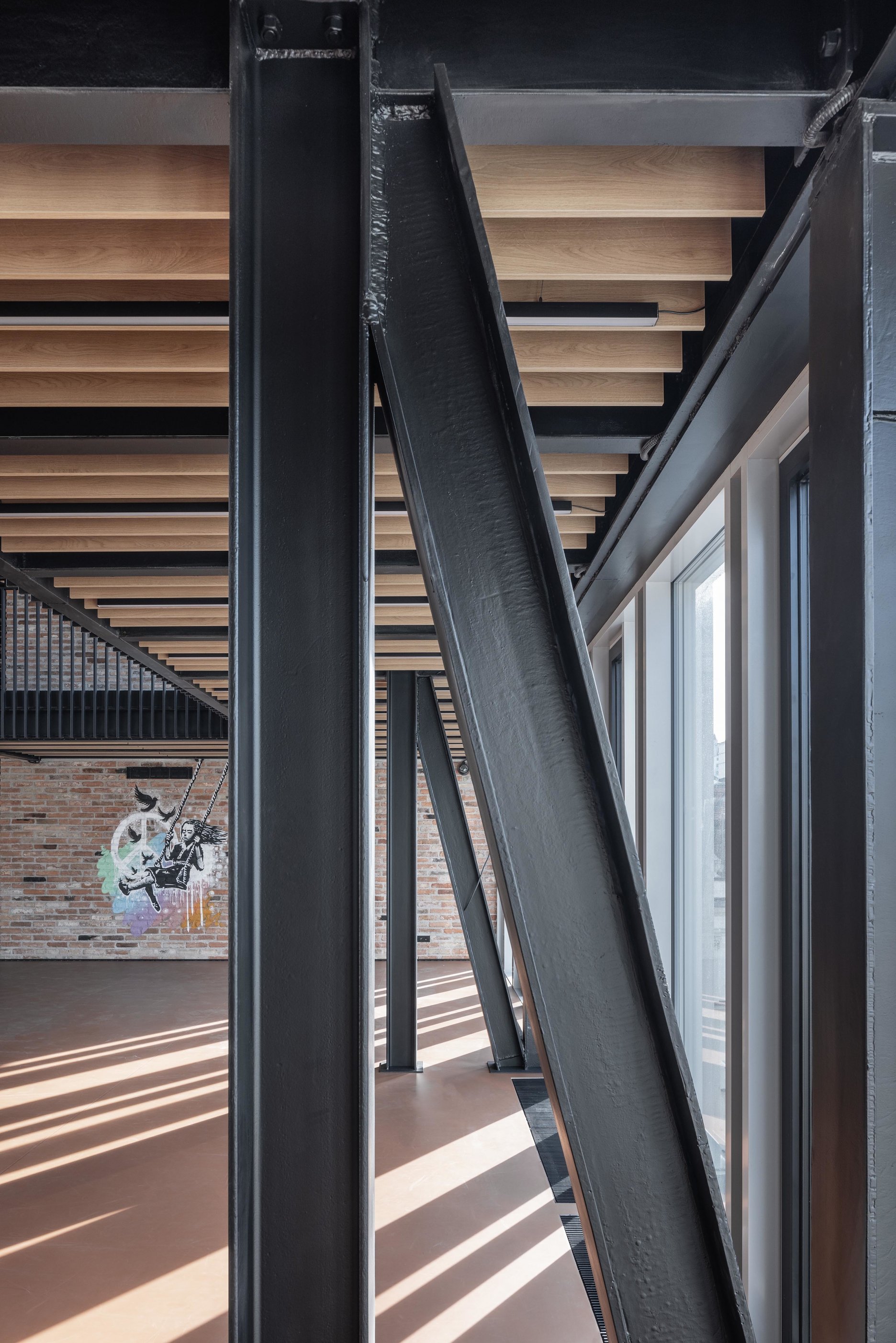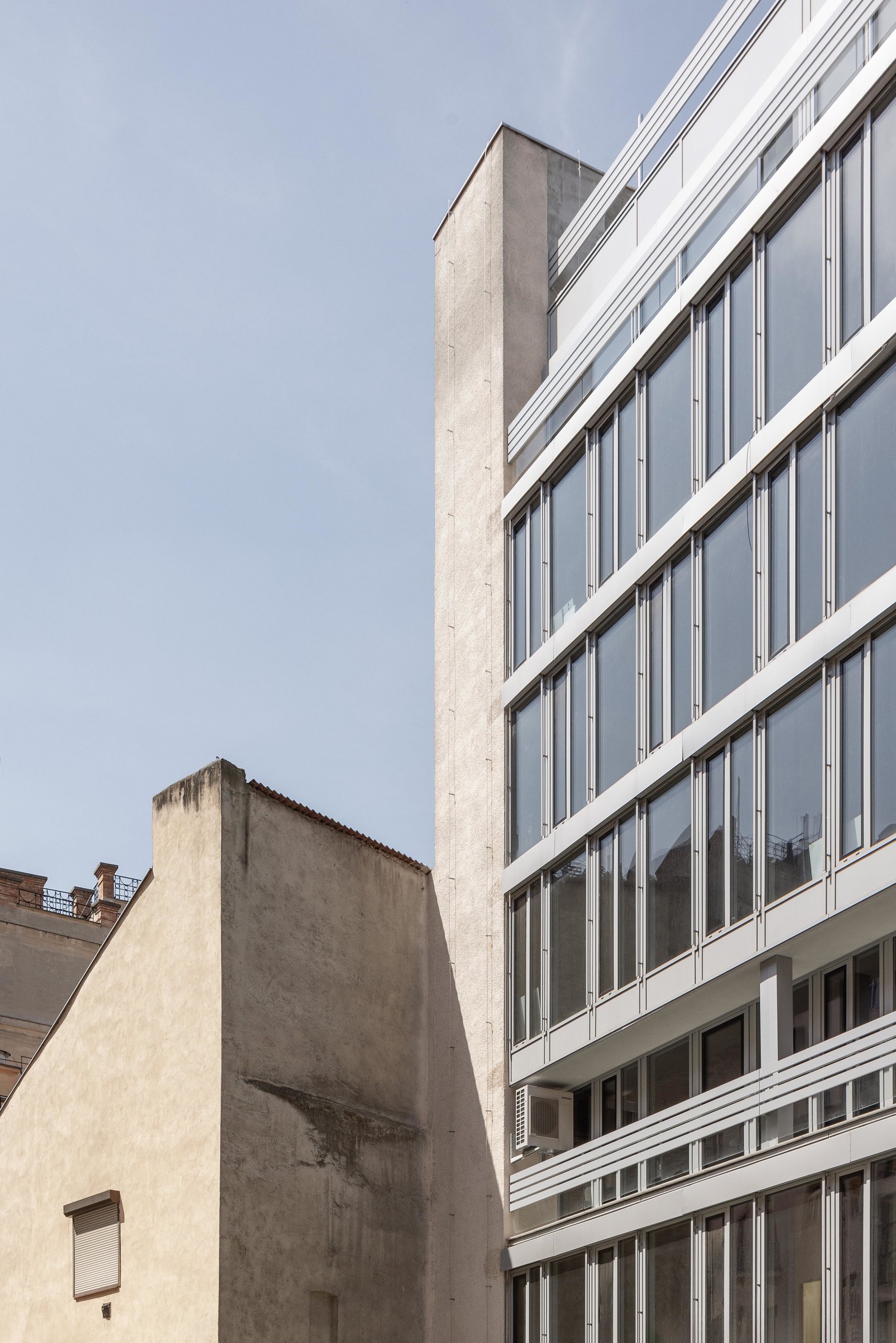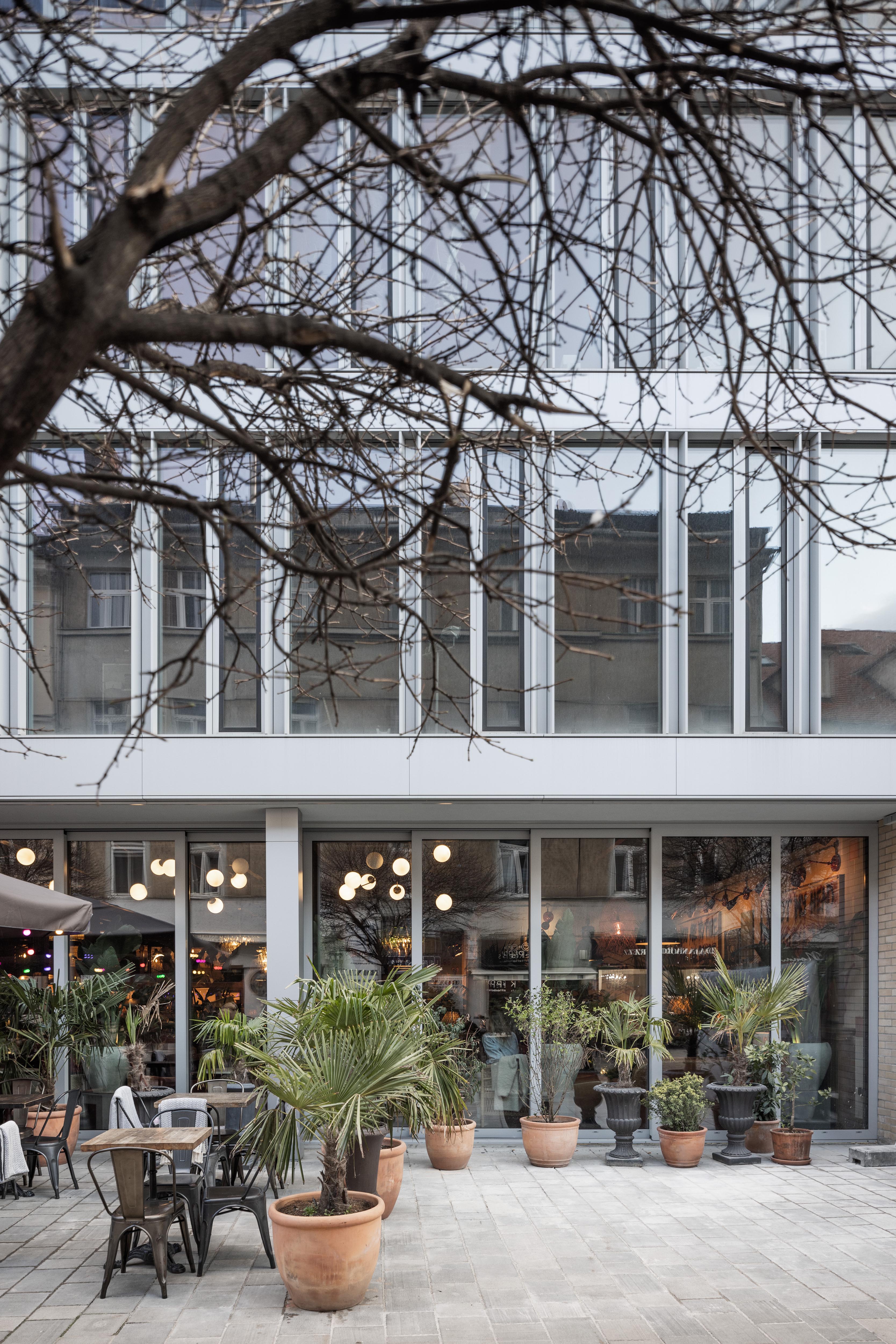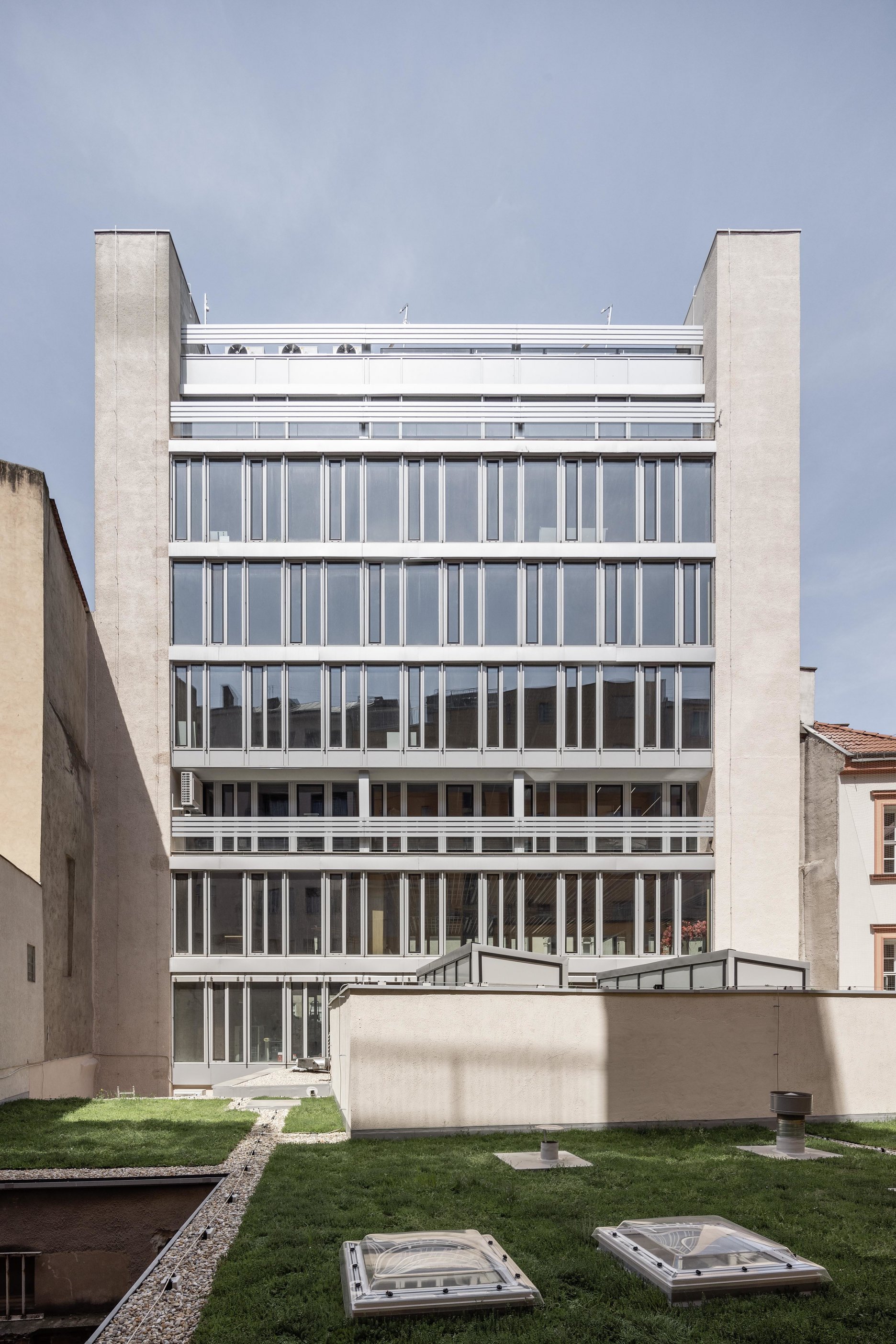 Masívne lichobežníkové konštrukcie vertikálneho a hygienického jadra, ktoré výrazne čnejú nad susedné domy, vyčleňujú ortogonálny centrálny priestor. Ľahká oceľová konštrukcia umožnila prostredníctvom presklených fasád úplne otvoriť dom smerom do ulice aj do dvora a spolu so spriahnutou konštrukciou stropov a viditeľným trapézovým plechom vytvára nezameniteľnú estetiku vnútorných priestorov.