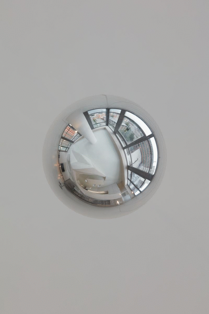 Tvar vrastený do podlahy a stien interiéru je tvorený štruktúrou z trojuholníkov, ktoré sa špirálovite obtáčajú okolo stredu dispozície a vytvárajú pódium, ktoré je zároveň hľadiskom otočeným k výhľadu na mesto. Rotujúca štruktúra do seba integruje atypické sedačkové prvky a plynule nadväzuje na obloženie zvislých stien oddeľujúcich súkromné časti interiéru.