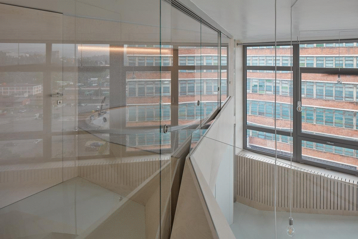 Polygonálny tvar "vrastený" do podlahy a stien interiéru sa špirálovo obtáča okolo jadra dispozície. Vytvára pódium, ktoré je zároveň hľadiskom otočeným k výhľadom na mesto. "Rotující struktura do sebe integruje atypické pohovkové prvky a plynule navazuje na obložení svislých stěn oddělujících soukromé části interiéru," dopĺňa architekt. Výraz interiéru je založený na variácii jemných odtieňov bledej morenej brezovej preglejky, koženkového čalúnenia a PVC podlahovej krytiny. Skladbu dopĺňa sklenené zábradlie a posuvné priečky, lesklé zariadenie kuchyne a mozaikový obklad.