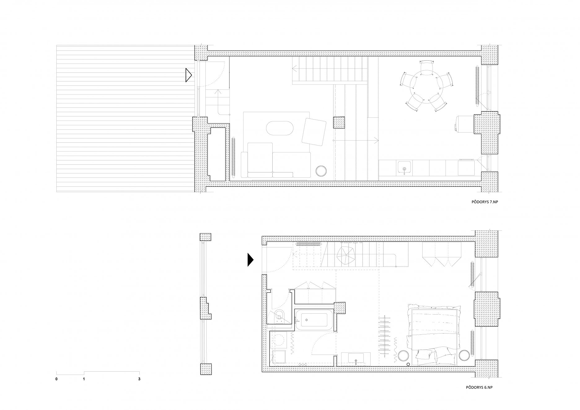 Dispozícia loftu je radená vertikálne. Vstupuje sa do spodnej úrovne loftu, kde sa nachádza šatník, kúpeľňa, WC a spálňa. Schodiskom je dostupná horná úroveň loftu s obývačkou prepojená pobytovými schodami s jedáľňou a kuchyňou. Z obývačky je tiež dostupná terasa s výhľadom na Karpaty.
