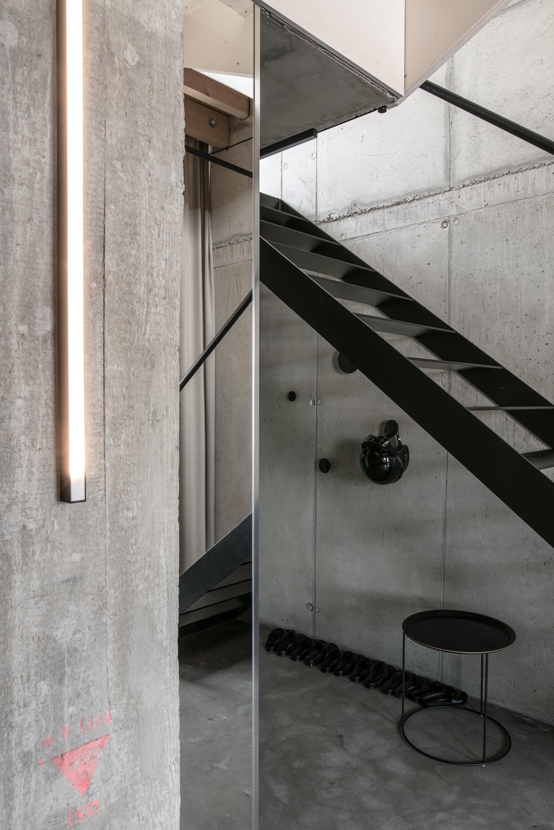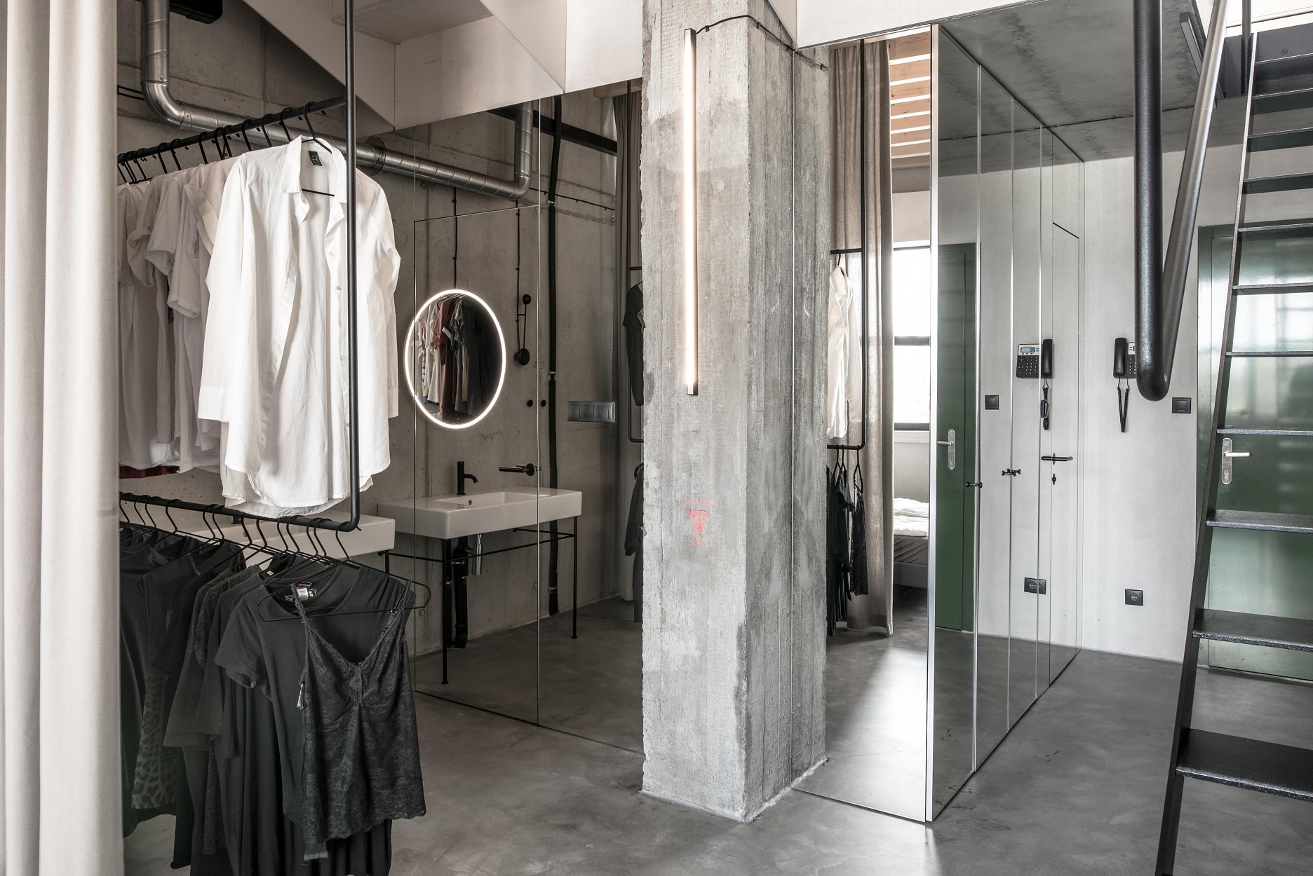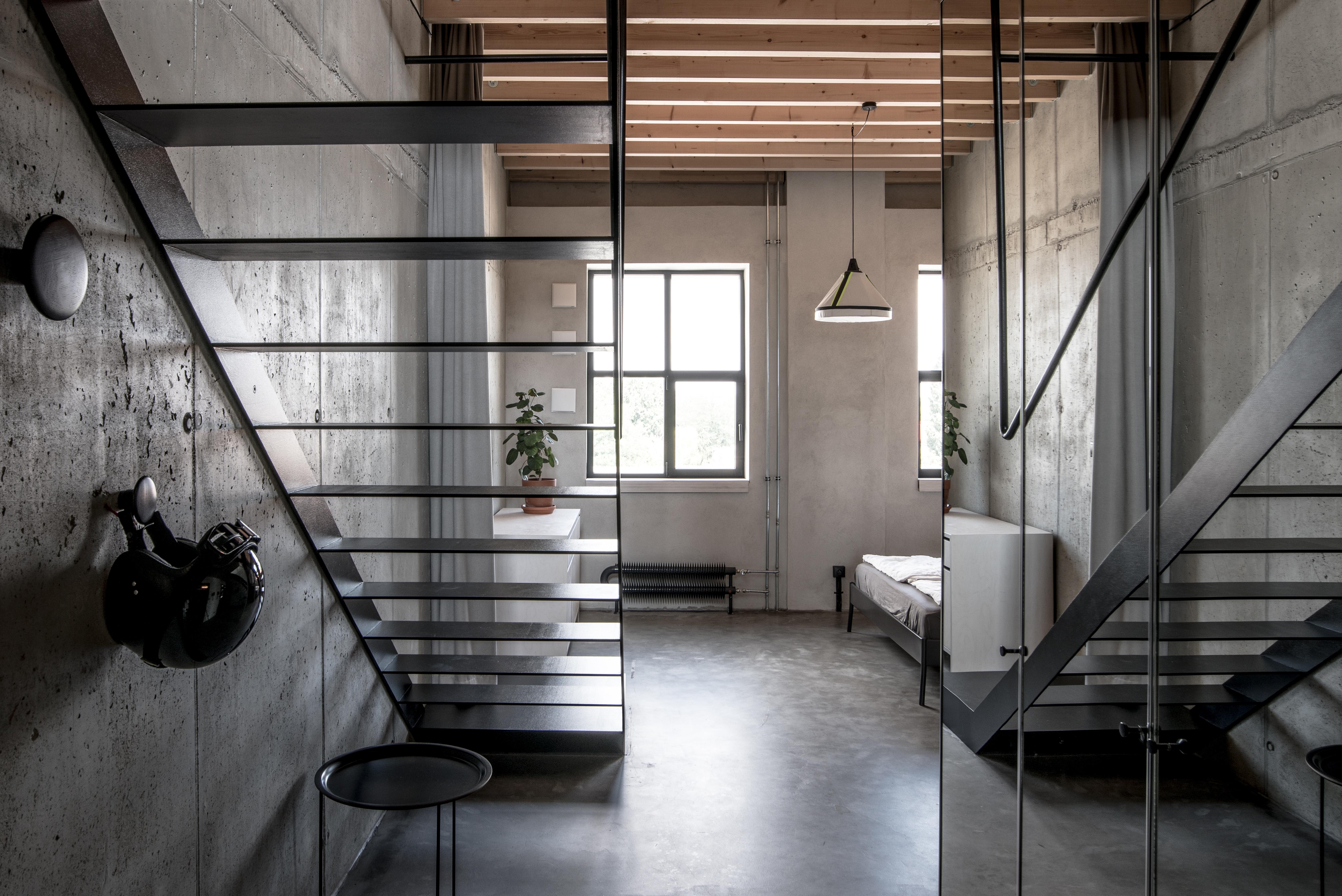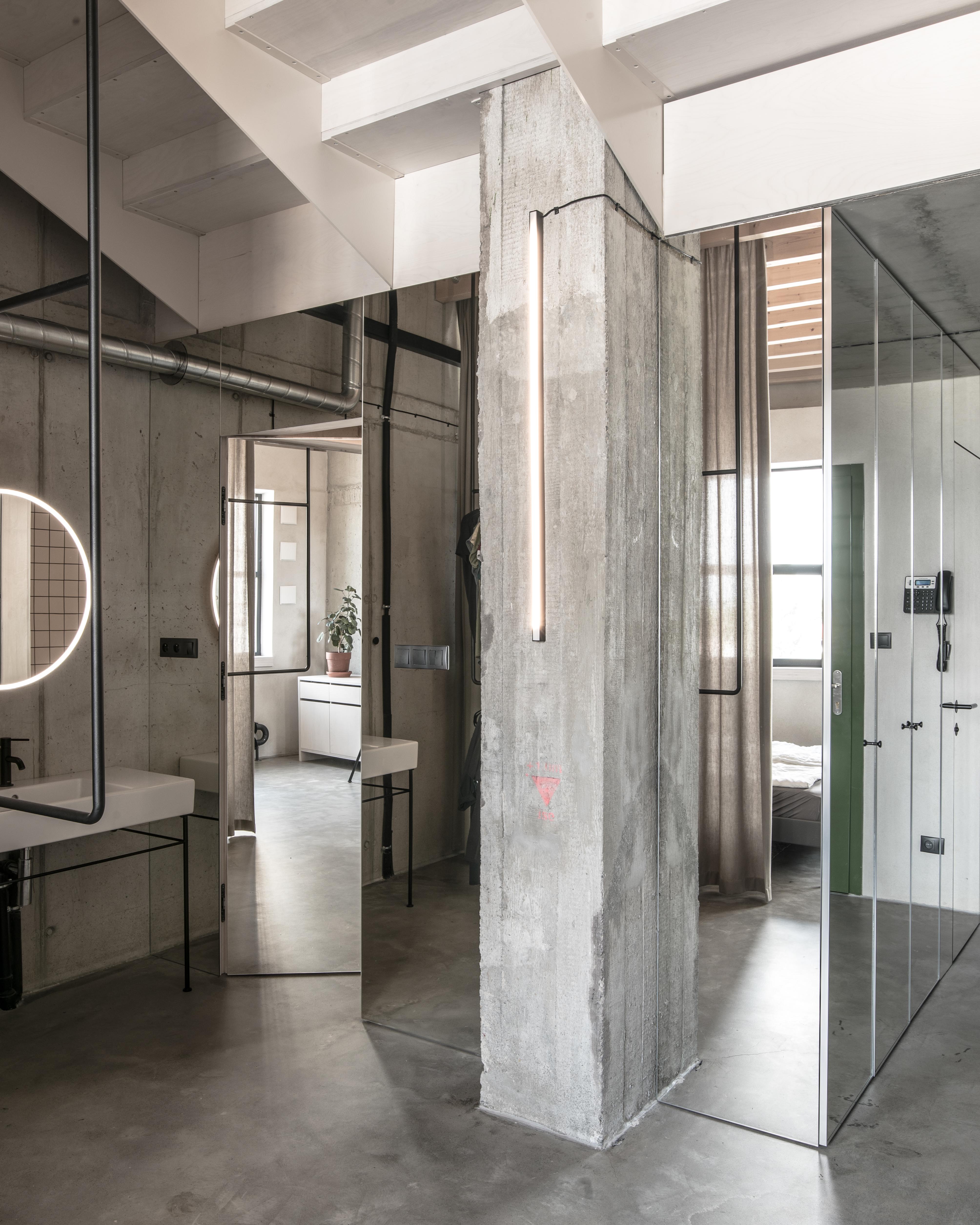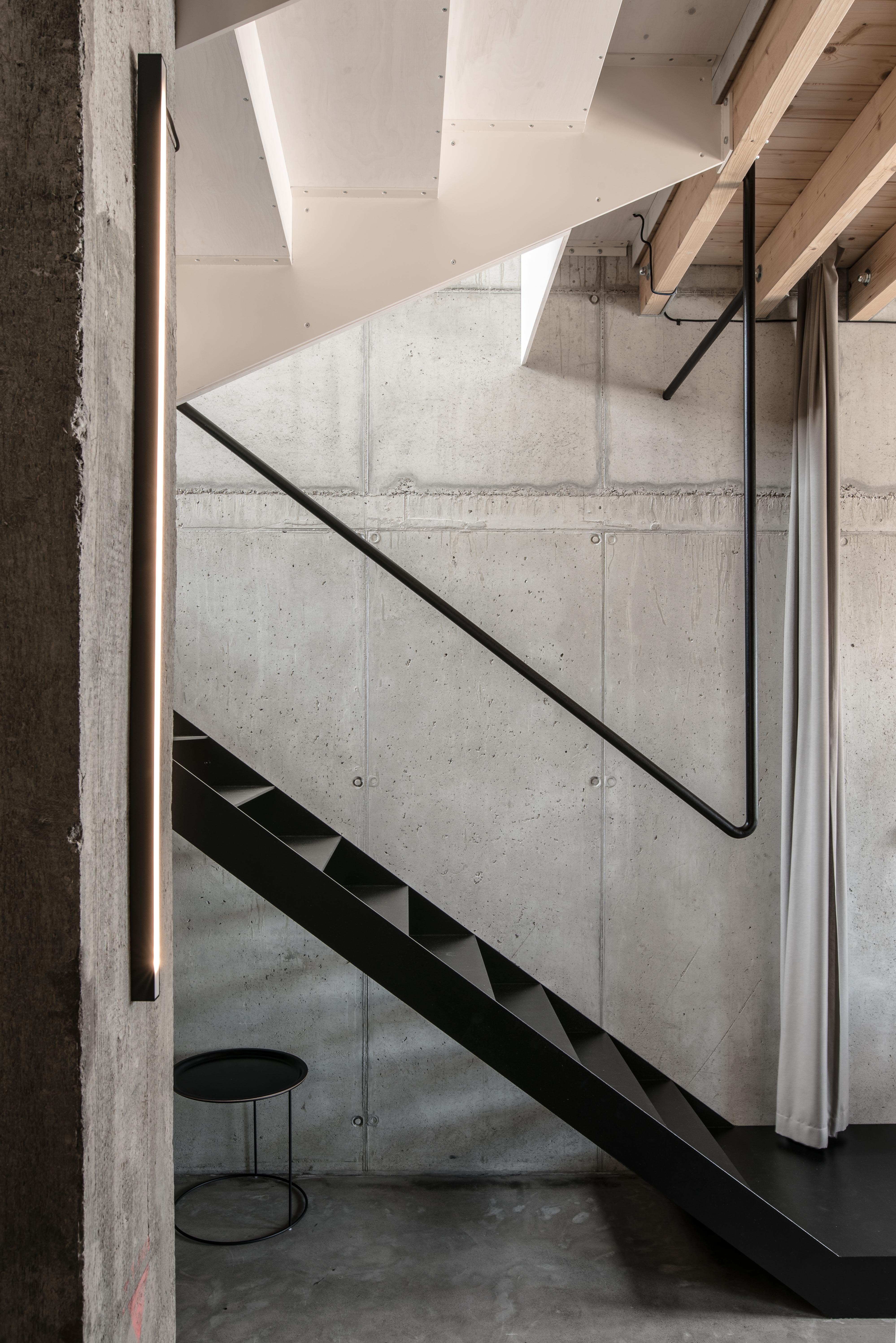 Stavebné surové materiály použité v lofte kontrastujú s vloženými stolárskymi a zámočníckymi prvkami a priznanými rozvodmi na povrchu stien. Obálku loftu tak tvorí neomietnutý liaty betón, železobetónový strop a betónová podlaha s epoxidovým lakom. Na spodnej úrovni loftu sa nachádza zabudovaný šatník, ktorý v sebe integruje aj dvere do hygienických buniek, ktoré sú spolu s dverami šatníka zjednotené do celistvej celozrkadlovej plochy, ktorá opticky zväčšuje priestor. Umývadlo na ocelových nožickách je umiestnené mimo zrkadlový box a od postele ho oddeľuje zo stropu podvesená čierna oceľová vešiaková tyč a tiež textilný záves na celú výšku miestnosti, ktorým je možné celkom oddeliť spálňu od zvyšku loftu. Vložené čierne schodisko je zvarené z oceľových plechov. Schodisko vedúce zo spodného podlažia od vstupu a spálňovej časti do obývacej miestnosti, spolu s tenkým zábradlím pôsobí subtílnym dojmom. Odľahčený výraz mu dodávajú aj vynechané podstupnice. Výškovo zalomené horné podlažie je prepojené pobytovými schodmi z bielenej brezovej preglejky. Tie kontrastujú s tmavým kuchynským boxom z čiernej morenej preglejky a tmavým jedálenským stolom a stoličkami. Celočalúnená sedacia súprava v obývacej časti na hornom podlaží je potiahnutá sivou látkou.