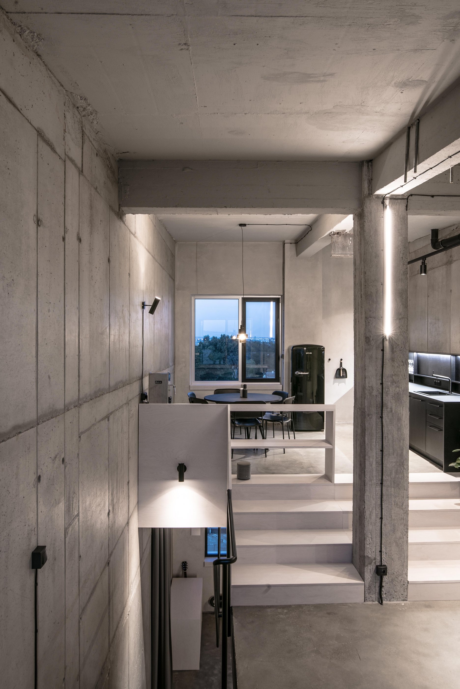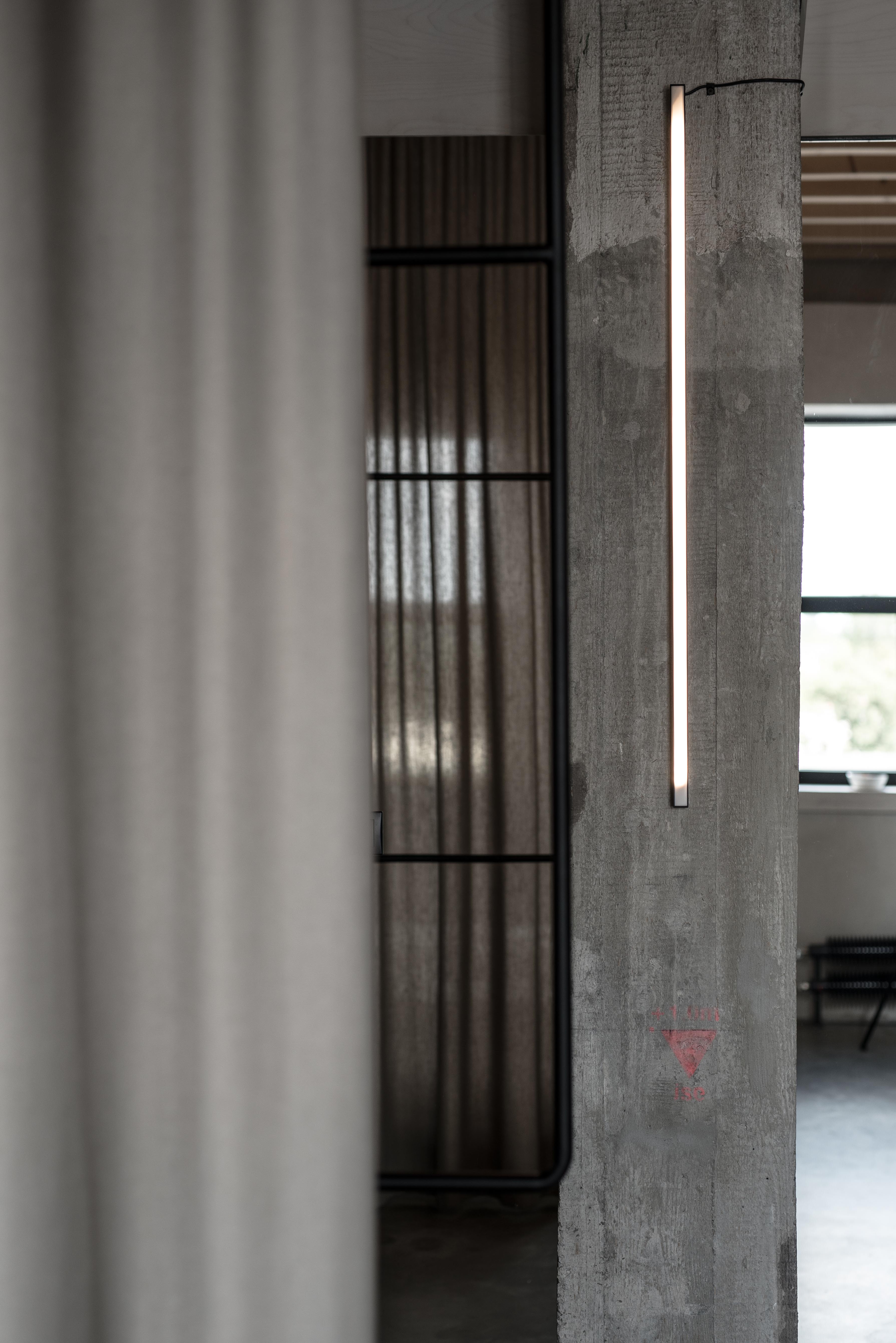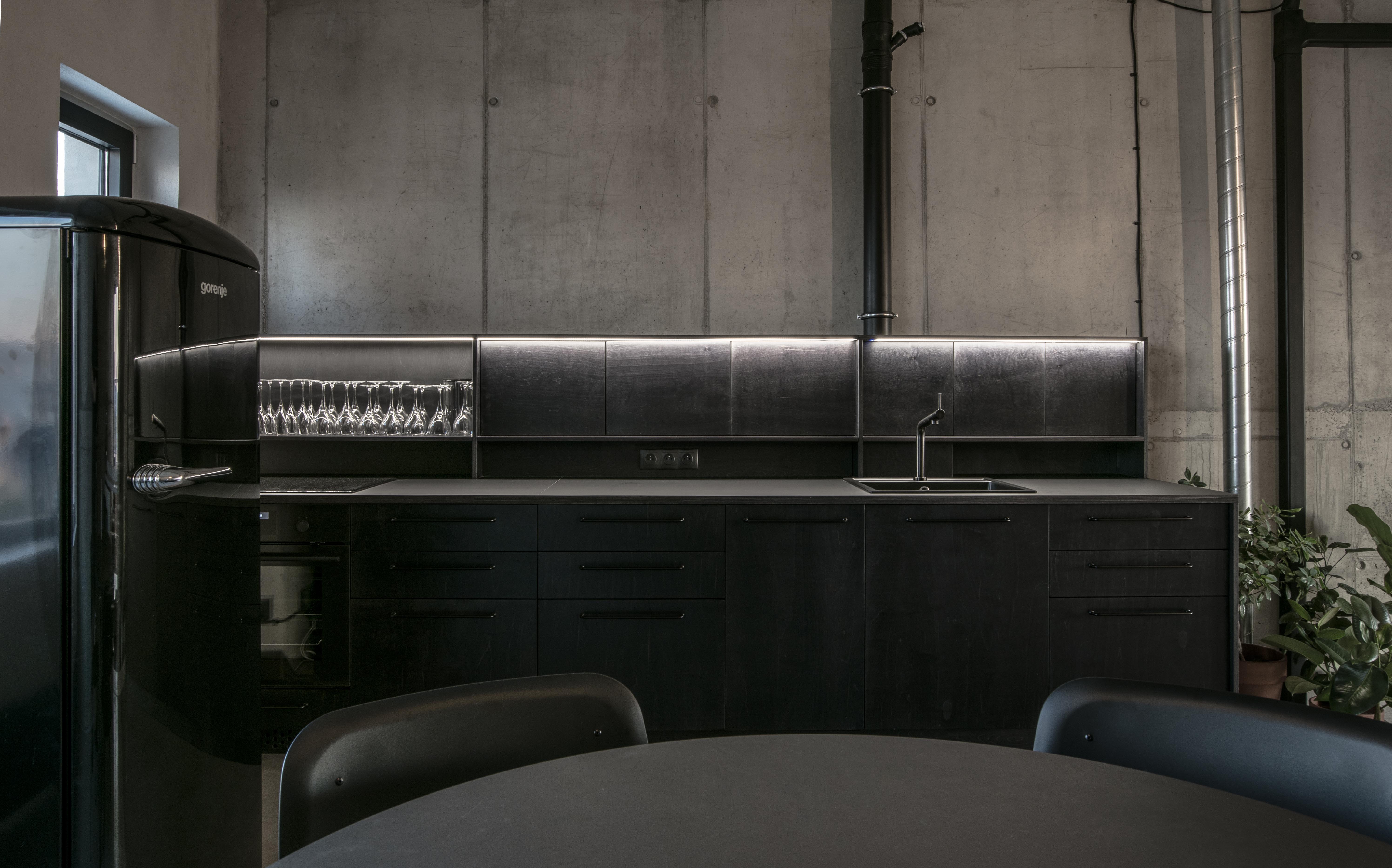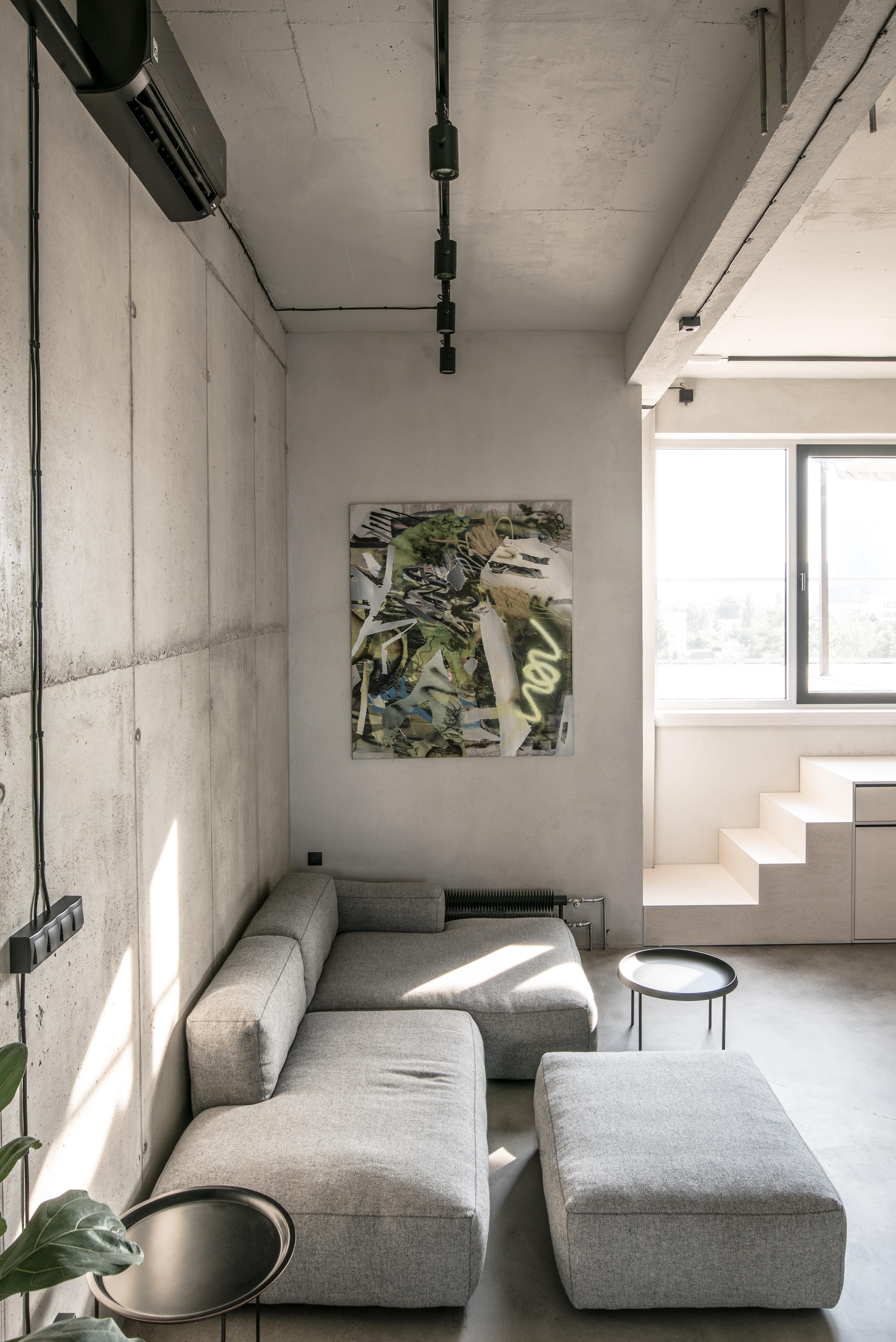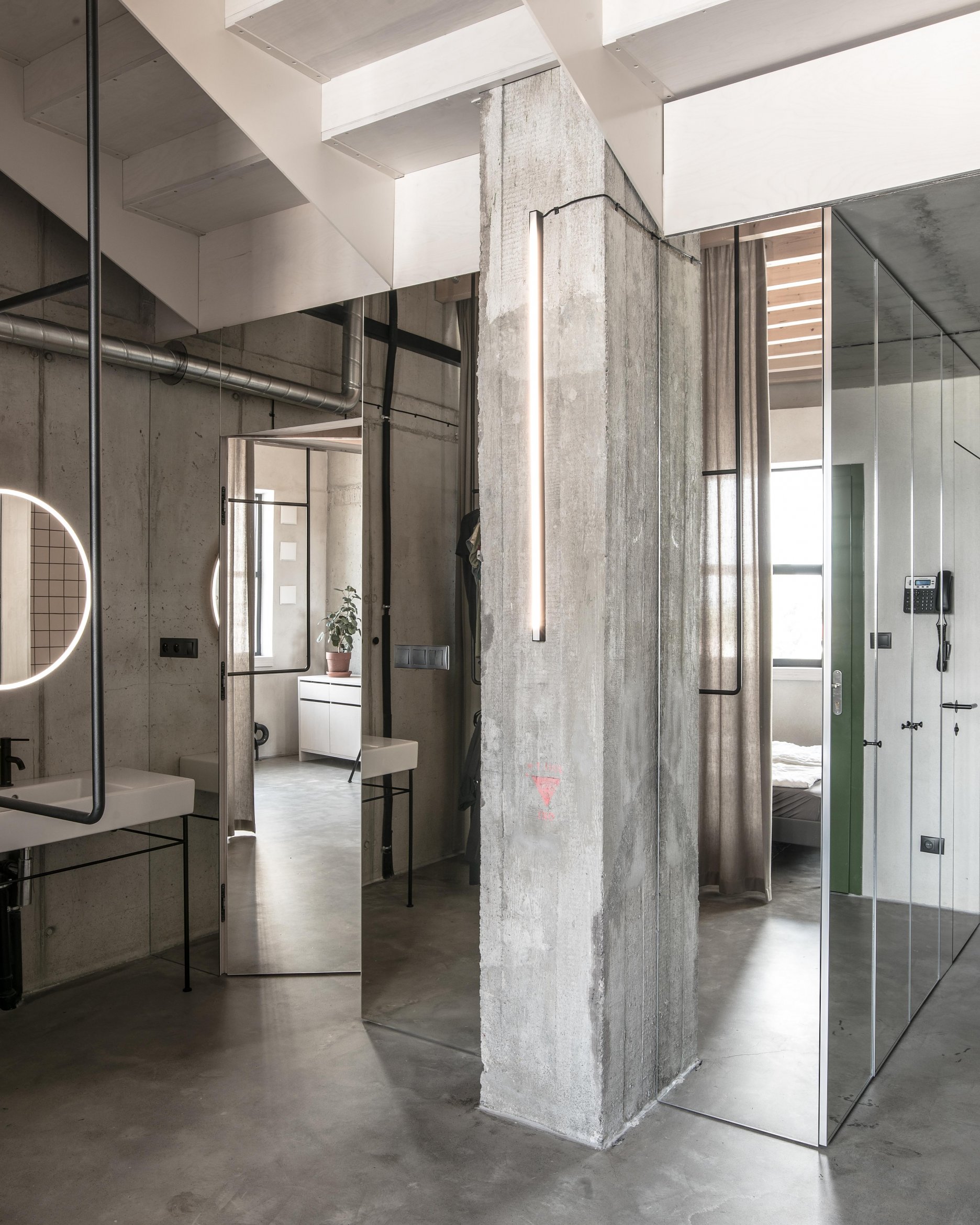 Stavebné surové materiály použité v lofte kontrastujú s vloženými stolárskymi a zámočníckymi prvkami a priznanými rozvodmi na povrchu stien. Obálku loftu tak tvorí neomietnutý liaty betón, železobetónový strop a betónová podlaha s epoxidovým lakom. Na spodnej úrovni loftu sa nachádza zabudovaný šatník, ktorý v sebe integruje aj dvere do hygienických buniek, ktoré sú spolu s dverami šatníka zjednotené do celistvej celozrkadlovej plochy, ktorá opticky zväčšuje priestor. Umývadlo na ocelových nožickách je umiestnené mimo zrkadlový box a od postele ho oddeľuje zo stropu podvesená čierna oceľová vešiaková tyč a tiež textilný záves na celú výšku miestnosti, ktorým je možné celkom oddeliť spálňu od zvyšku loftu. Vložené čierne schodisko je zvarené z oceľových plechov. Schodisko vedúce zo spodného podlažia od vstupu a spálňovej časti do obývacej miestnosti, spolu s tenkým zábradlím pôsobí subtílnym dojmom. Odľahčený výraz mu dodávajú aj vynechané podstupnice. Výškovo zalomené horné podlažie je prepojené pobytovými schodmi z bielenej brezovej preglejky. Tie kontrastujú s tmavým kuchynským boxom z čiernej morenej preglejky a tmavým jedálenským stolom a stoličkami. Celočalúnená sedacia súprava v obývacej časti na hornom podlaží je potiahnutá sivou látkou.