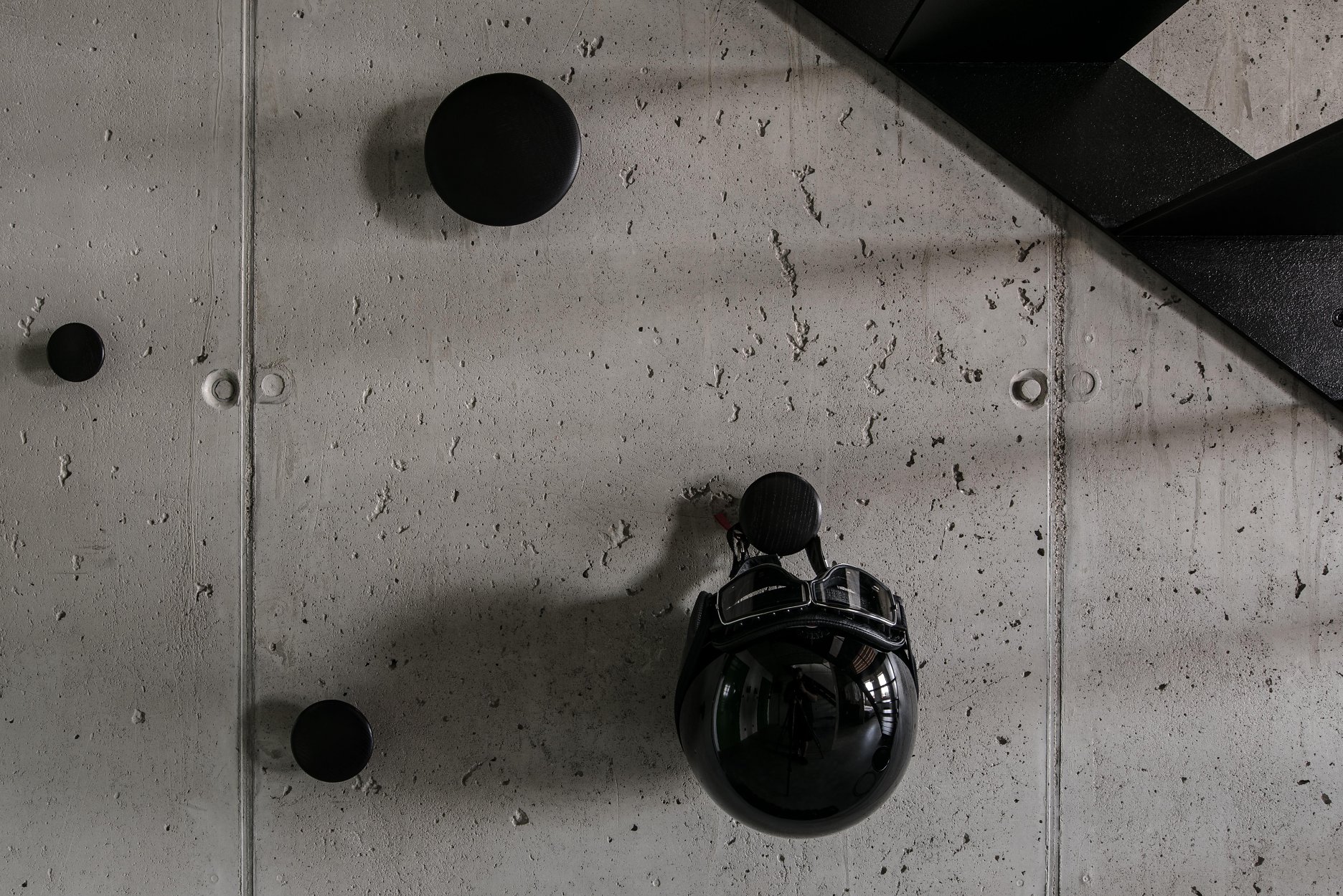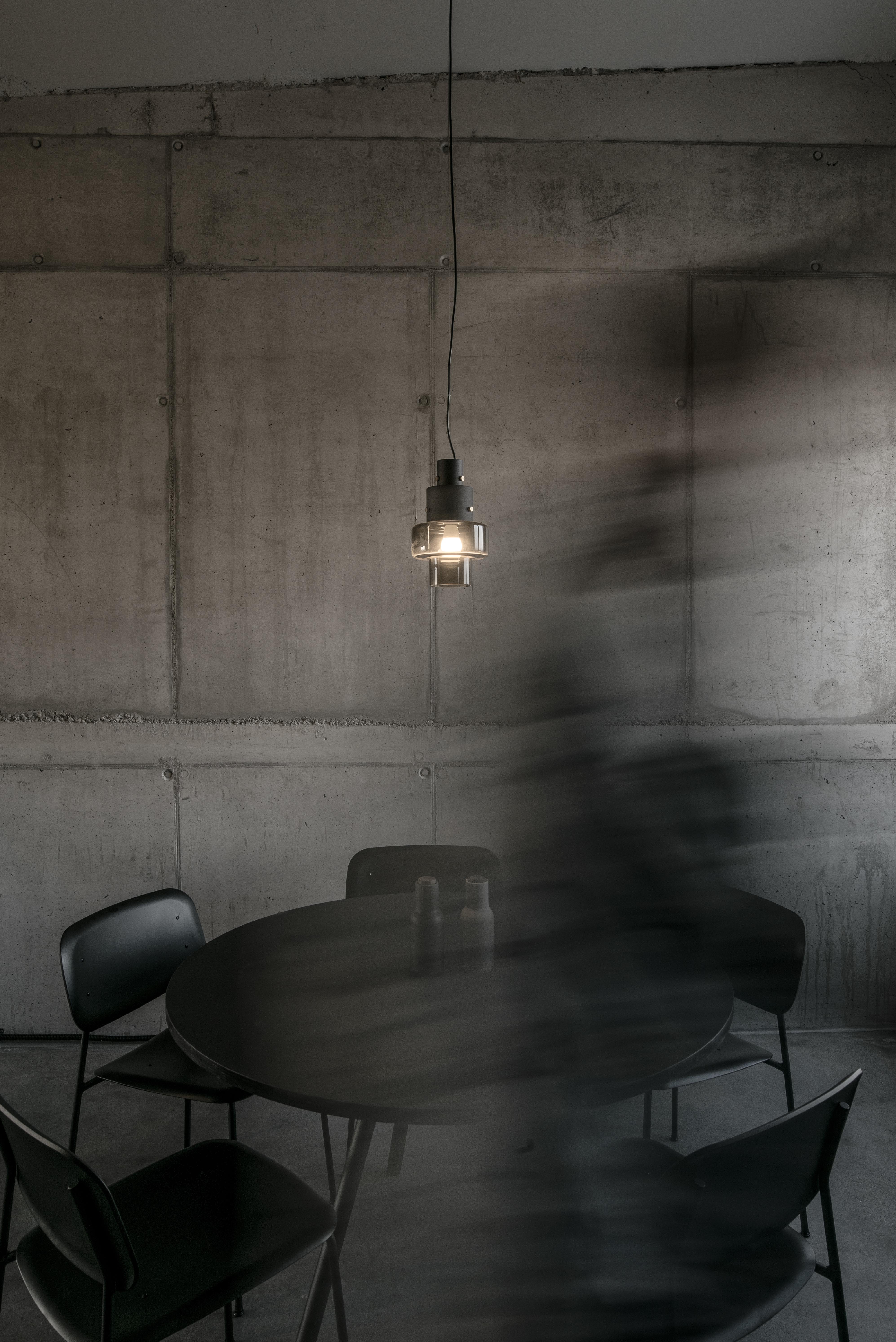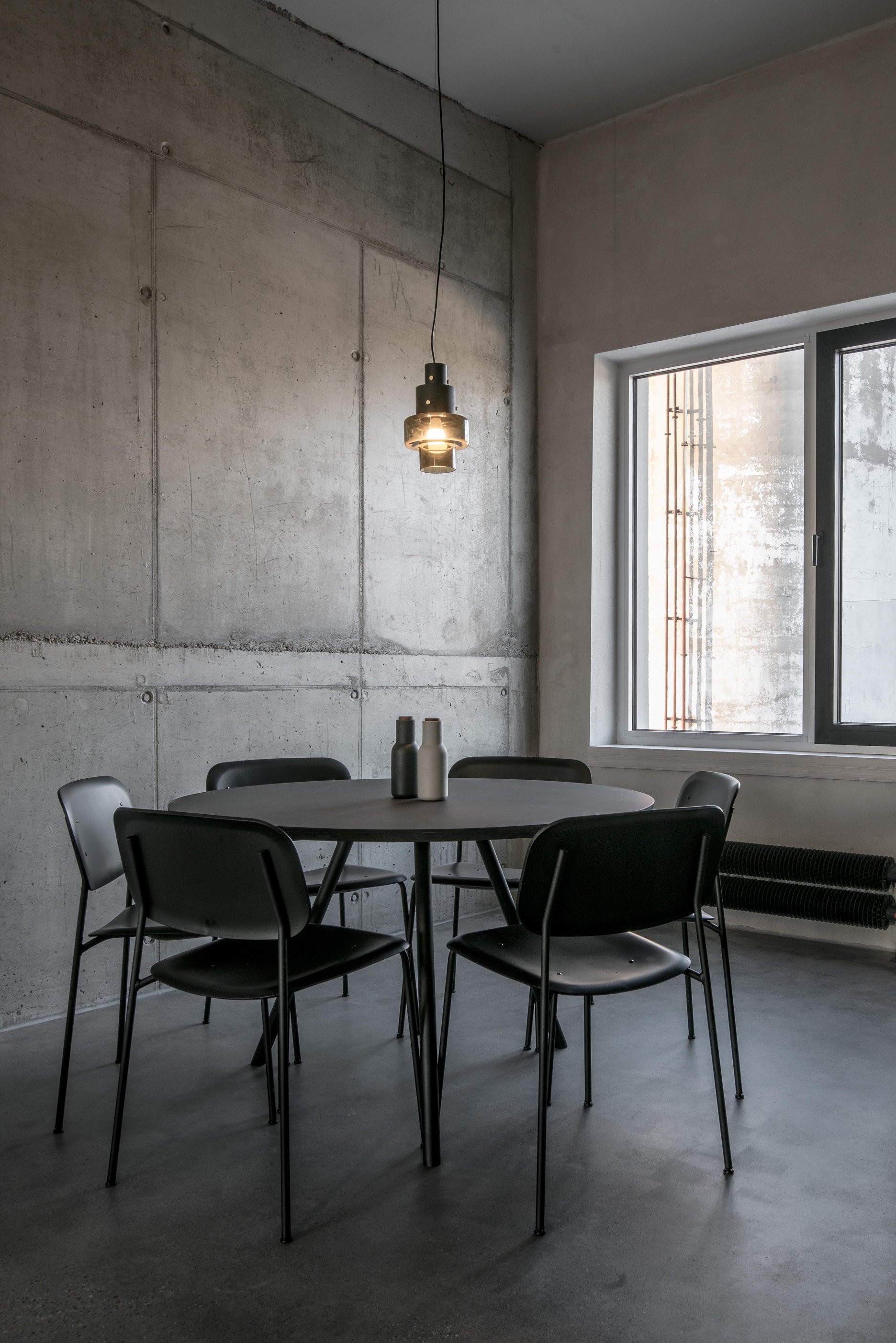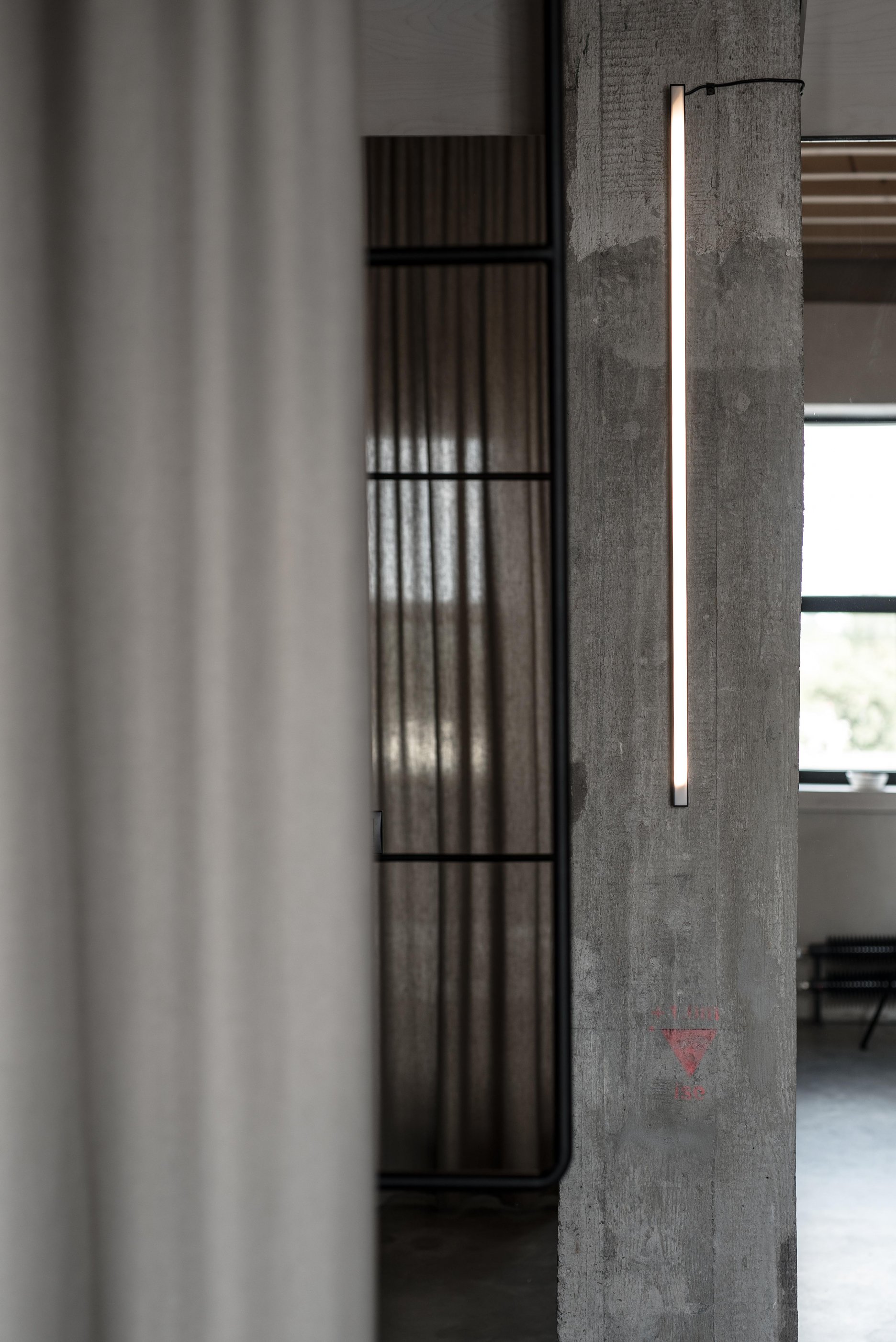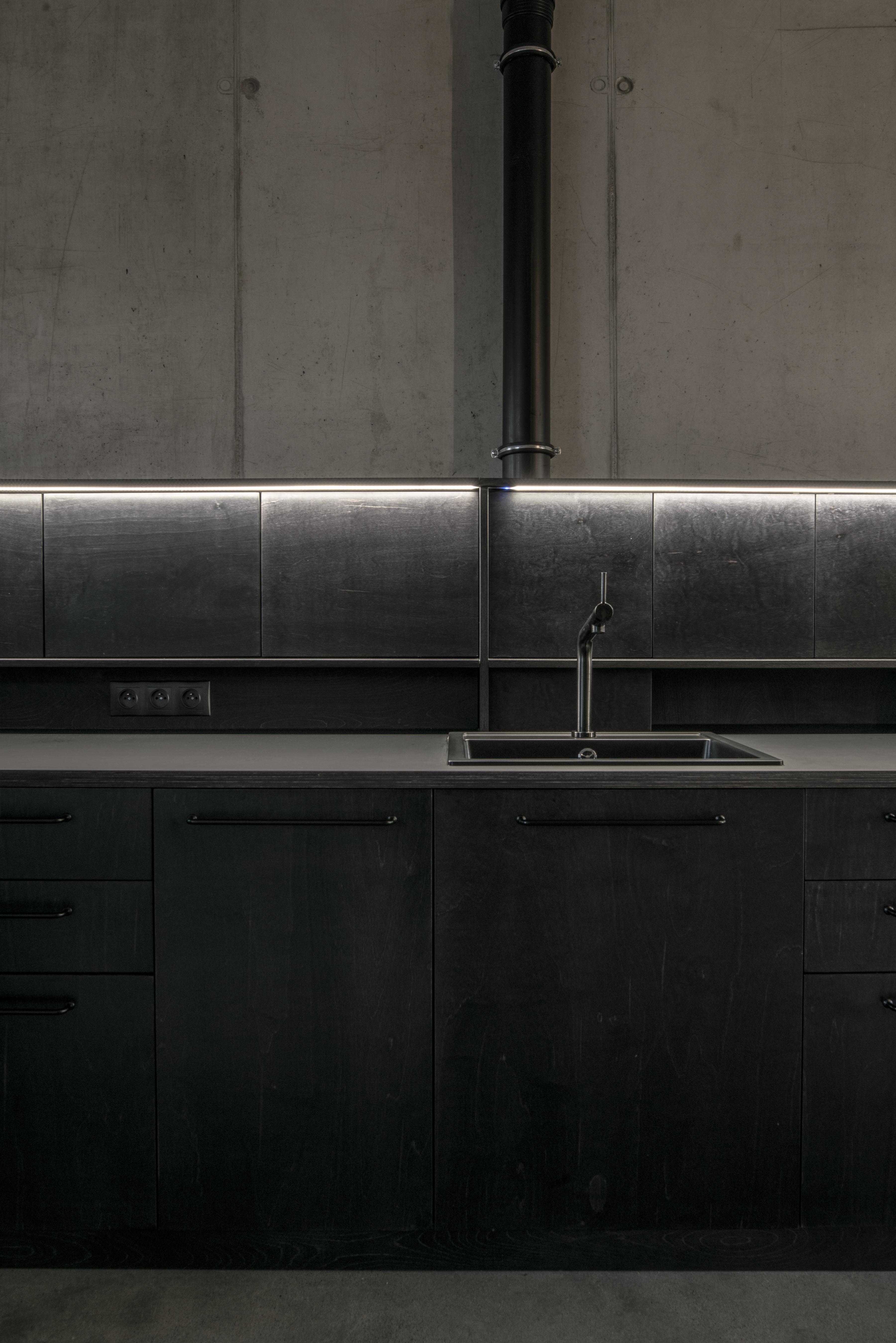 Stavebné surové materiály použité v lofte kontrastujú s vloženými stolárskymi a zámočníckymi prvkami a priznanými rozvodmi na povrchu stien. Obálku loftu tak tvorí neomietnutý liaty betón, železobetónový strop a betónová podlaha s epoxidovým lakom. Na spodnej úrovni loftu sa nachádza zabudovaný šatník, ktorý v sebe integruje aj dvere do hygienických buniek, ktoré sú spolu s dverami šatníka zjednotené do celistvej celozrkadlovej plochy, ktorá opticky zväčšuje priestor. Umývadlo na ocelových nožickách je umiestnené mimo zrkadlový box a od postele ho oddeľuje zo stropu podvesená čierna oceľová vešiaková tyč a tiež textilný záves na celú výšku miestnosti, ktorým je možné celkom oddeliť spálňu od zvyšku loftu. Vložené čierne schodisko je zvarené z oceľových plechov. Schodisko vedúce zo spodného podlažia od vstupu a spálňovej časti do obývacej miestnosti, spolu s tenkým zábradlím pôsobí subtílnym dojmom. Odľahčený výraz mu dodávajú aj vynechané podstupnice. Výškovo zalomené horné podlažie je prepojené pobytovými schodmi z bielenej brezovej preglejky. Tie kontrastujú s tmavým kuchynským boxom z čiernej morenej preglejky a tmavým jedálenským stolom a stoličkami. Celočalúnená sedacia súprava v obývacej časti na hornom podlaží je potiahnutá sivou látkou.