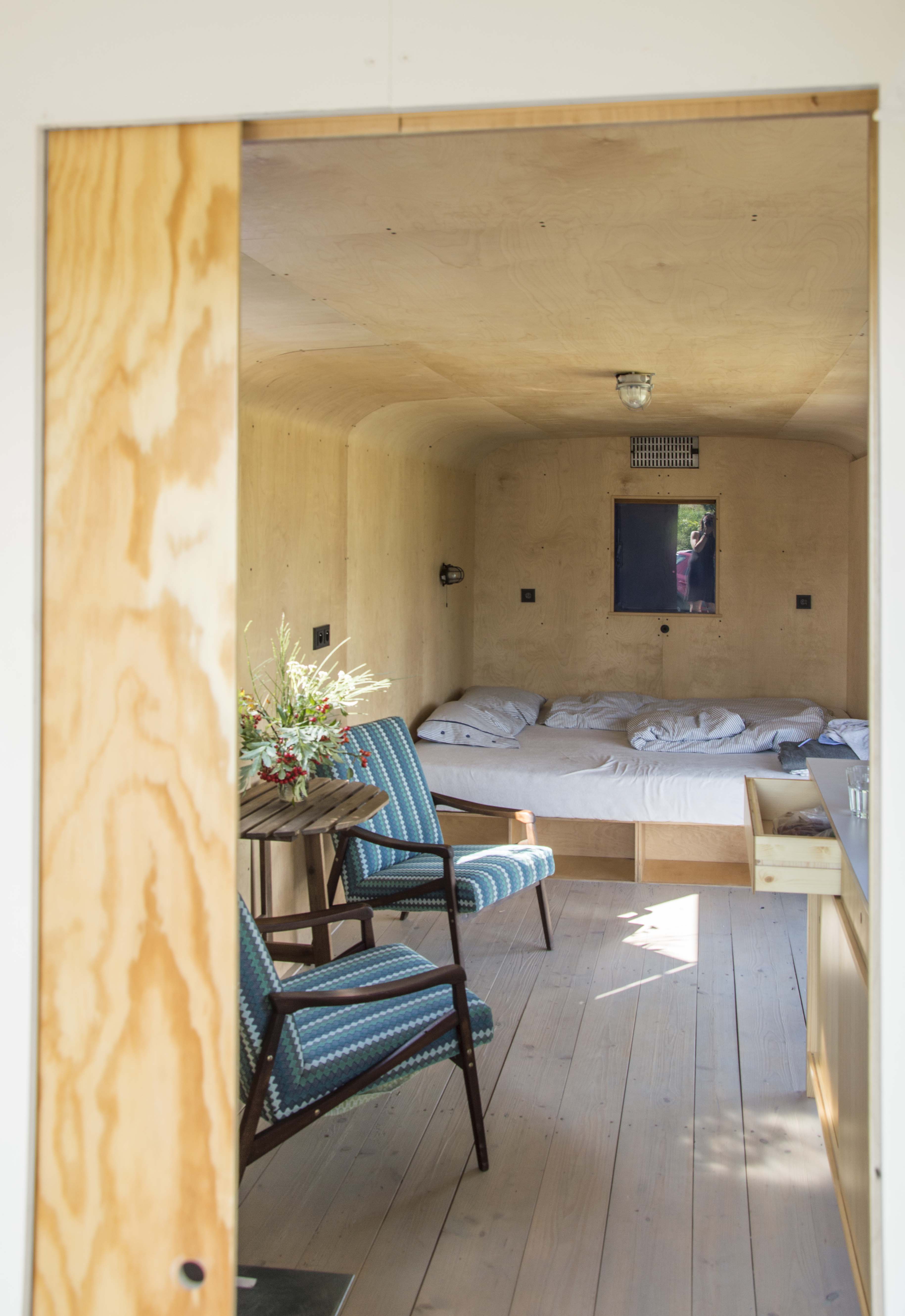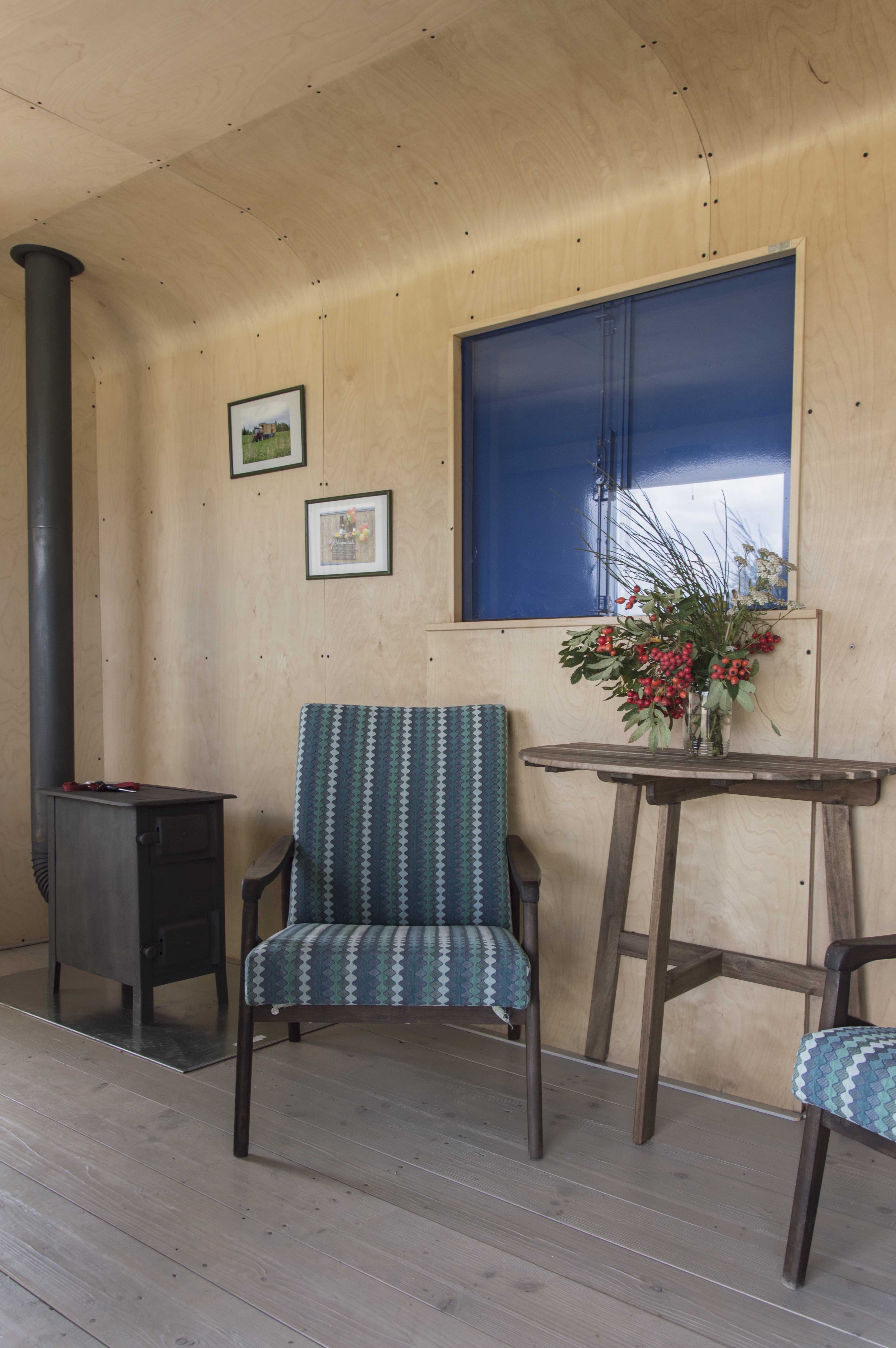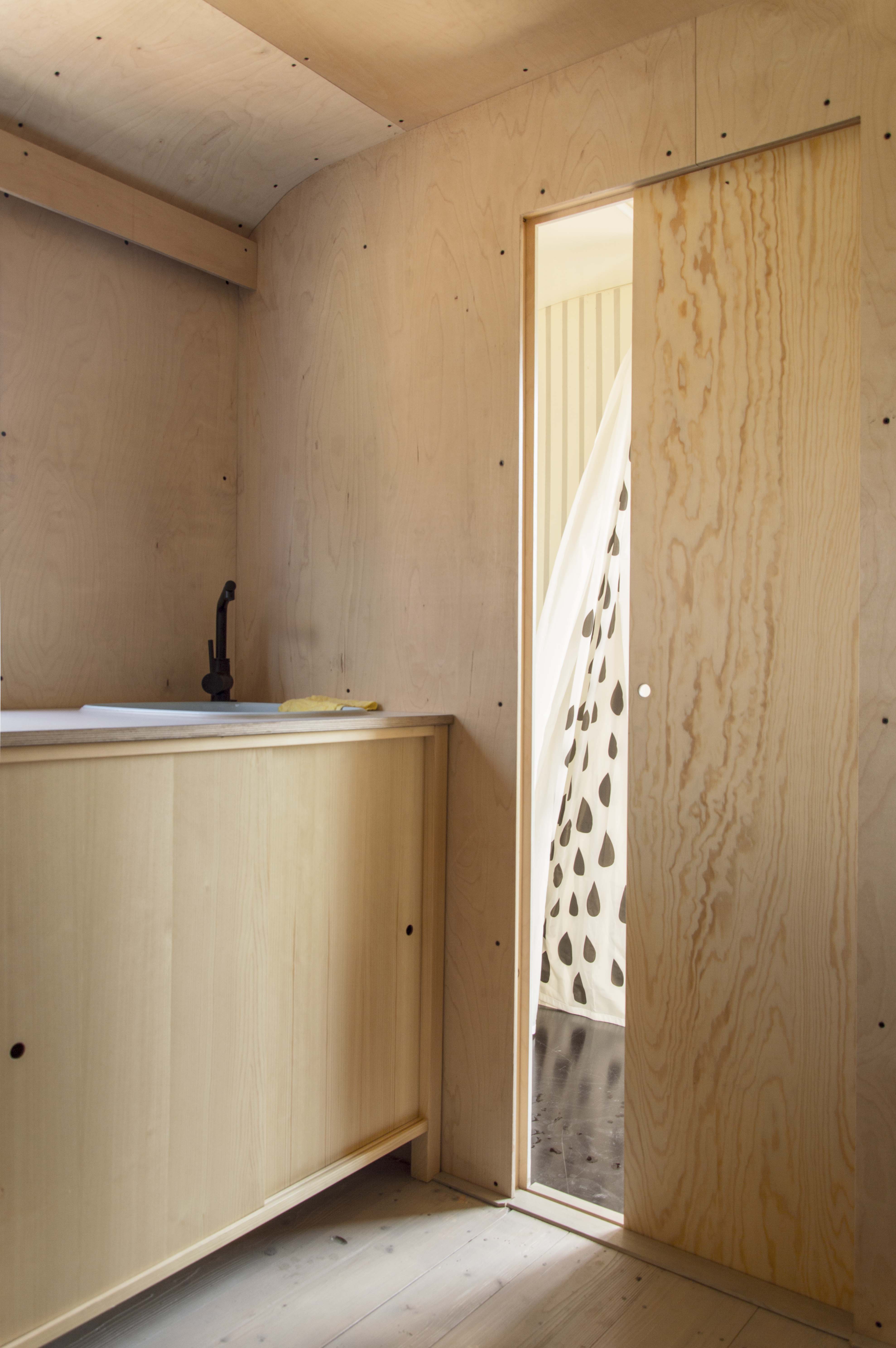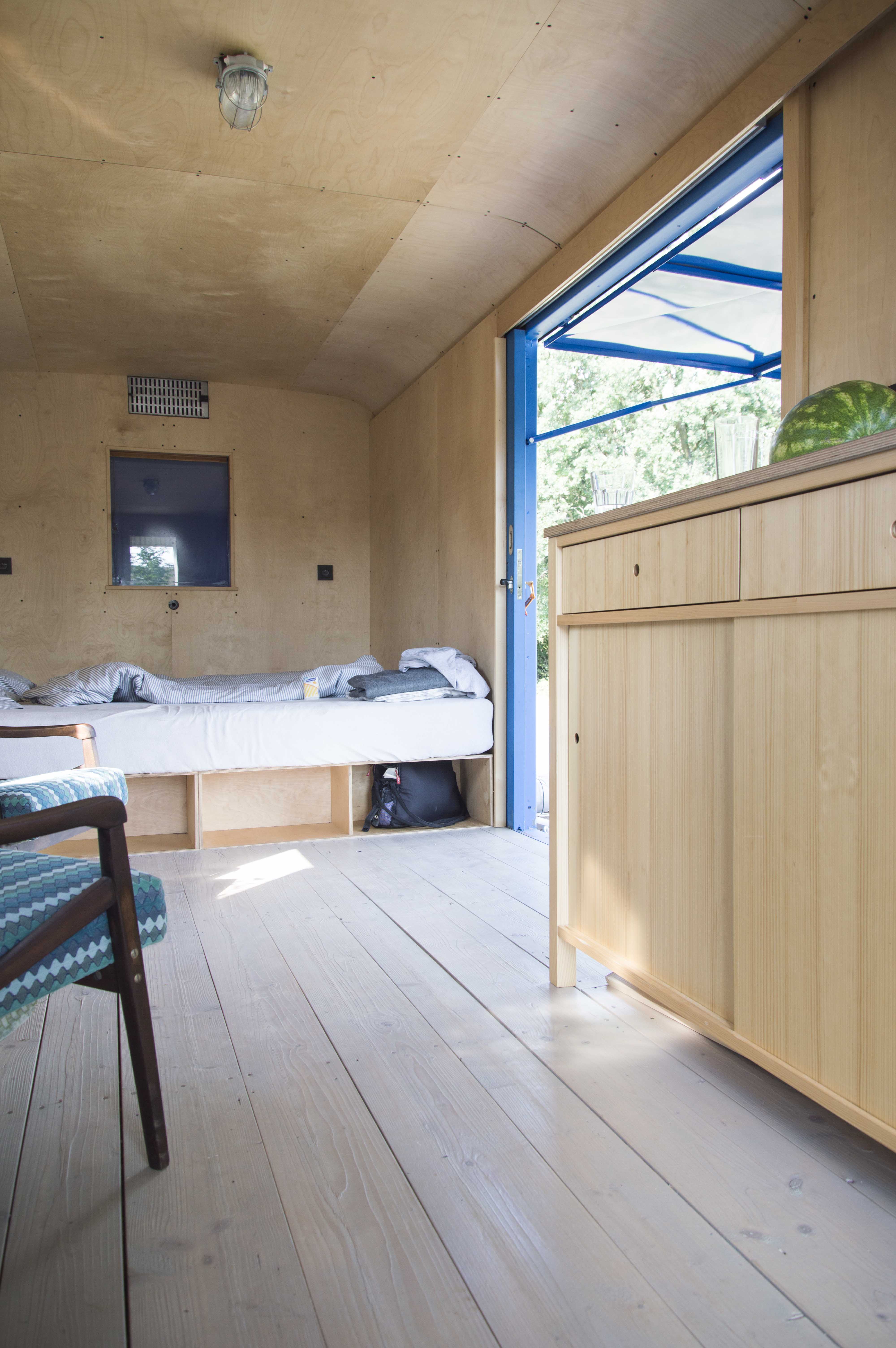 Na vnitřní obložení a vestavěný nábytek je použita přírodní překližka. Podlaha je ze starých recyklovaných prken, které byly opatřeny transparentním lakem s šedým tónováním.