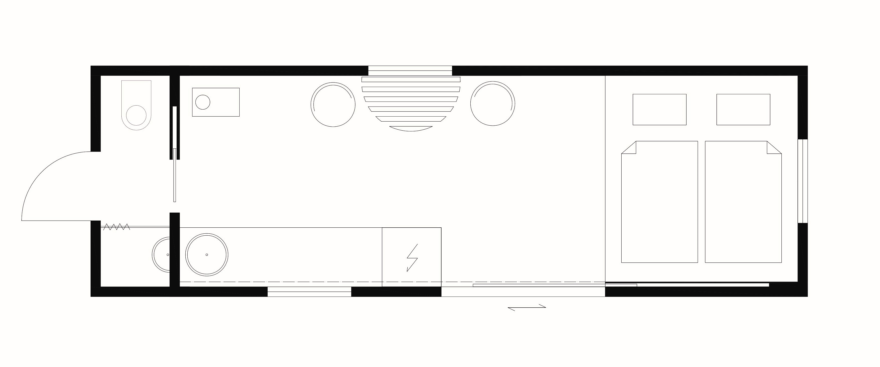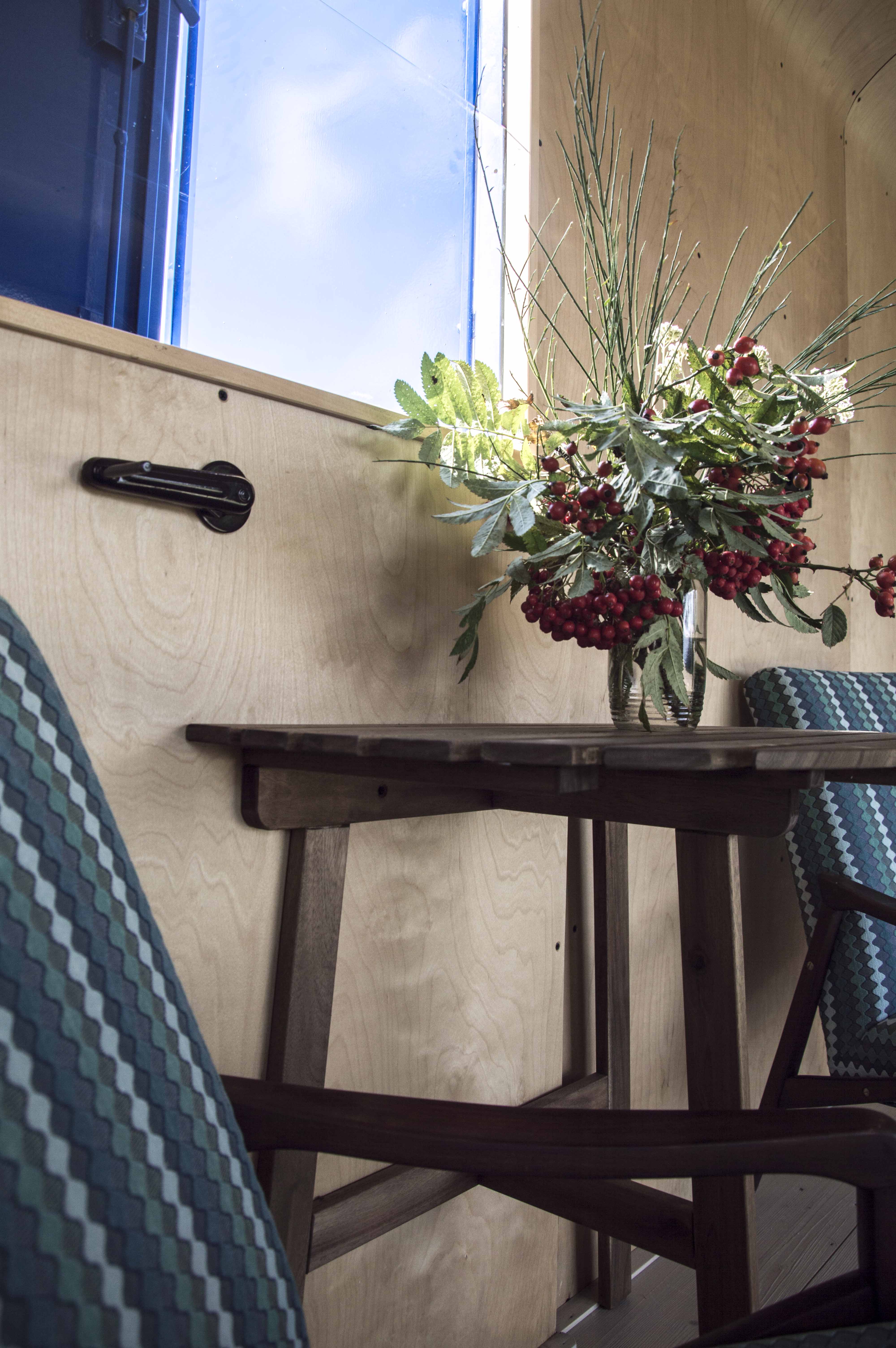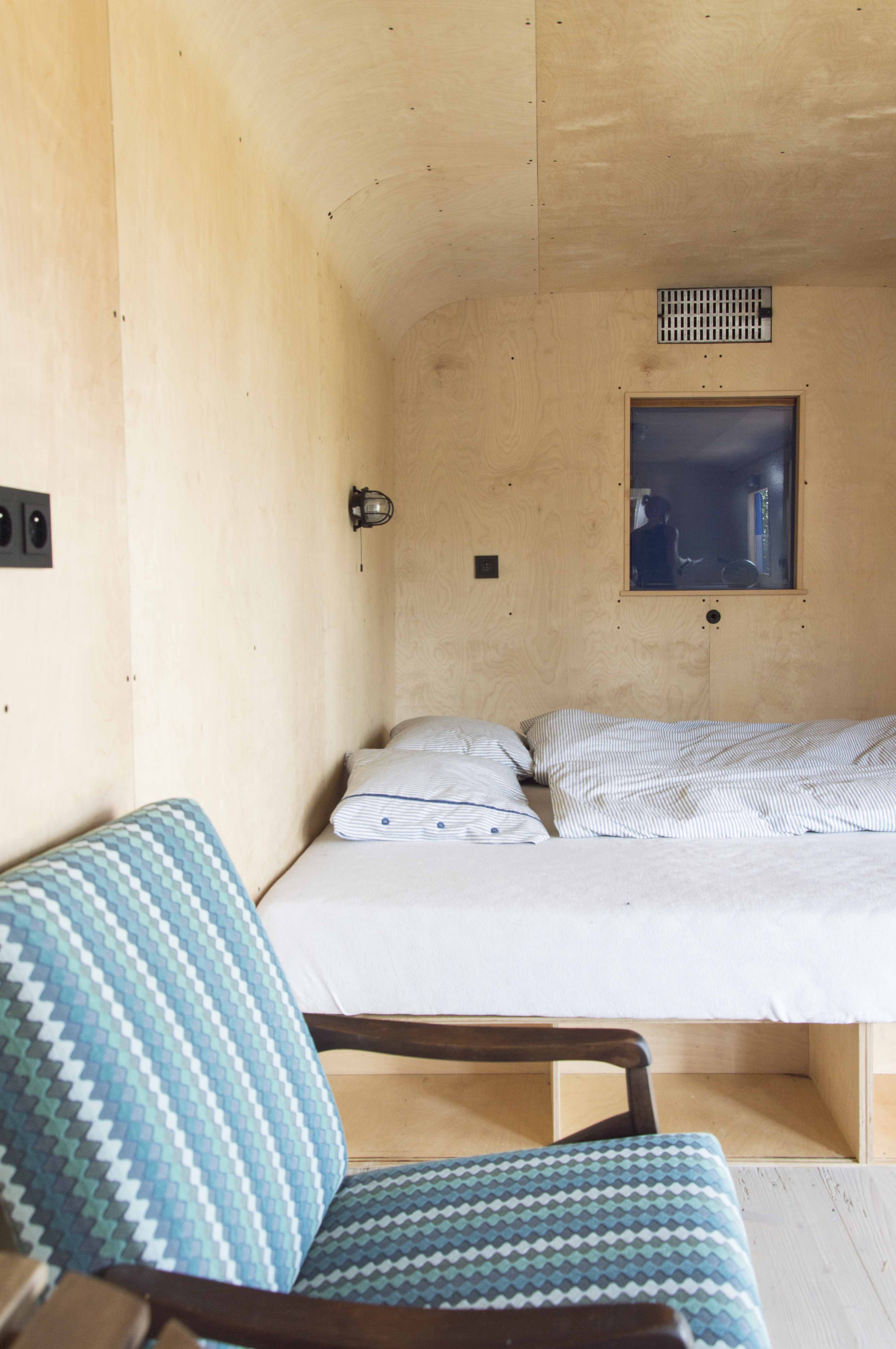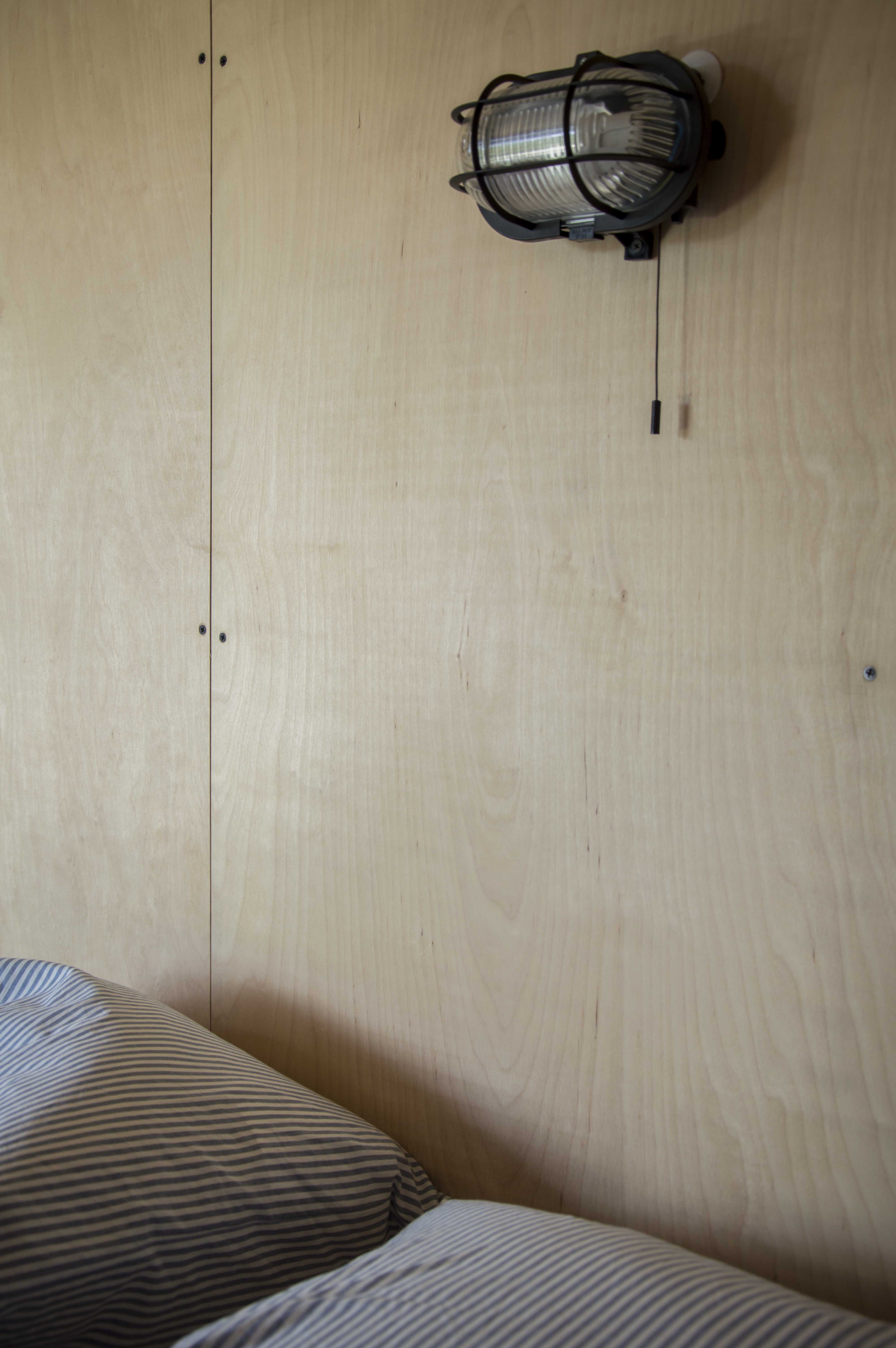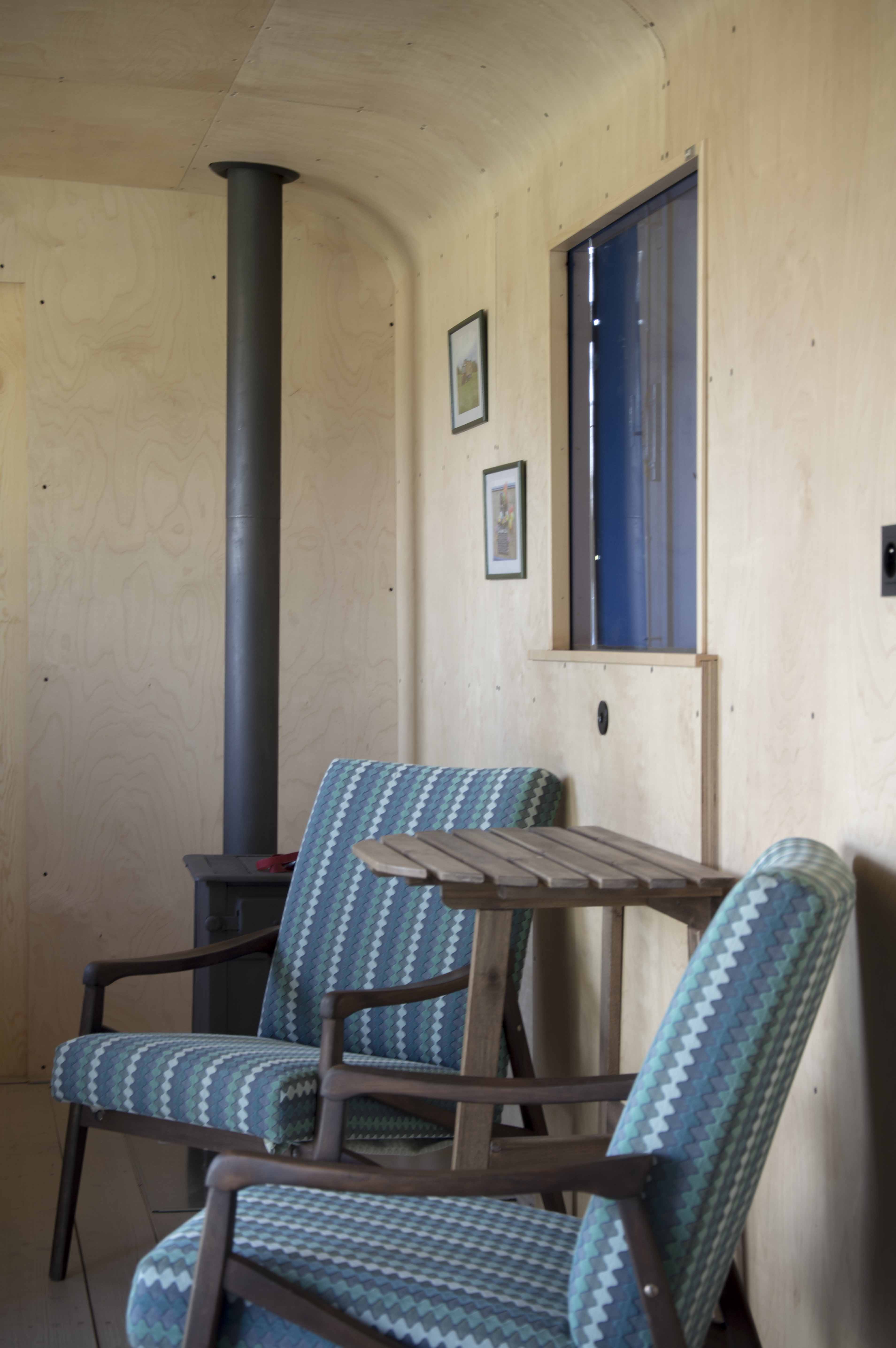 Na vnitřní obložení a vestavěný nábytek je použita přírodní překližka. Podlaha je ze starých recyklovaných prken, které byly opatřeny transparentním lakem s šedým tónováním.