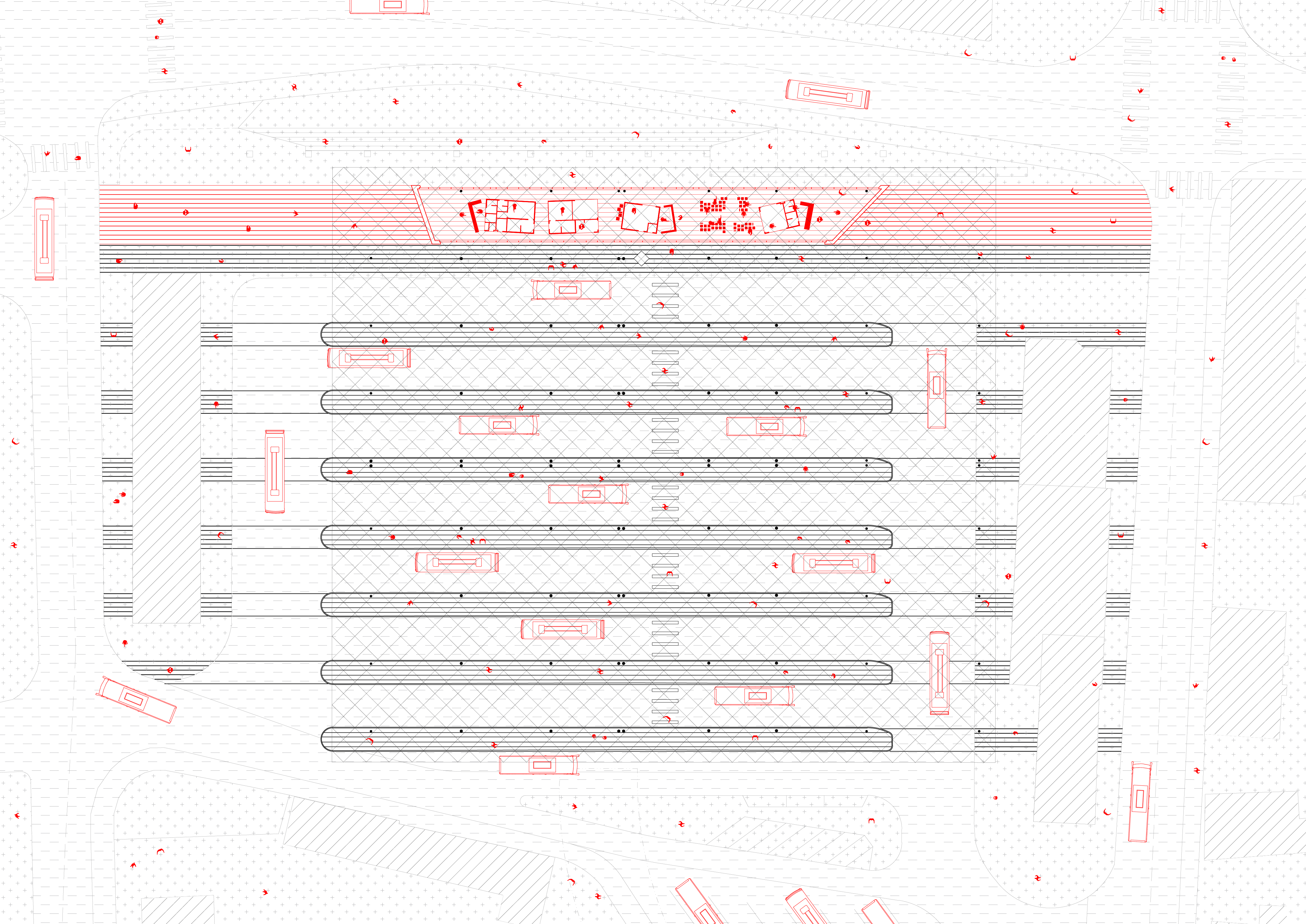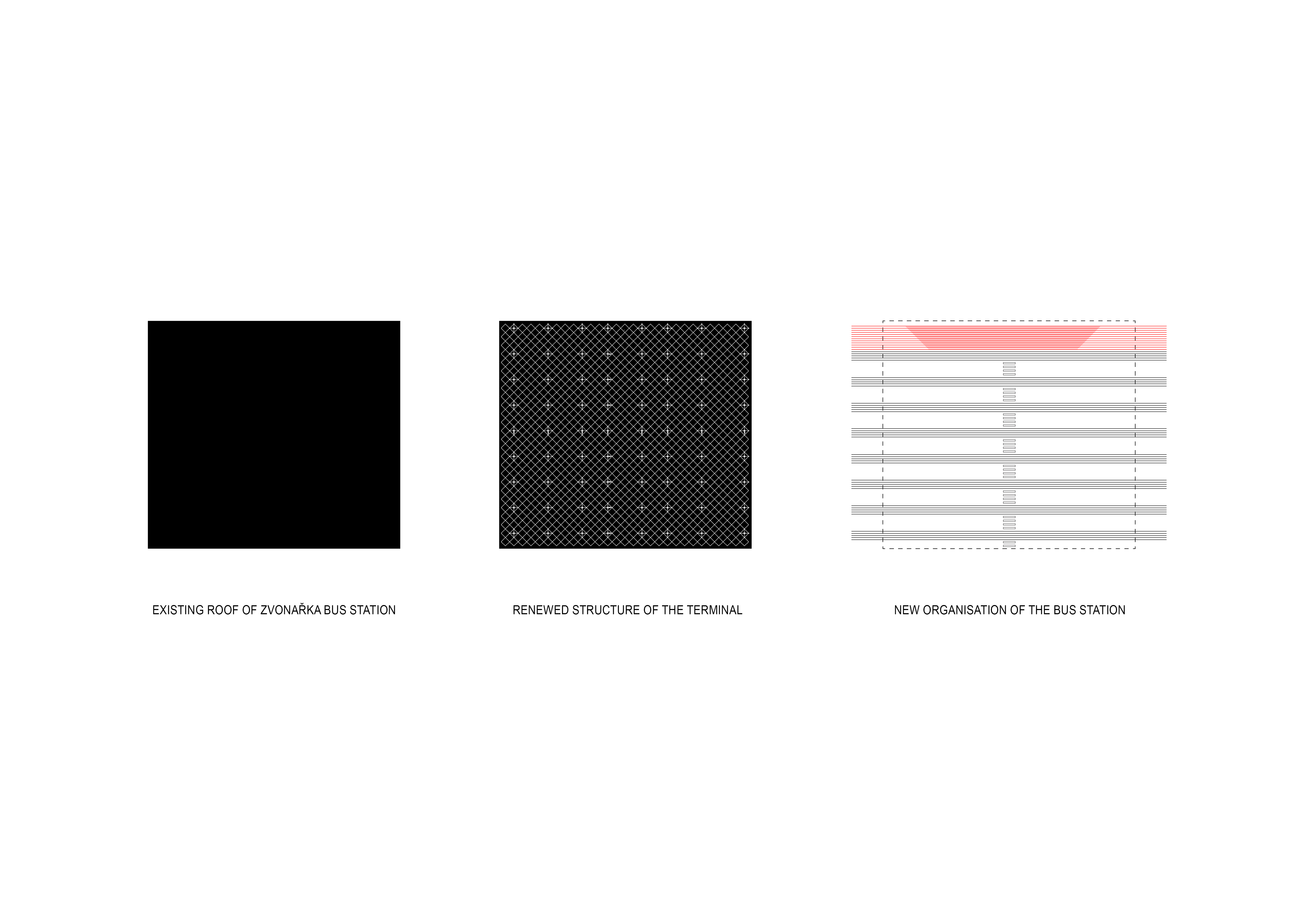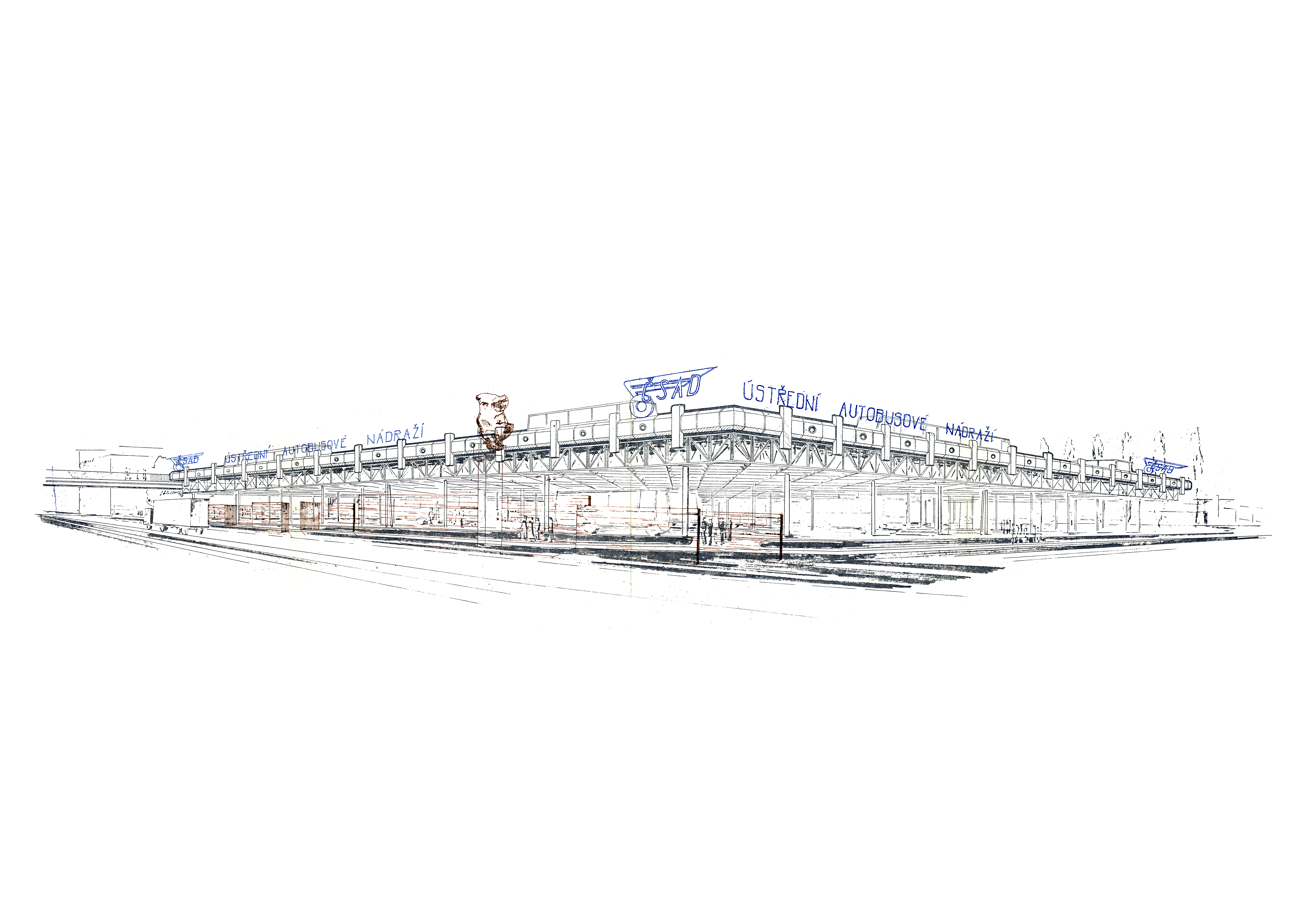 Autorom brutalistického prestrešenia pôvodne otvorených nástupíšť s rozmermi 100 x 100 metrov je konštruktér Radúz Russ. Ústrednú stavbu z 80. rokov tvorí oceľová priehradová konštrukcia, ktorá nesie betónovú dosku, lemovanú masívnou atikou z prefabrikovaných železobetónových dielcov. Tá kryje nástupišťa a zároveň slúži ako odstavná plocha pre 90 autobusov, ktorú na juhu sprístupňuje rampa. Nedostatočná údržba konštrukcie, betónových prvkov a vybavenia nástupíšť postupne viedla k potrebe obnovy autobusovej stanice a kultivácie jej bezprostredného okolia. Tej sa chopil práve ateliér Chybík+Krištof. Brutalistická stavba si zachovala svoj originálny charakter a slúži pôvodnému účelu.