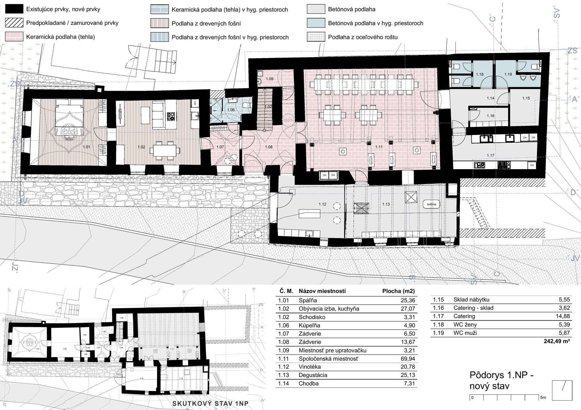 Na 1.N.P sú navrhnuté prevádzky vinotéky a flexibilného priestoru mlynice na využitie verejnosťou, s prístupom do kanála. Využíva sa aj priestor pred predajňou vína v strojovni.