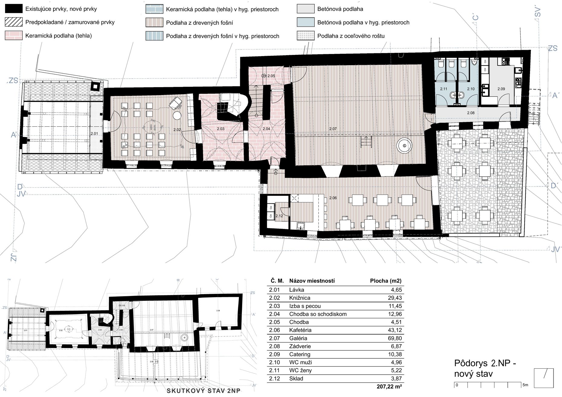 Na 2.N.P. sú navrhnuté poloverejné prevádzky, súvisiace s uzavretejším typom spoločnosti v knihovni s príležitostným čítaním a uzavreté spoločnosti v mlynici, napojenej na priestor pre catering. Samostatnú prevádzku predstavuje kaviareň, využívajúca v letných mesiacoch aj sedenie na dvore.